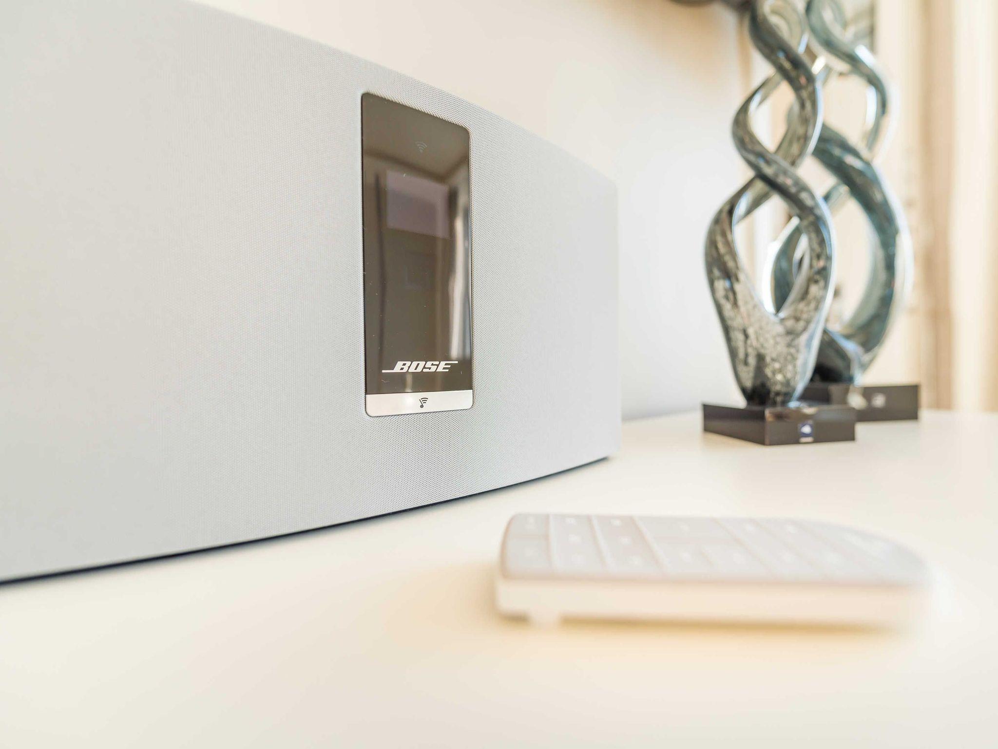 Im Wohnzimmer erwartet Sie eine Echtledercouch über Eck, ein moderner Glascouchtisch, Relaxsessel mit Fußhocker, eine elegante, dimmbare Bogenlampe sowie eine beleuchtete Anrichte und eine Vitrine, ein 48“TV an 180° Schwenkarm und ein Bose-Internetradio.