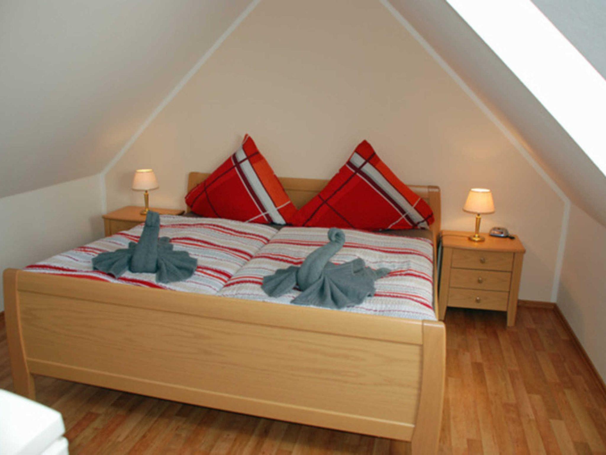 Über eine Holztreppe gelangt man in das im Dachgeschoss liegende Schlafzimmer. Hier steht ein bequemes Doppelbett mit Nachttischen und Leselampen.