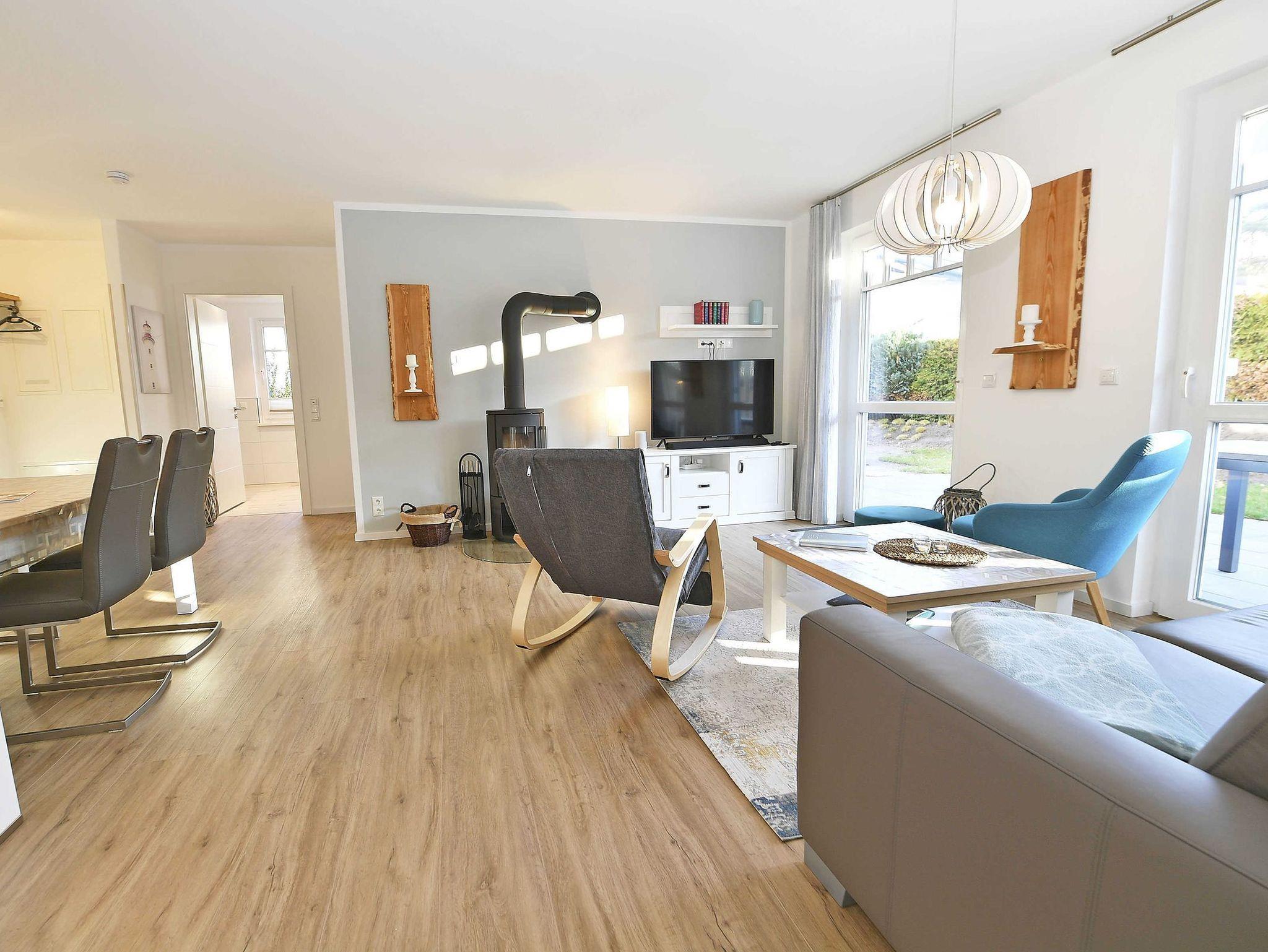 Im 34 m² großen kombinierten Wohn- und Essbereich befinden sich eine behagliche Sitzecke, sowie eine moderne Einbauküche mit Kochinsel. An dem großen Esstisch finden bis zu 5 Personen Platz. Ein Kamin sorgt für Gemütlichkeit.