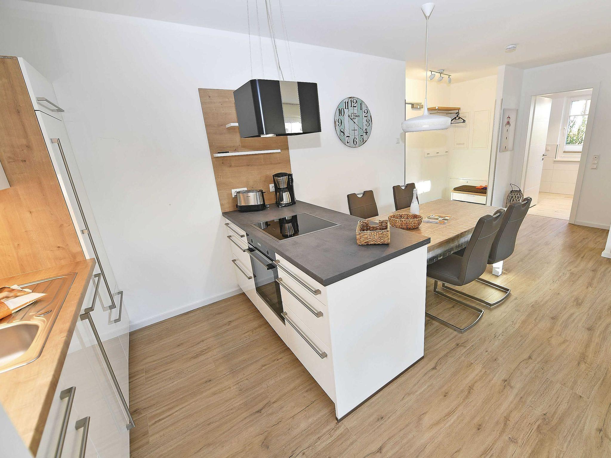 Die perfekt in den Wohnbereich integrierte Küchenzeile ist komplett ausgestattet mit einem Backofen, einer Geschirrspülmaschine, einer Mikrowelle auf Augenhöhe, einem Kühlschrank mit Gefrierfach, Kaffeemaschine, Toaster, Wasserkocher, weiteren Kochutensilien und einer Kochinsel mit einem 4-Platten-Induktionskochfeld.