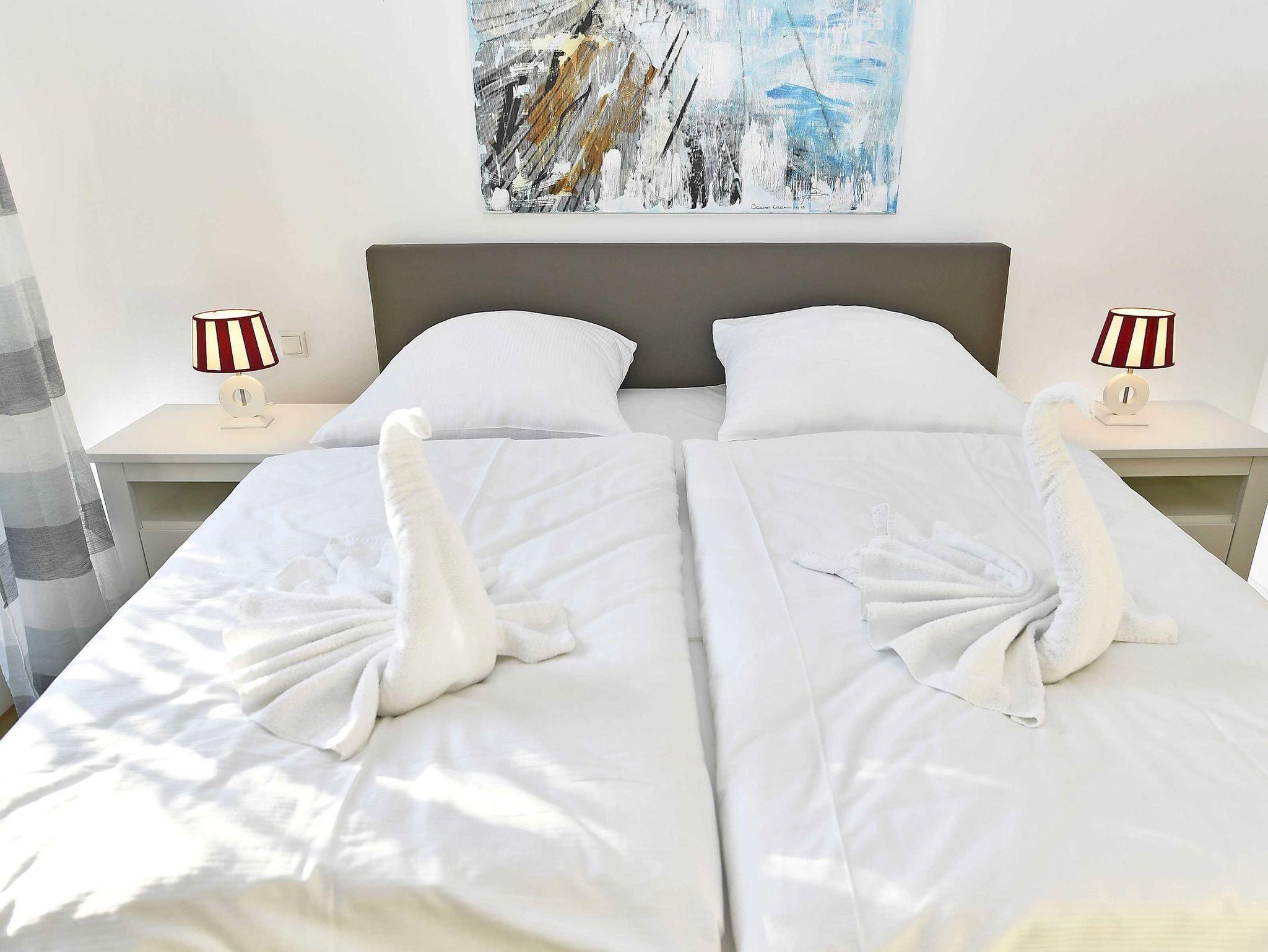 Die Erdgeschosswohnung verfügt über zwei separate Schlafzimmer jeweils mit einem Boxspringbett 180 x 200 cm (allergikerfreundlich) und genügend Stauraum für Ihre Garderobe, sowie in jedem Schlafzimmer einen Flachbild TV.