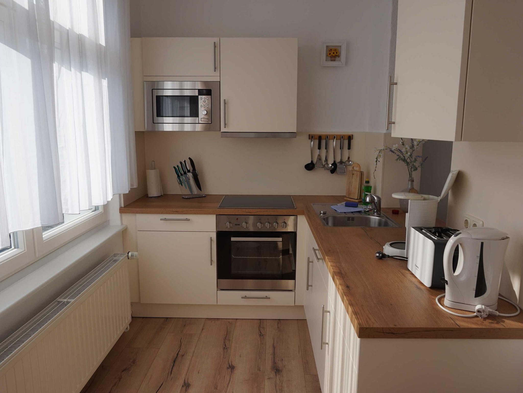 Wohnküche mit ca 22m² -Doppelliege (1,80x2,00), Kleiderschrank,Sitzgruppe für 2 Pers. Einbauküche mit Cerankochfeld, Backofen, Geschirrspüler, Mikrowelle und Kühlschrank. Kaffeemaschine, Wasserkocher, Toaster, Geschirr, Radio, Flachbild-TV. Flur 3m² u. Duschbad/WC 4m².