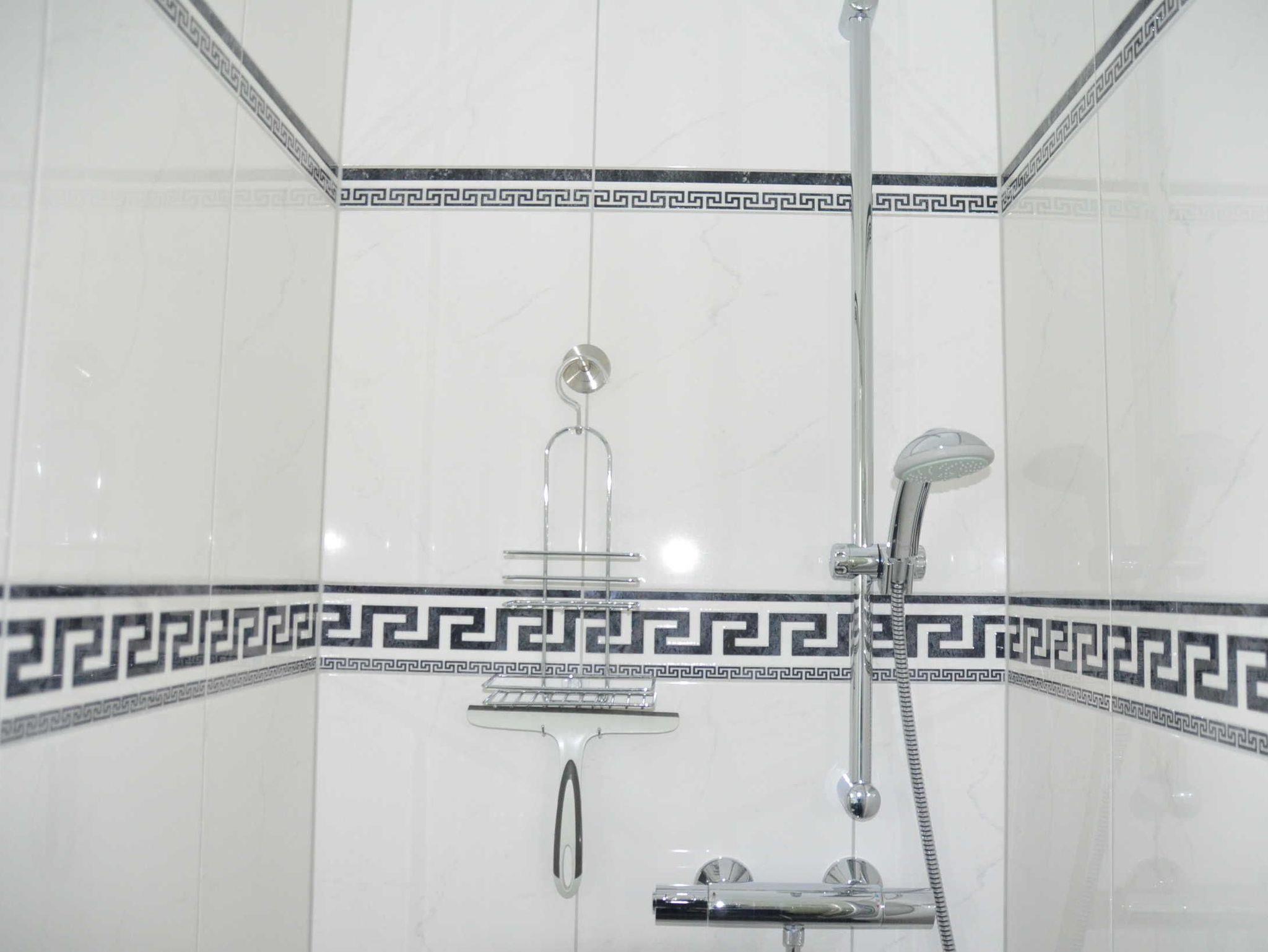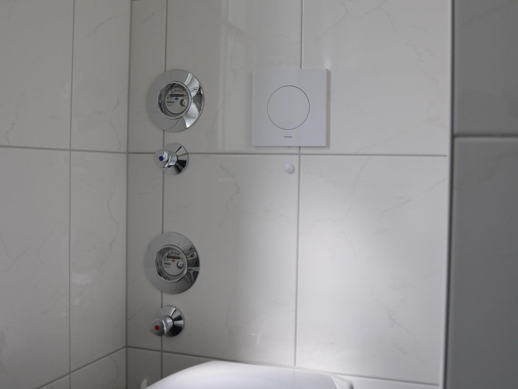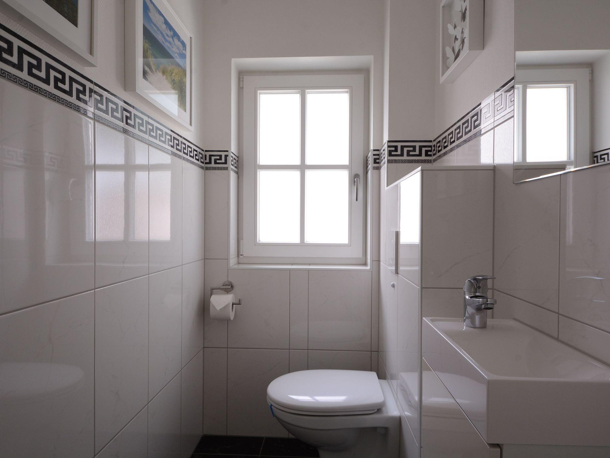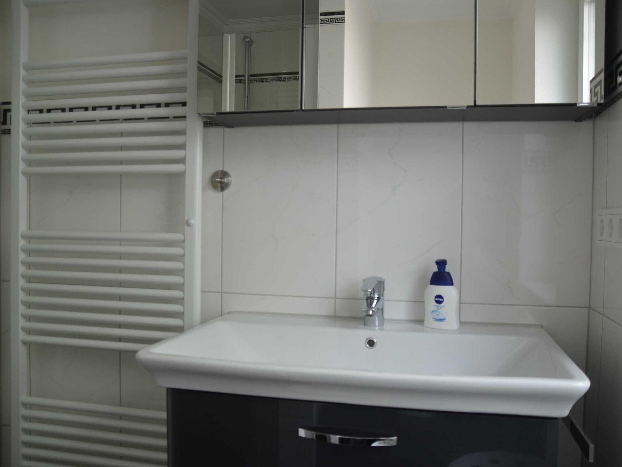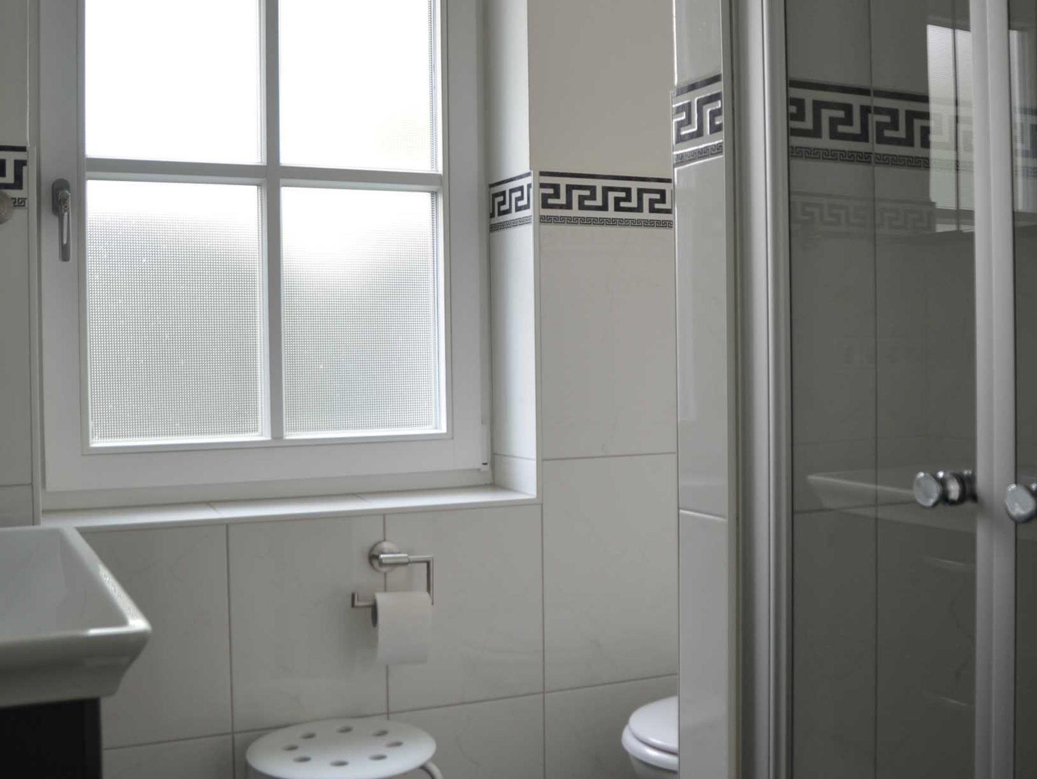 Das Tageslicht-Duschbad im Erdgeschoss mit bodengleicher Duschwanne und großem Fenster ist geschmackvoll und hochwertig gefliest, mit einem Handtuchtrockner, Föhn und mit umfangreichen Unterbringungsmöglichkeiten für Ihre Utensilien ausgestattet.