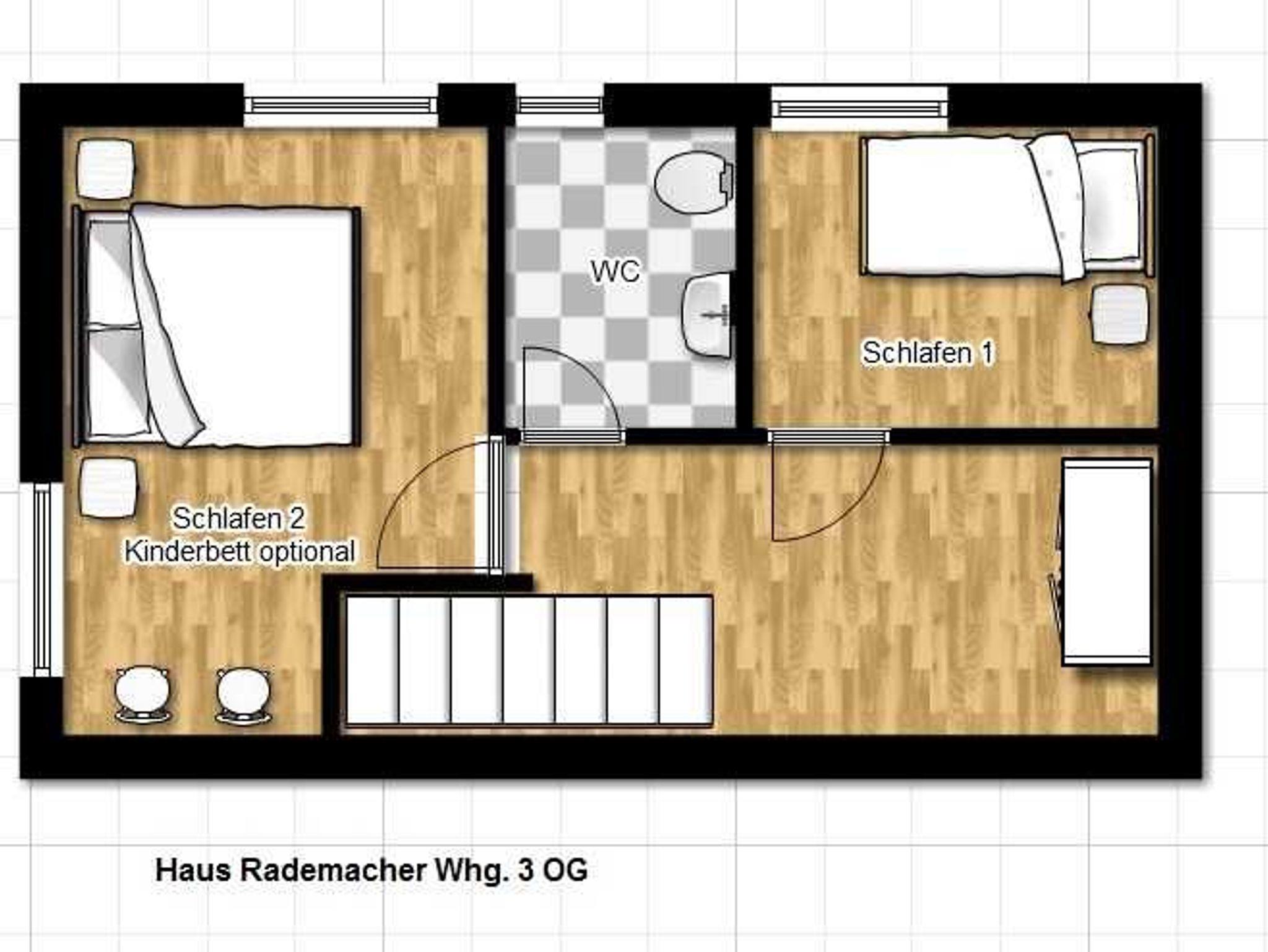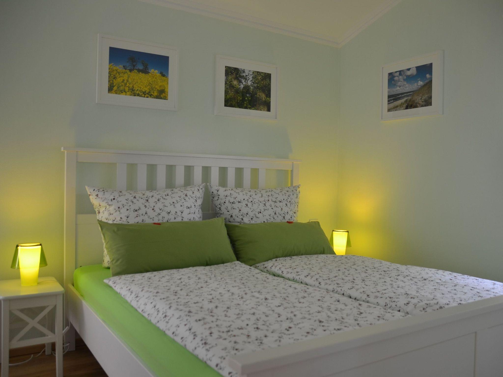 Ein Schlafzimmer verfügt über ein Doppelbett 1,60m x 2,00m und ist mit speziellen Verdunkelung-Rollos und einem weiteren HD-Fernsehgerät ausgestattet. Im zweiten Schlafzimmer, ebenfalls mit Verdunklungsrollo und kleinerem HD-Fernseher befindet sich ein Einzelbett. Beide Schlafzimmer befinden sich im Obergeschoss und werden durch ein separates WC mit Waschgelegenheit ergänzt.