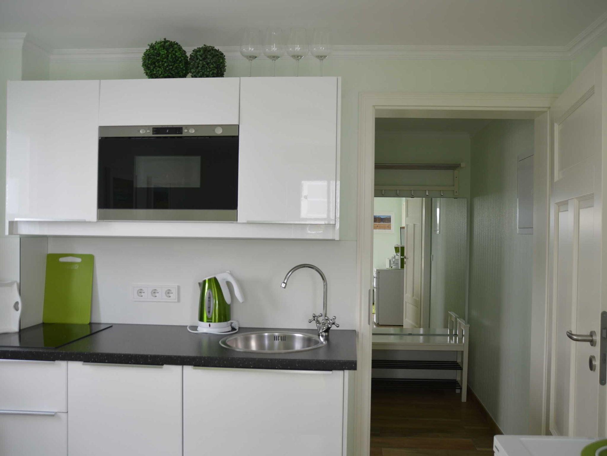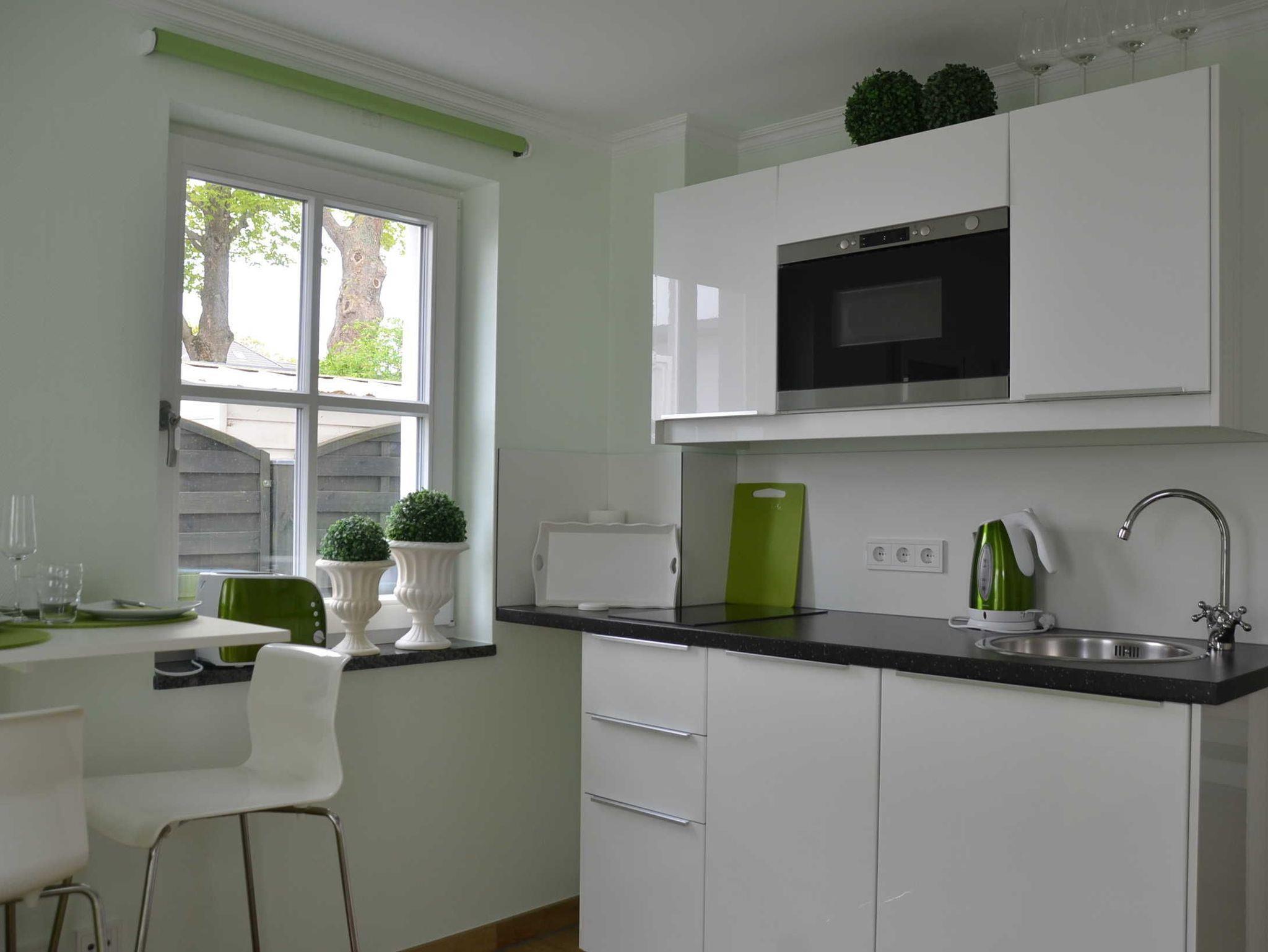 Die Kücheneinrichtung ist Bestandteil einer Wohnküche. Hier werden Ihnen alle Annehmlichkeiten einer komfortablen Selbstversorgung geboten: Kühlschrank mit Gefrierfach, 2-fach Ceranfeld, Geschirrspüler, Mikrowelle, Kaffeemaschine, Toaster, Ninja Airfryer, Wasser- und Eierkocher. Geschirr, Gläser, Bestecke und „Küchenwerkzeuge“ sind reichlich vorhanden.