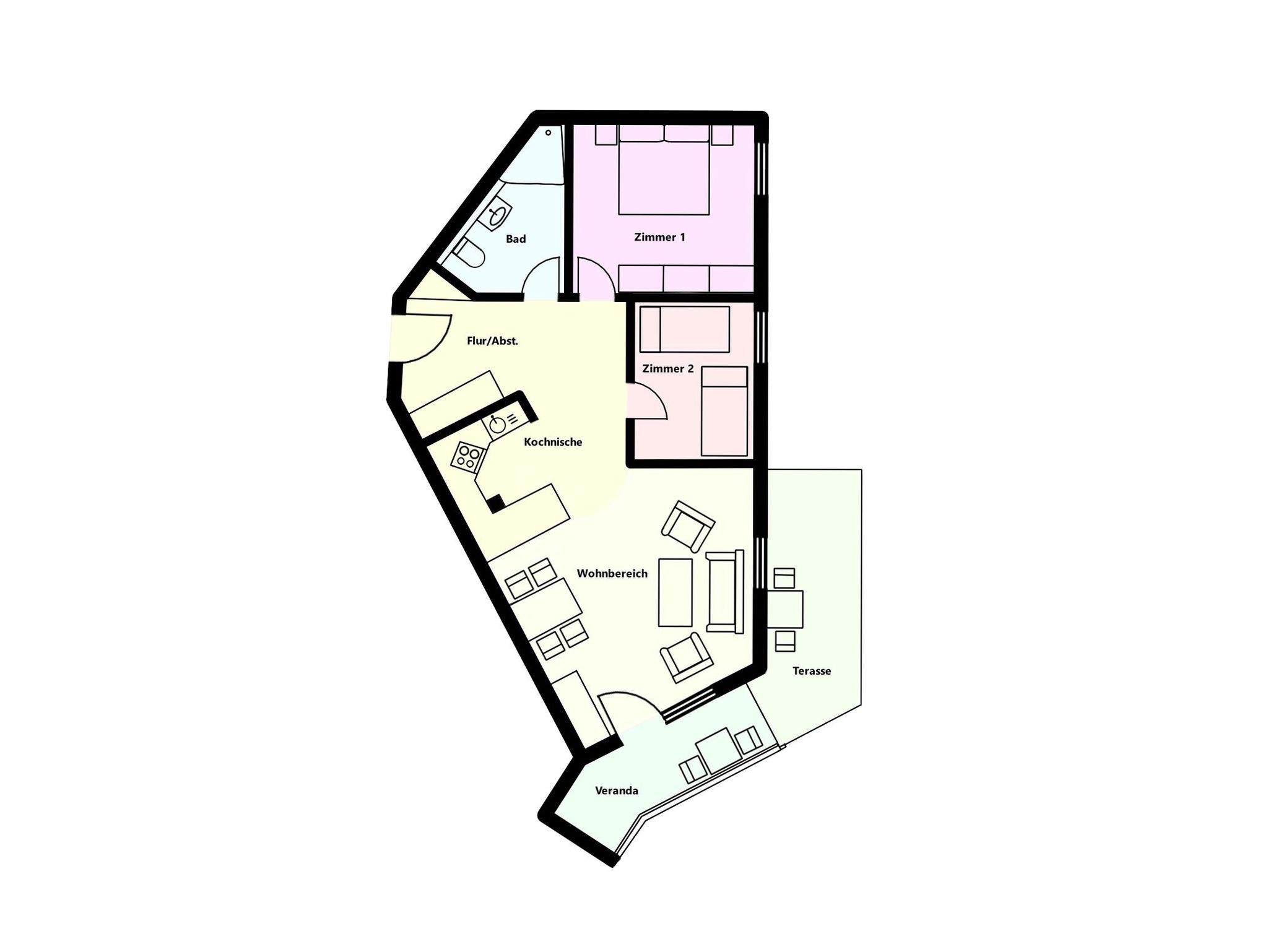 Die geschmackvoll eingerichtete Ferienwohnung besteht aus einem Wohnbereich mit Küchenzeile, zwei separaten Schlafzimmern, Duschbad sowie einem Wintergarten mit anschließender Terrasse.