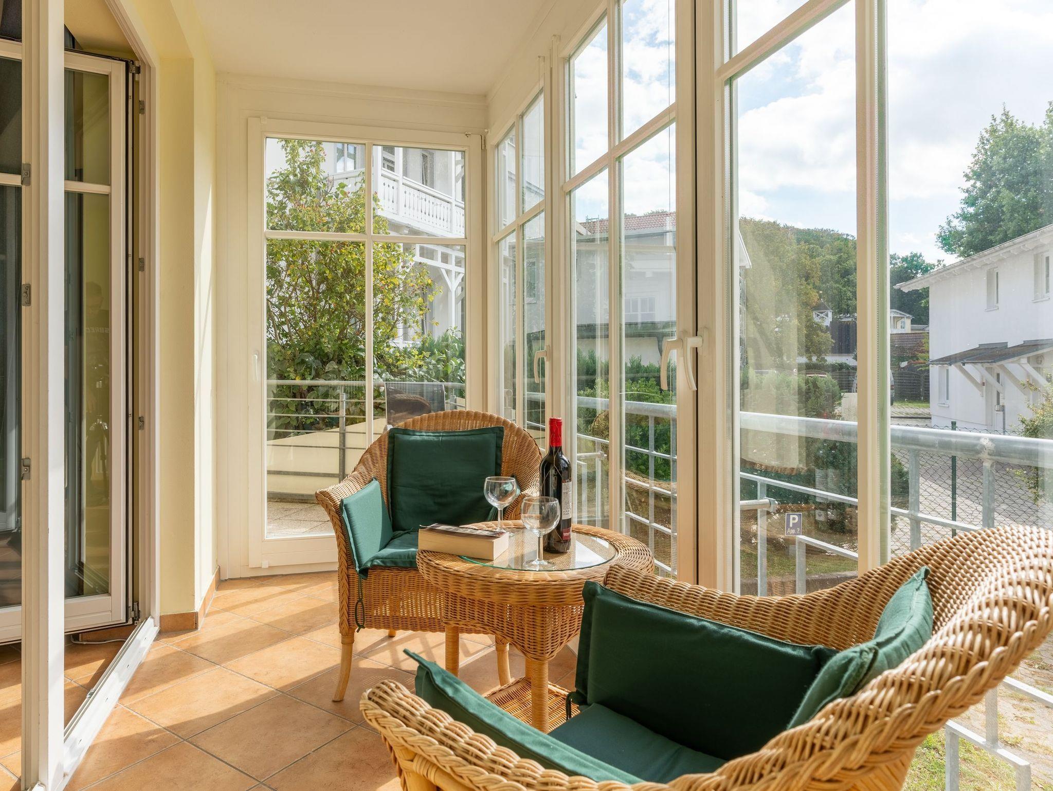 Der möblierte Wintergarten und die Terrasse sind über den Wohnbereich erreichbar.