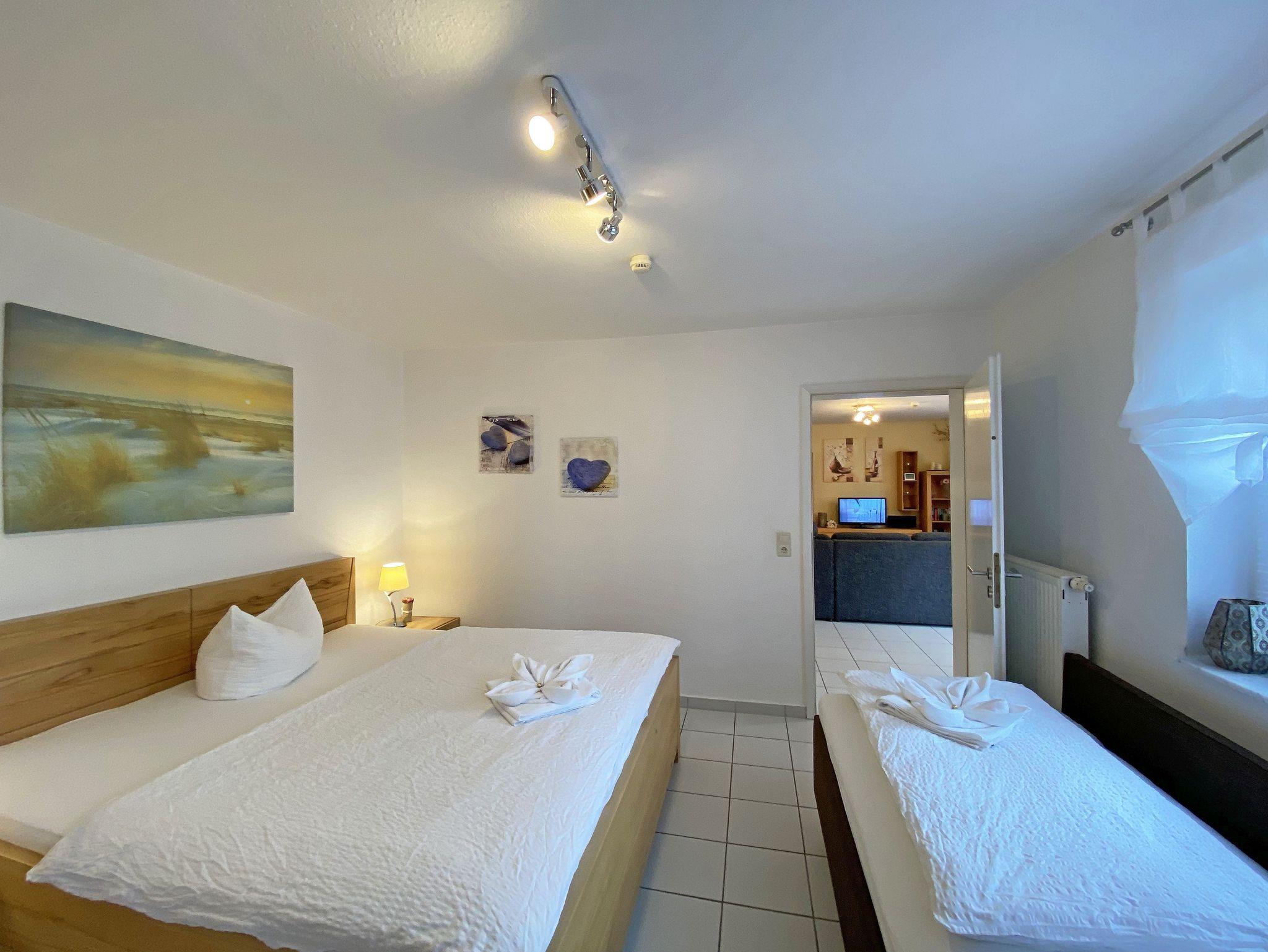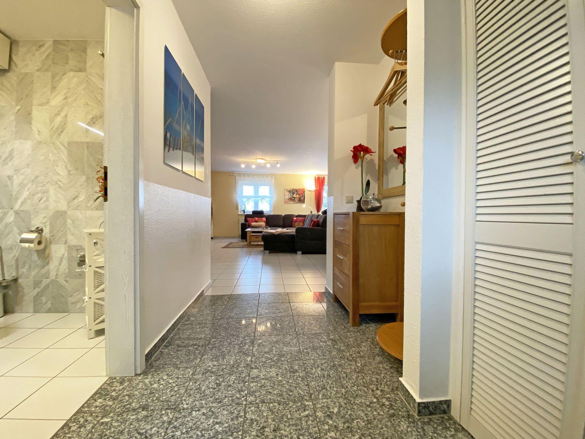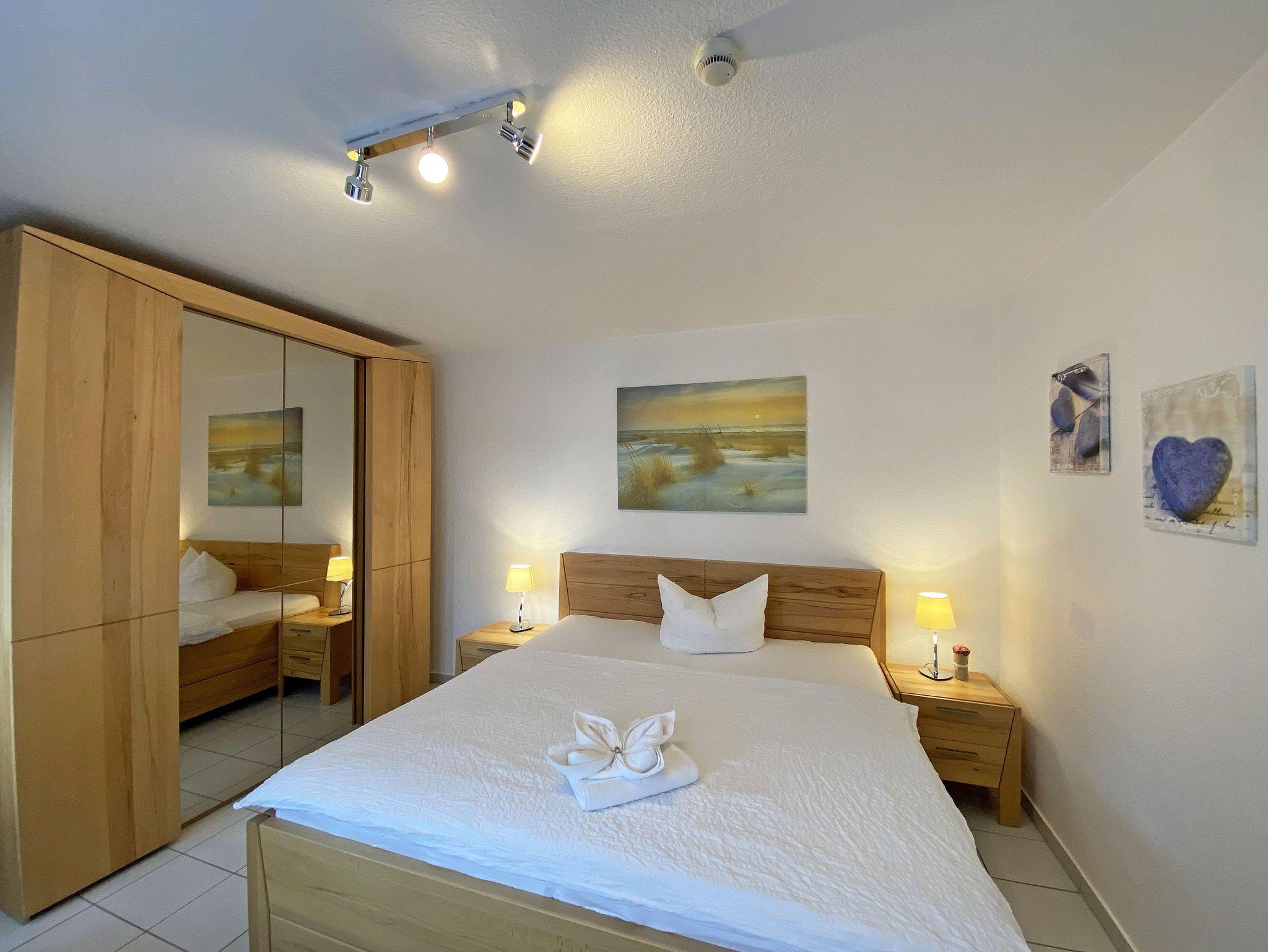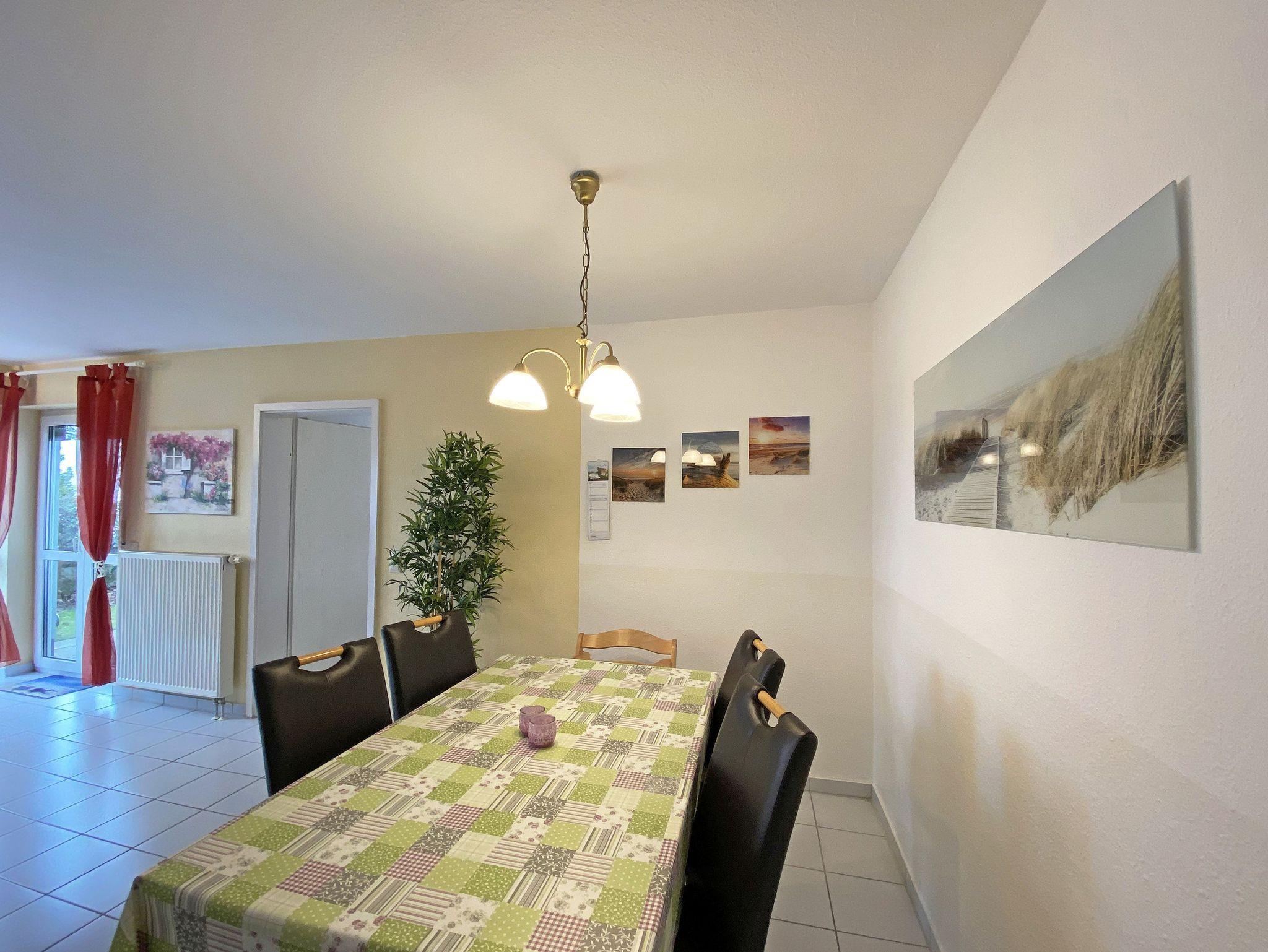 Die freundlich eingerichtete Nichtraucherwohnung umfasst ca. 68 qm und bietet Platz für 4 Erw. + 1 Kind bis 17 Jahre. Die 2 Raumwohnung im Erdgeschoss ist sehr großzügig geschnitten und verfügt über ein Schlafzimmer mit einem Doppelbett (á 0,90m x 1,90m), einem Einzelbett (0,90m x 1,90m), Nachttischkonsolen, Kleiderschrank sowie einen Zugang zur Terrasse. Im Wohn-/ Essbereich finden Sie eine Essecke mit zusätzlichen Stühlen sowie eine gemütliche Couchecke (mit Ausziehfunktion 1,40m x 2,10m), Tisch, Leselampe, Anrichte sowie Smart-TV und Blue- Ray-Player. Angrenzend haben Sie die komplett ausgestattete Küchenzeile mit Geschirrspüler, Kühlschrank + Eisfach, 4 Zonen-Ceranfeld mit Backofen, Kaffeemaschine, Tassimo Kapselmaschine, Toaster und Wasserkocher sowie diverse Küchenutensilien. Das Badezimmer mit Fenster ist komplett mit Marmorfliesen versehen und verfügt über eine Dusche mit flachem Einstieg, Waschtisch, Fön und WC. Die sonnige Terrasse, die Sie durch den Wohn- und Schlafbereich erreichen, lädt Sie ein Ihren Urlaubstag in Ruhe ausklingen zu lassen. Alle Räumlichkeiten sind gefliest und der Wohnbereich sowie das Schlafzimmer sind durch Außenrollos verdunkelbar. Ein kostenfreier WLAN- Zugang ist in der Wohnung vorhanden. Die Erstausstattung eines Wäschepaketes (komplette Bettwäsche, 1 Duschhandtuch, 1 kleines Handtuch) können Sie bis 14 Tage vor Anreise gegen einen Aufpreis dazu buchen oder durch eigene ergänzen. Ab 2 gebuchten Paketen erhalten Sie einmalig 1 Geschirrhandtuch und 1 Duschvorleger hinzu. Ein PKW-Stellplatz gehört zu Ihrer Wohnung dazu. Die Nutzung einer Wallbox mit 11KW Ladeleistung ist nach Verfügbarkeit und Voranmeldung vor Ort möglich. Bedingungen und FAQ`s sind vor Ort einsehbar. In einem Gemeinschaftsraum können Sie gegen eine Gebühr Waschmaschine und Trockner nutzen. Für unsere kleinen Gäste steht ein Kinderhochstuhl sowie ein Kinderreisebett (ohne Matratze und Bett Inlett) inklusive zur Verfügung. Für Ihre mitgebrachten oder geliehenen Fahrräder steht ein kleiner Fahrradkeller zur Verfügung sowie zusätzlich teilweise überdachte Fahrradständer.