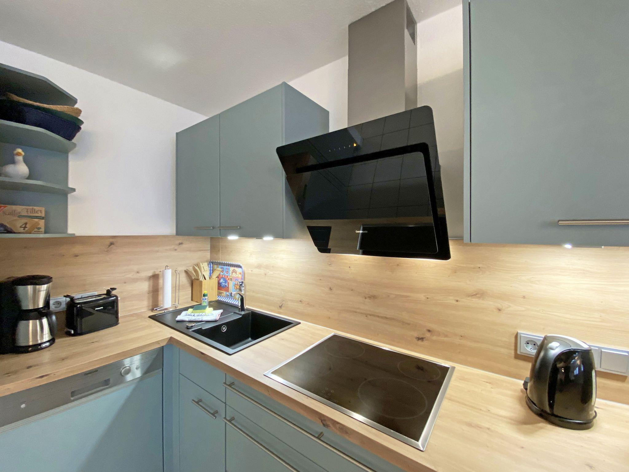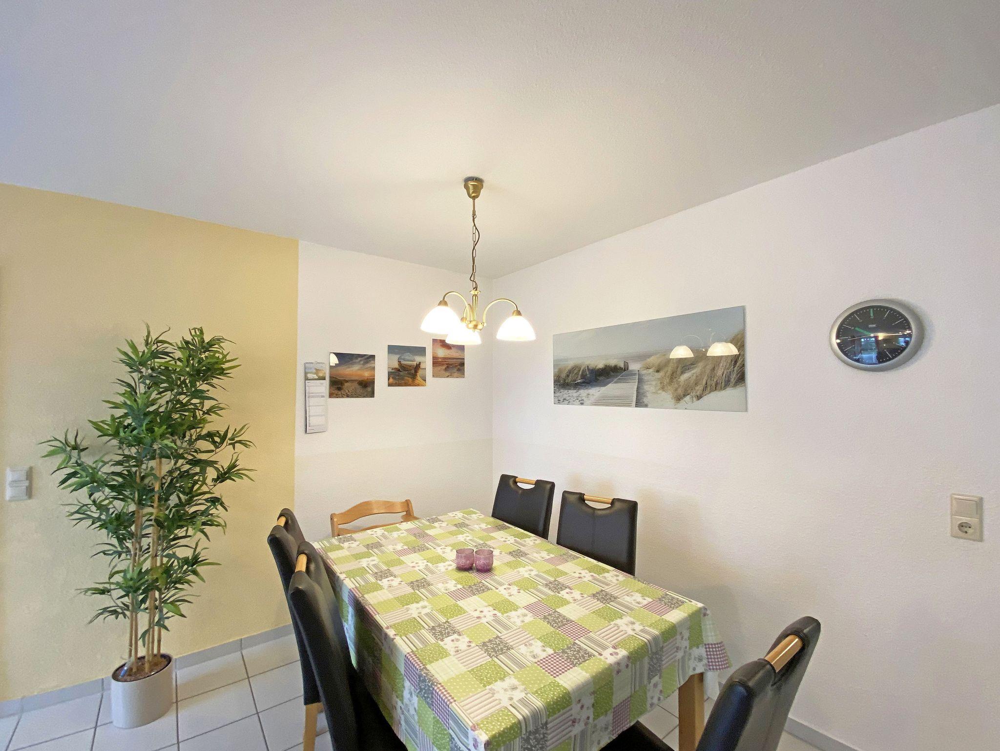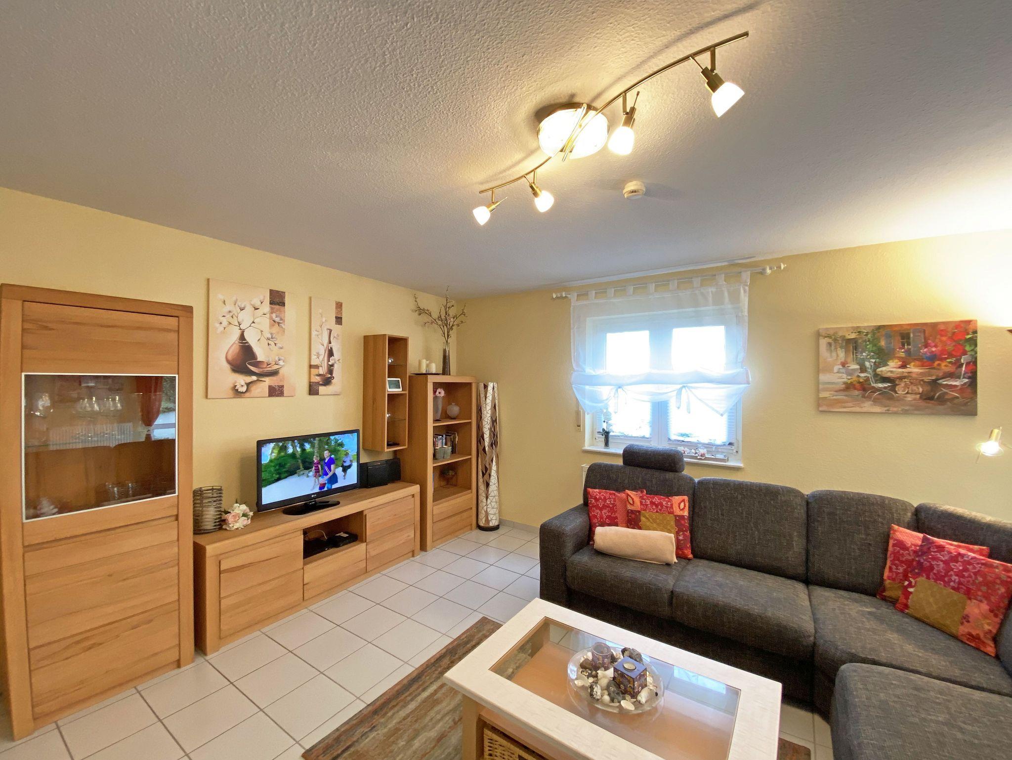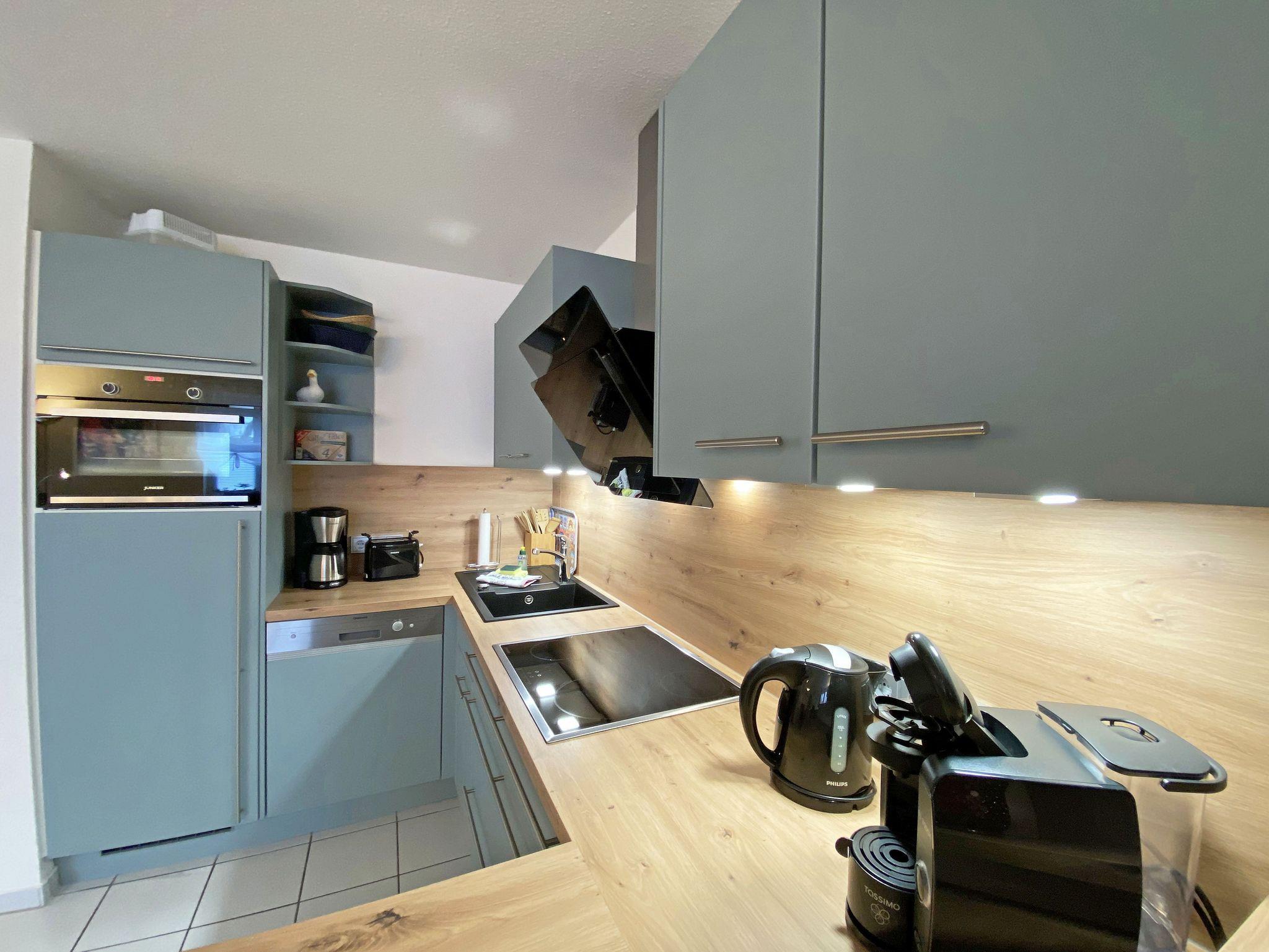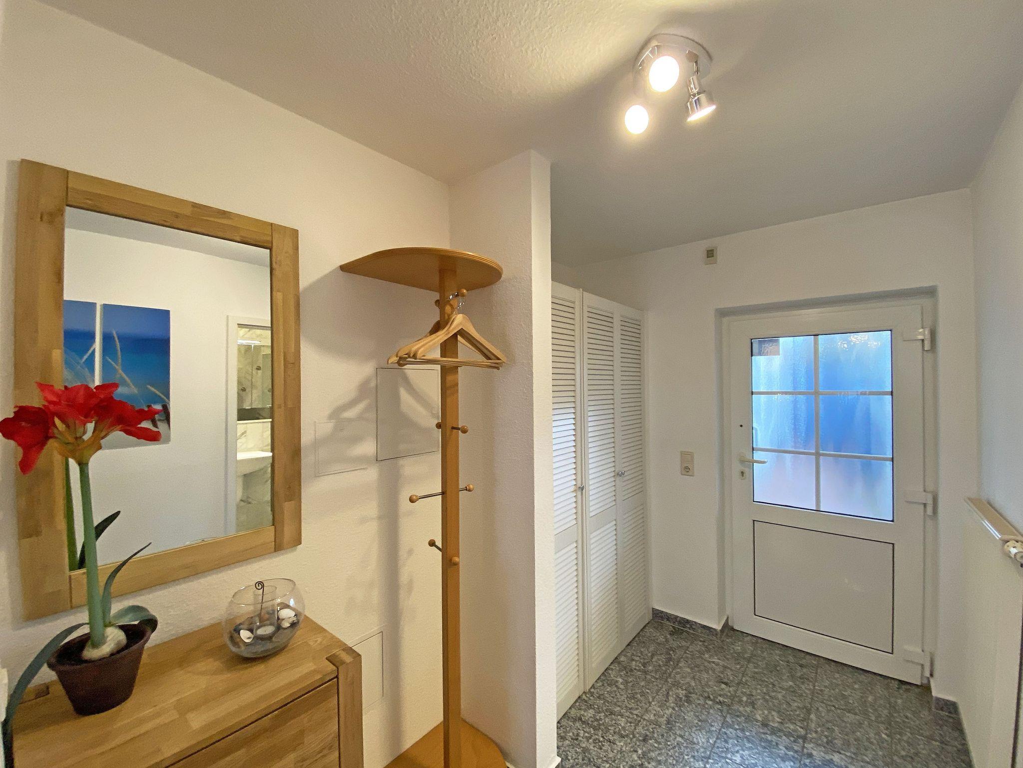 Die freundlich eingerichtete Nichtraucherwohnung umfasst ca. 68 qm und bietet Platz für 4 Erw. + 1 Kind bis 17 Jahre. Die 2 Raumwohnung im Erdgeschoss ist sehr großzügig geschnitten und verfügt über ein Schlafzimmer mit einem Doppelbett (á 0,90m x 1,90m), einem Einzelbett (0,90m x 1,90m), Nachttischkonsolen, Kleiderschrank sowie einen Zugang zur Terrasse. Im Wohn-/ Essbereich finden Sie eine Essecke mit zusätzlichen Stühlen sowie eine gemütliche Couchecke (mit Ausziehfunktion 1,40m x 2,10m), Tisch, Leselampe, Anrichte sowie Smart-TV und Blue- Ray-Player. Angrenzend haben Sie die komplett ausgestattete Küchenzeile mit Geschirrspüler, Kühlschrank + Eisfach, 4 Zonen-Ceranfeld mit Backofen, Kaffeemaschine, Tassimo Kapselmaschine, Toaster und Wasserkocher sowie diverse Küchenutensilien. Das Badezimmer mit Fenster ist komplett mit Marmorfliesen versehen und verfügt über eine Dusche mit flachem Einstieg, Waschtisch, Fön und WC. Die sonnige Terrasse, die Sie durch den Wohn- und Schlafbereich erreichen, lädt Sie ein Ihren Urlaubstag in Ruhe ausklingen zu lassen. Alle Räumlichkeiten sind gefliest und der Wohnbereich sowie das Schlafzimmer sind durch Außenrollos verdunkelbar. Ein kostenfreier WLAN- Zugang ist in der Wohnung vorhanden. Die Erstausstattung eines Wäschepaketes (komplette Bettwäsche, 1 Duschhandtuch, 1 kleines Handtuch) können Sie bis 14 Tage vor Anreise gegen einen Aufpreis dazu buchen oder durch eigene ergänzen. Ab 2 gebuchten Paketen erhalten Sie einmalig 1 Geschirrhandtuch und 1 Duschvorleger hinzu. Ein PKW-Stellplatz gehört zu Ihrer Wohnung dazu. Die Nutzung einer Wallbox mit 11KW Ladeleistung ist nach Verfügbarkeit und Voranmeldung vor Ort möglich. Bedingungen und FAQ`s sind vor Ort einsehbar. In einem Gemeinschaftsraum können Sie gegen eine Gebühr Waschmaschine und Trockner nutzen. Für unsere kleinen Gäste steht ein Kinderhochstuhl sowie ein Kinderreisebett (ohne Matratze und Bett Inlett) inklusive zur Verfügung. Für Ihre mitgebrachten oder geliehenen Fahrräder steht ein kleiner Fahrradkeller zur Verfügung sowie zusätzlich teilweise überdachte Fahrradständer.