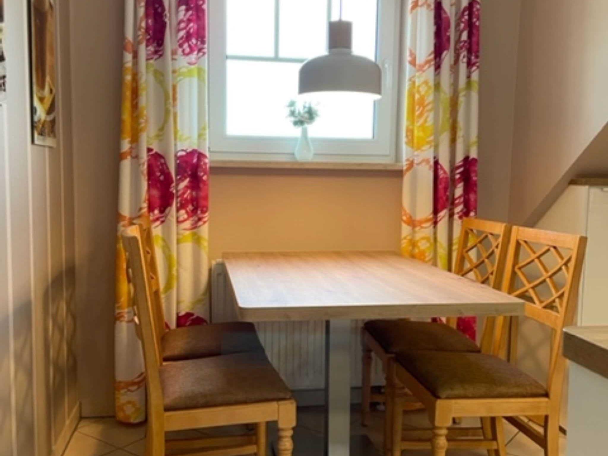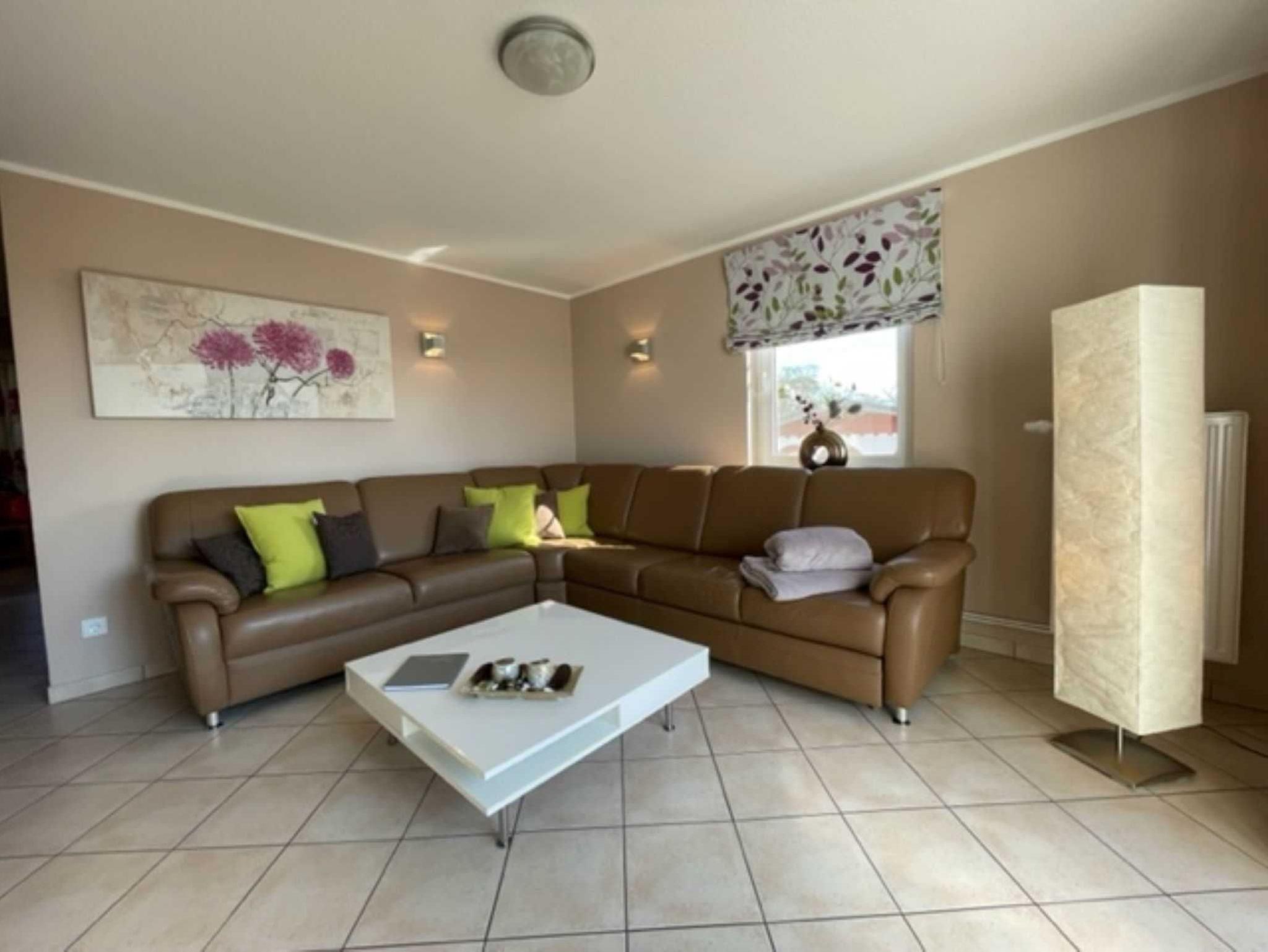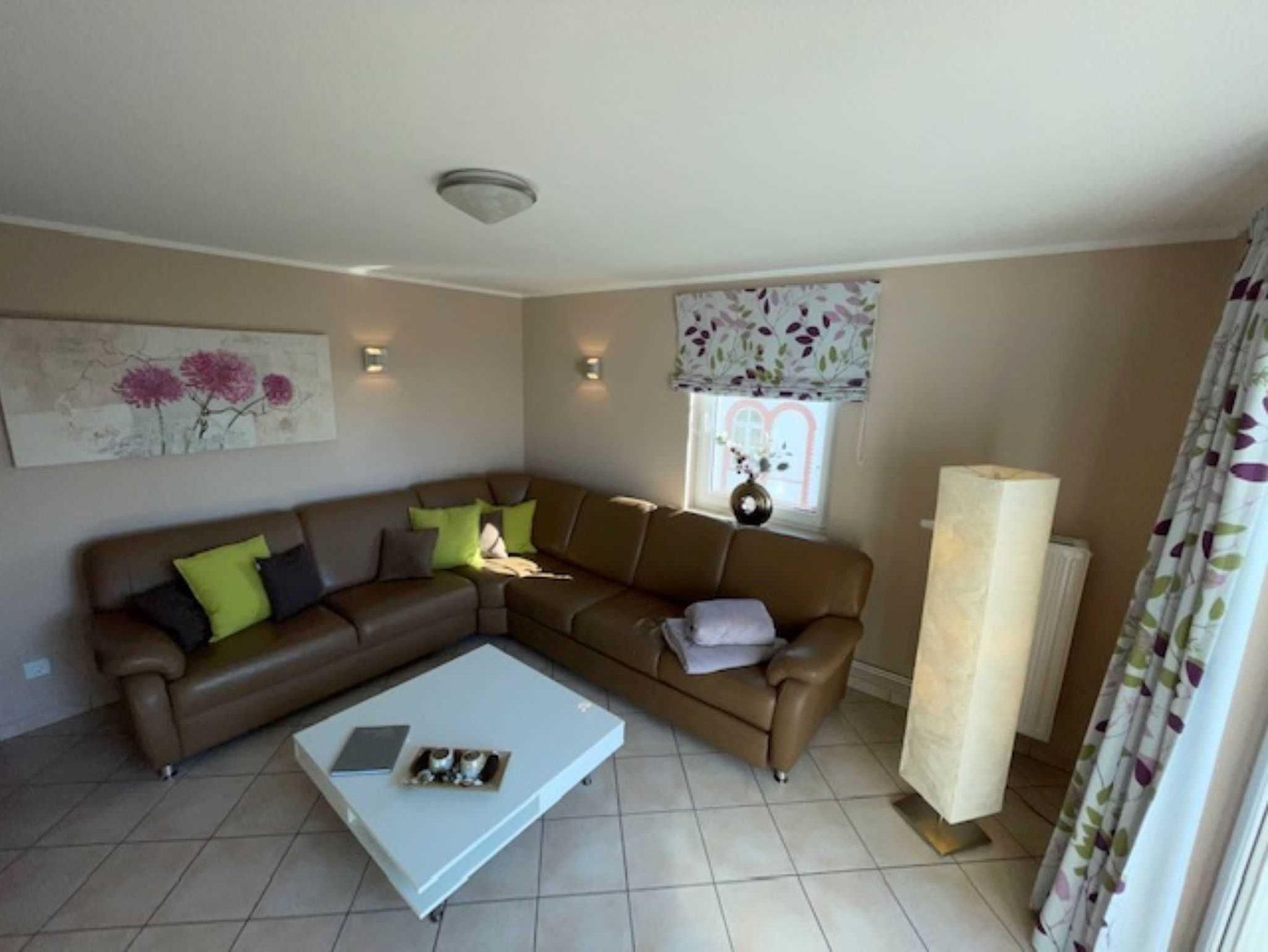 Das Ferienappartement befindet sich im 2. Obergeschoss eines Appartementhauses und ist auf 2 Etagen 69 qm groß. Es wurde modern und komfortabel eingerichtet und bietet maximal 6 Erwachsenen und einem Kind im Kinderreisebett Raum für einen erholsamen Urlaub. Über den Flur mit Garderobe gelangen Sie in den Wohnbereich. Im mediterran eingerichteten Wohnraum stehen eine Schlafcouch, Sessel und Tisch sowie Schränke, Radio und ein modernes Flachbild-TV. In der separaten Küchen stehen Ihnen ein Herd, Backofen, Spülmaschine, Mikrowelle, Kühlschrank, Toaster, Kaffeemaschine und Wasserkocher sowie ein Essplatz zur Verfügung.