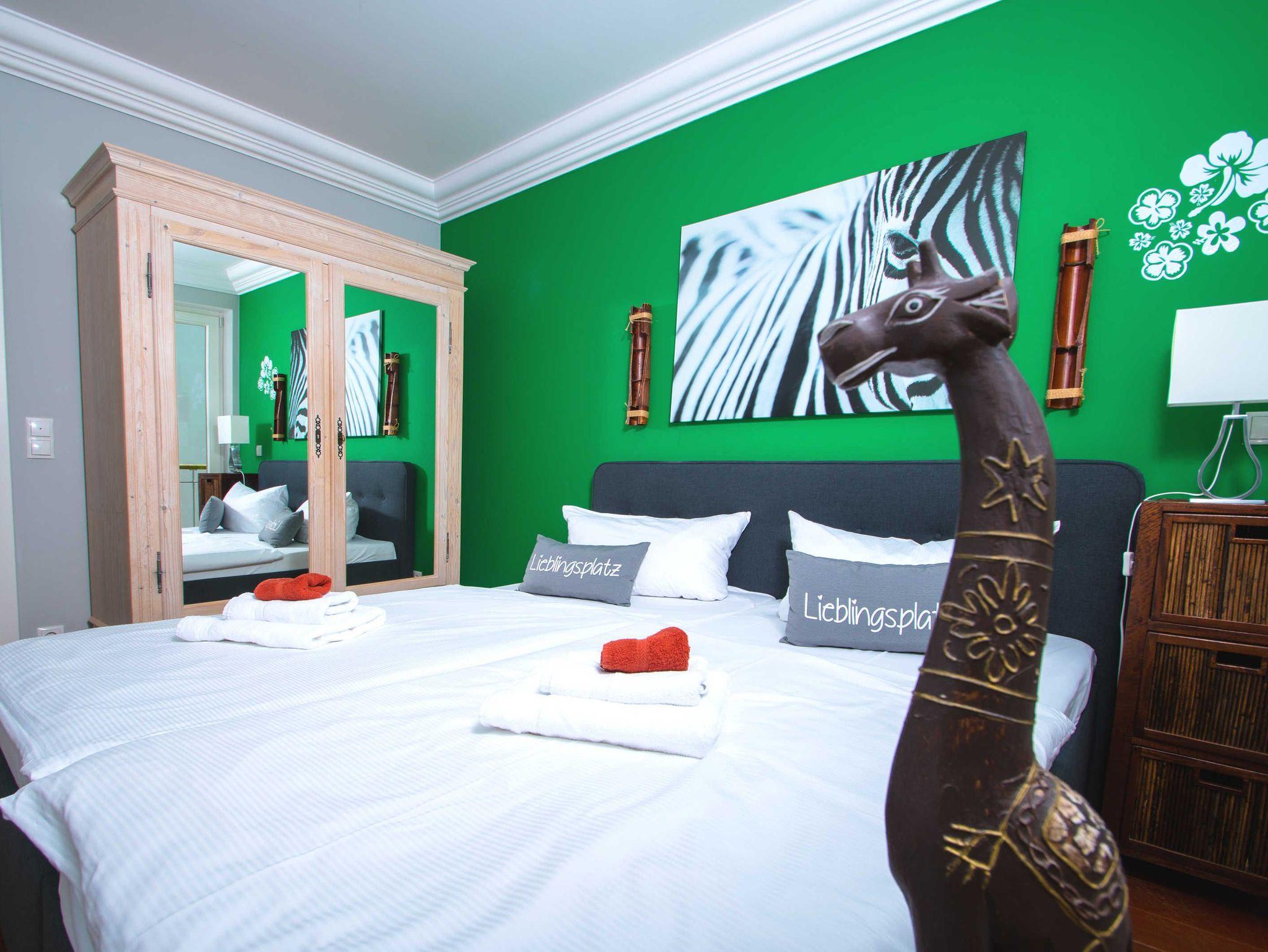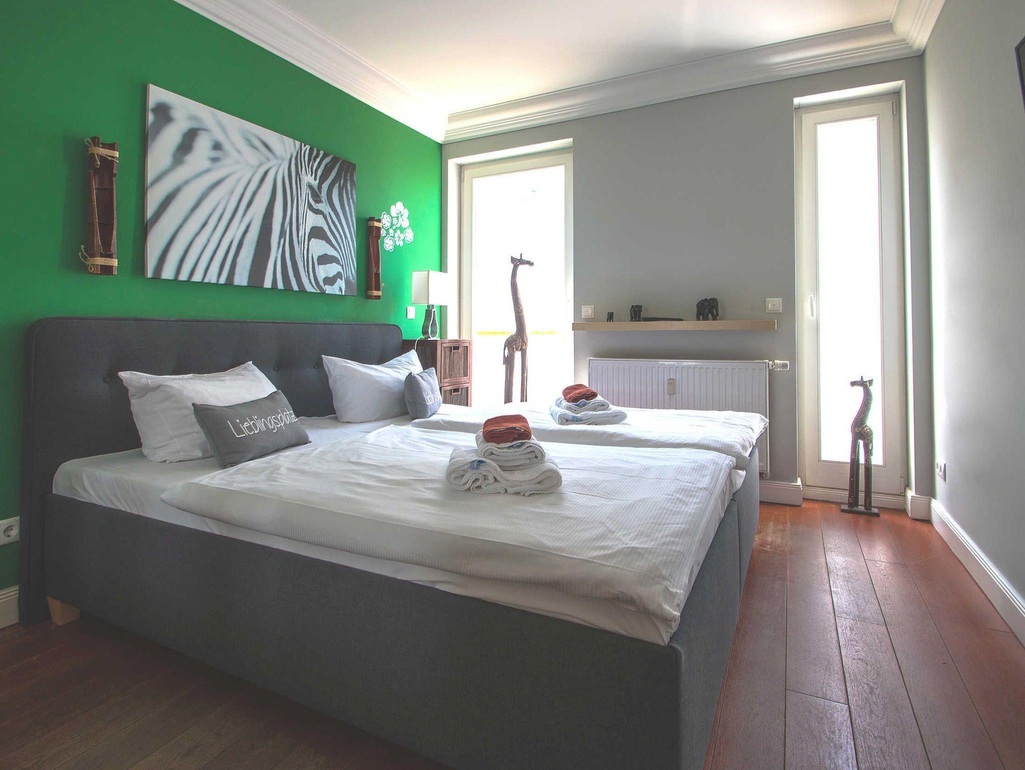 Das stilvolle Appartement verfügt über zwei Doppelschlafzimmer mit je einem Doppelbett (Maße jeweils 1,80 m x 2,00 m). Von einem Schlafzimmer aus haben Sie direkten Zugang zum Badezimmer mit Badewanne und es gibt ein weiteres kleines Duschbad.