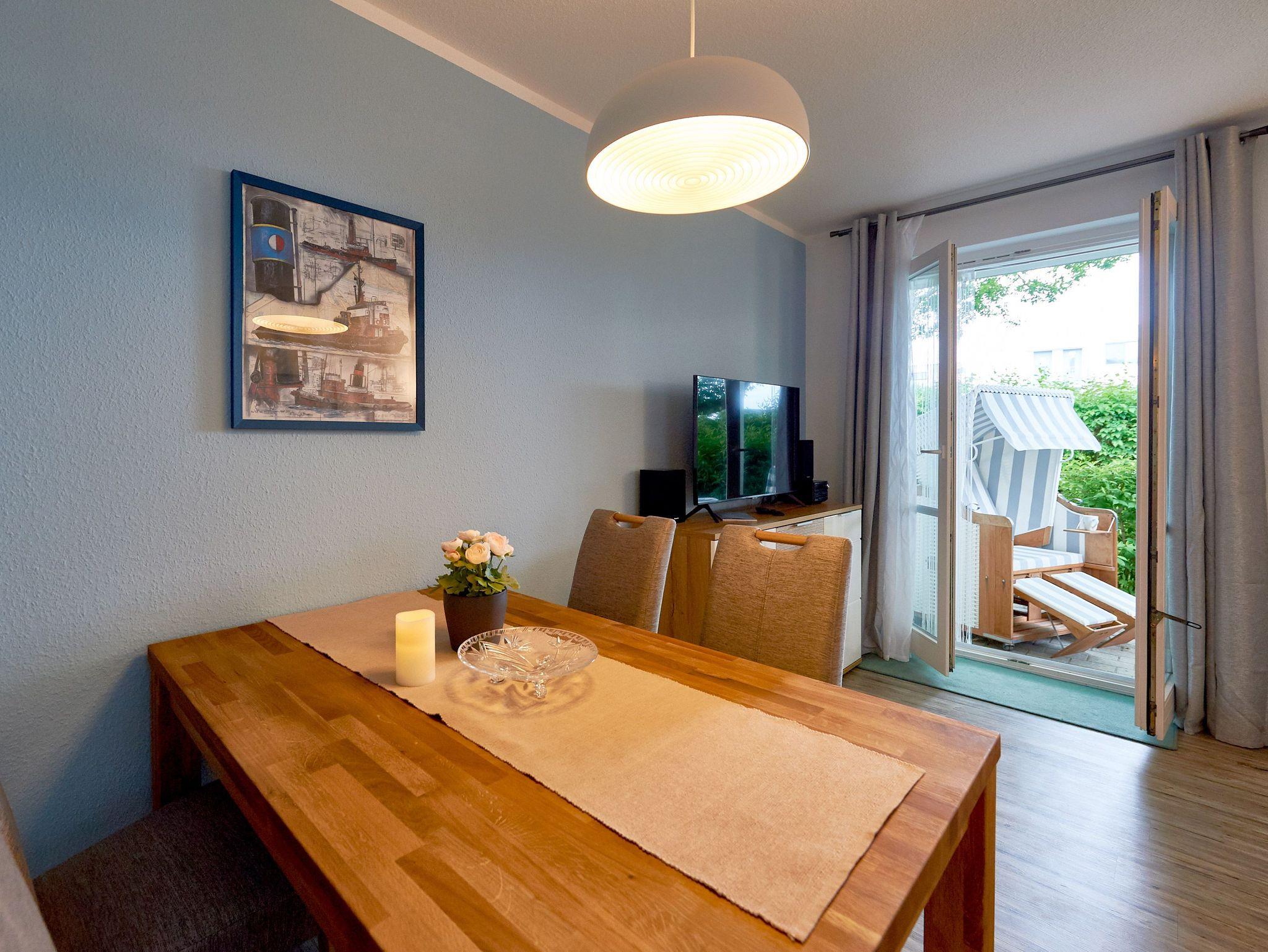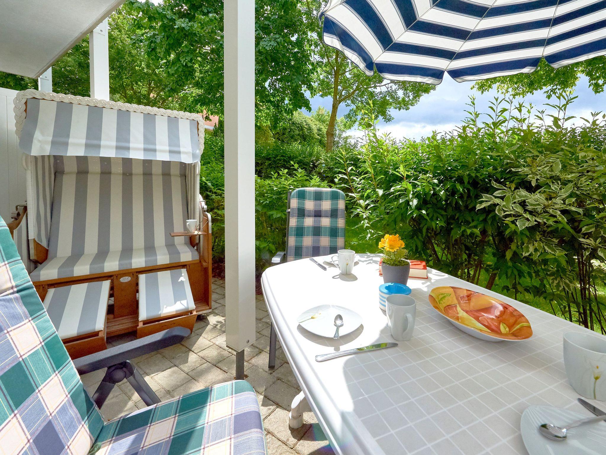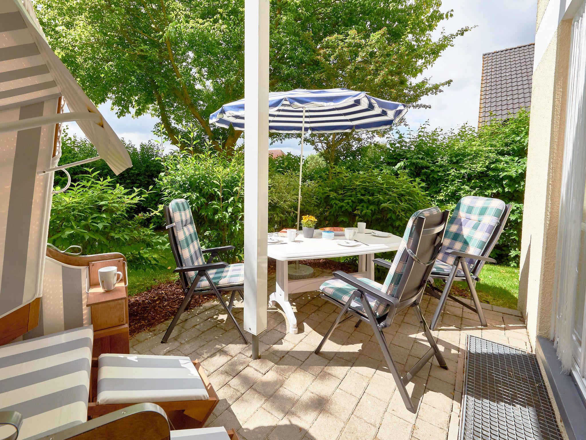 Modernes 2-Raum-Appartement mit möblierter Terrasse und Strandkorb in Binz, ideal für erholsame Tage an der Ostsee.