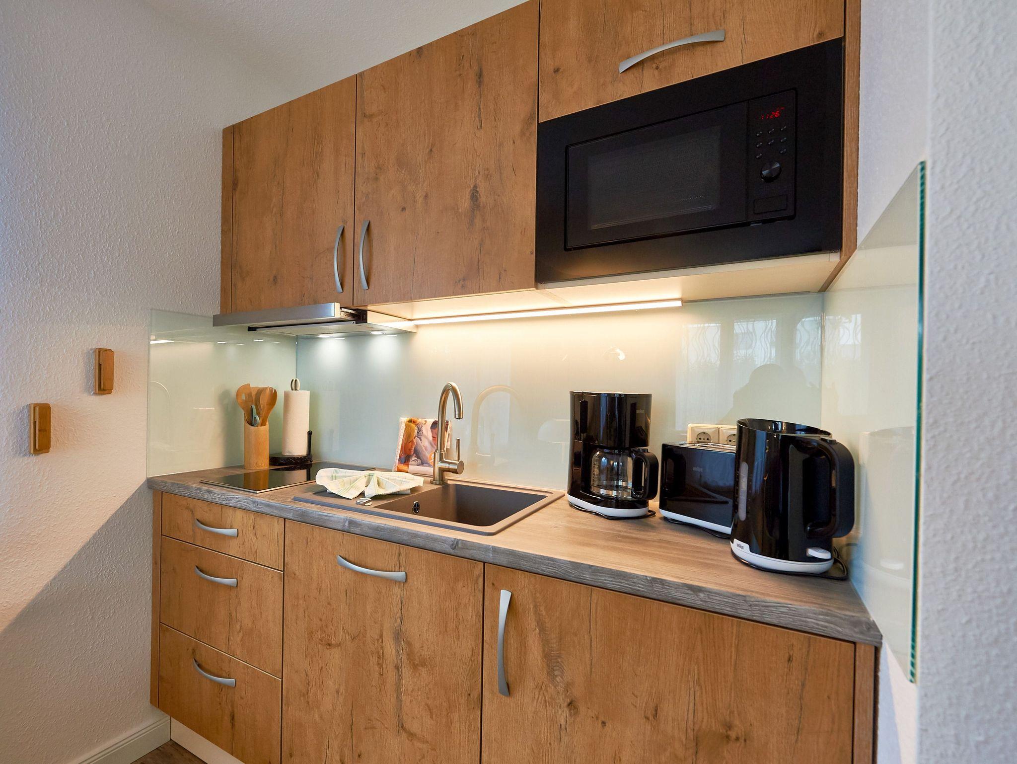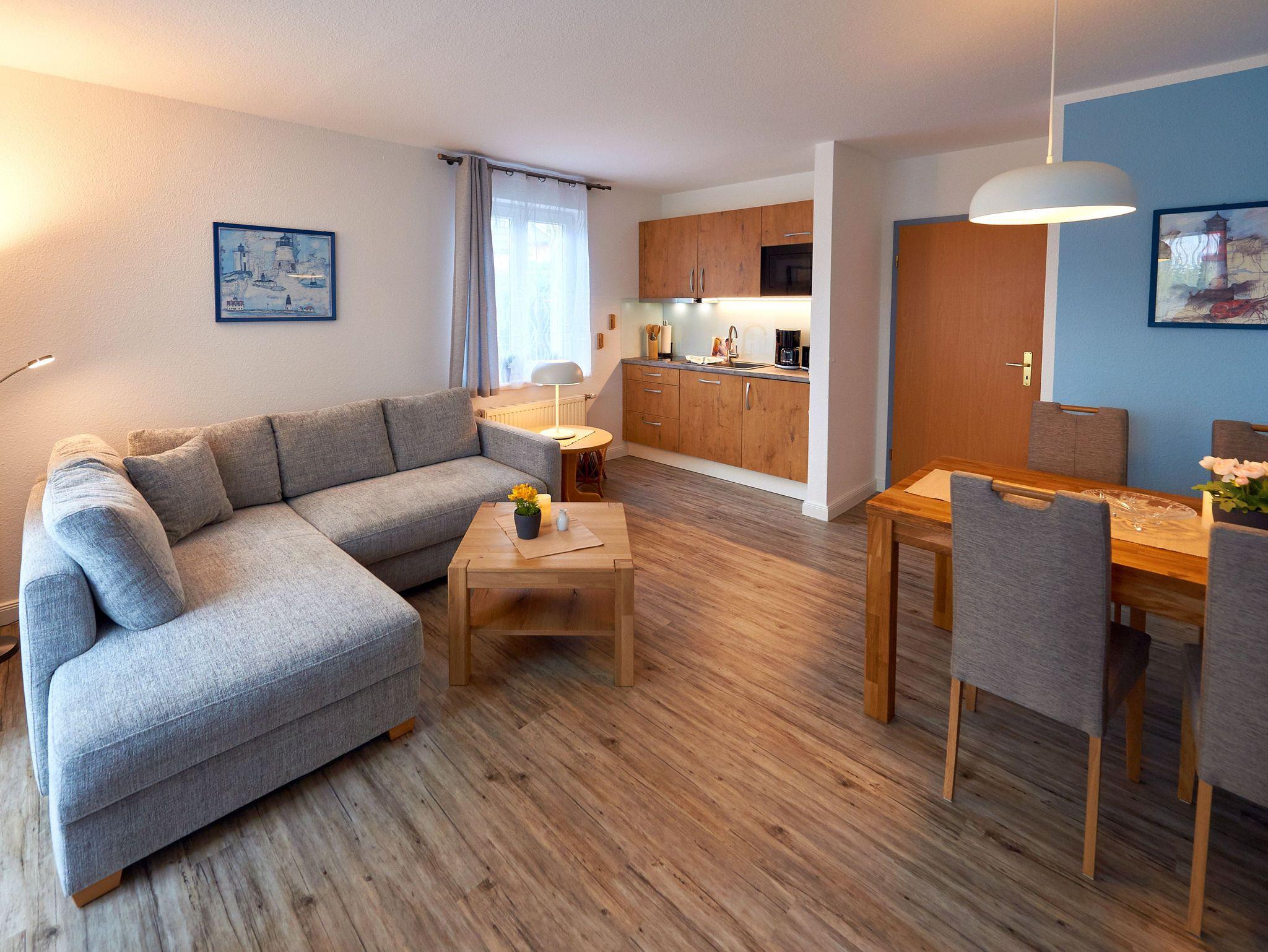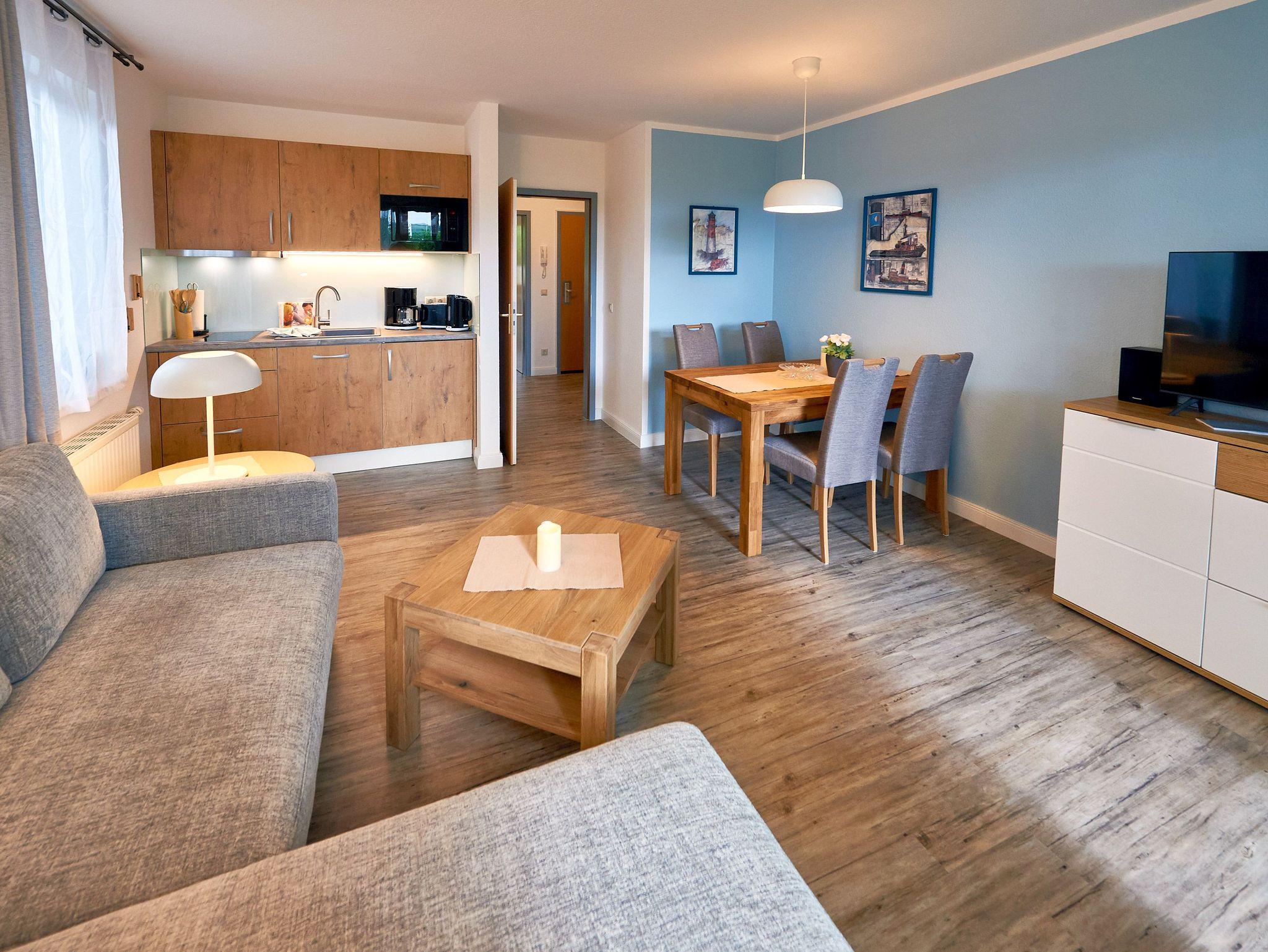 Der Wohnraum Ihres Zuhauses auf Zeit ist mit einem Esstisch, einer bequemen Couch (Aufbettungsmöglichkeit für eine Person), einem großen Smart-TV, einer Mini-Stereoanlage mit Radio/CD-Player und der harmonisch integrierten Küchenzeile eingerichtet. Diese ist mit einem Kühlschrank inkl. Gefrierfach, einer Mikrowelle, einem 2-Platten-Ceranfeld, einem Wasserkocher, einer Kaffeemaschine, einem Toaster und sonstigem Kleininventar ausgestattet, so dass Sie sich bequem selbst bekochen können, wenn Sie nicht gerade unterwegs in einem der Lokale der Insel einkehren. Bis zum Bäcker mit den frischen Frühstücksbrötchen sind es vom Wohnpark übrigens nur knapp 5 Gehminuten.