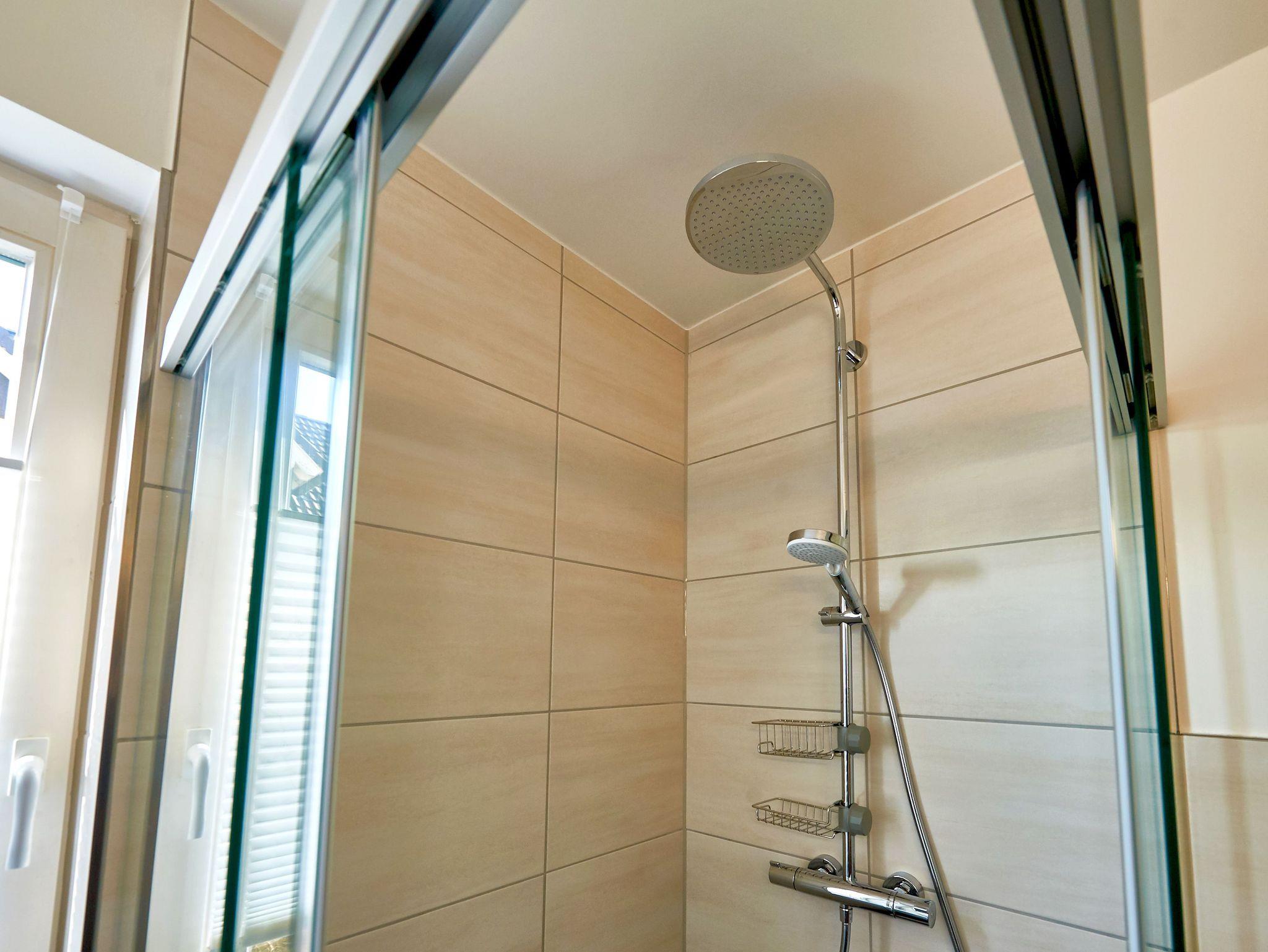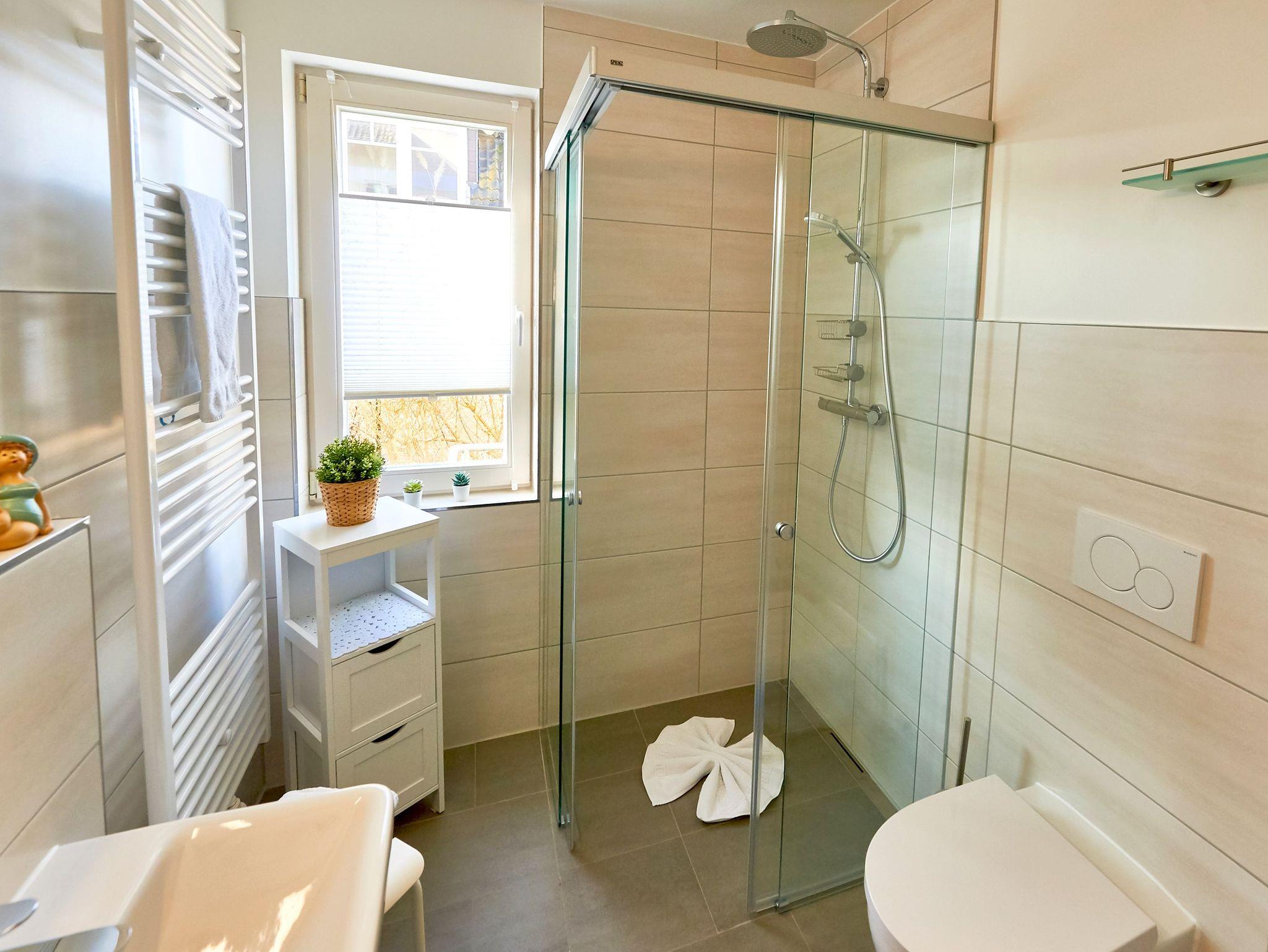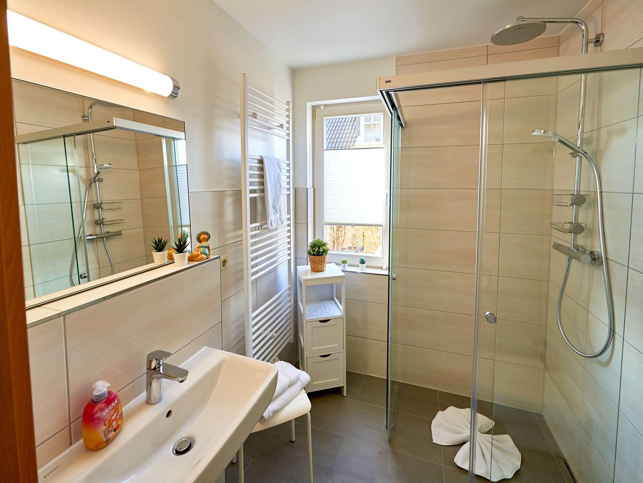 Auch im chicen Tageslicht-Bad wurde an alles gedacht, damit Sie sich rundum wohlfühlen können: Dusche/WC, ein beleuchteter Waschtisch, Fön, ein Hocker und genügend Haken und Ablageflächen für Ihre Utensilien.