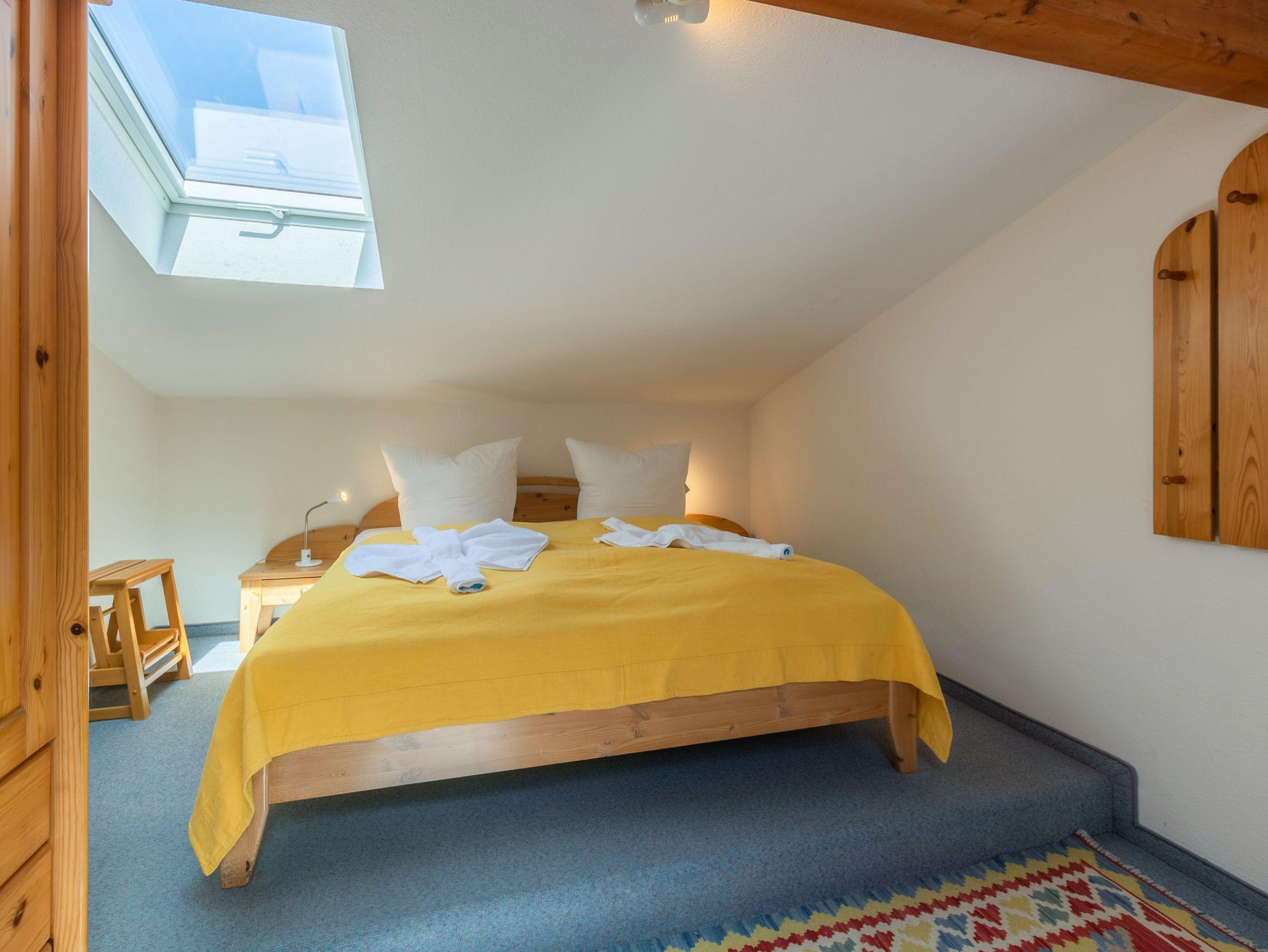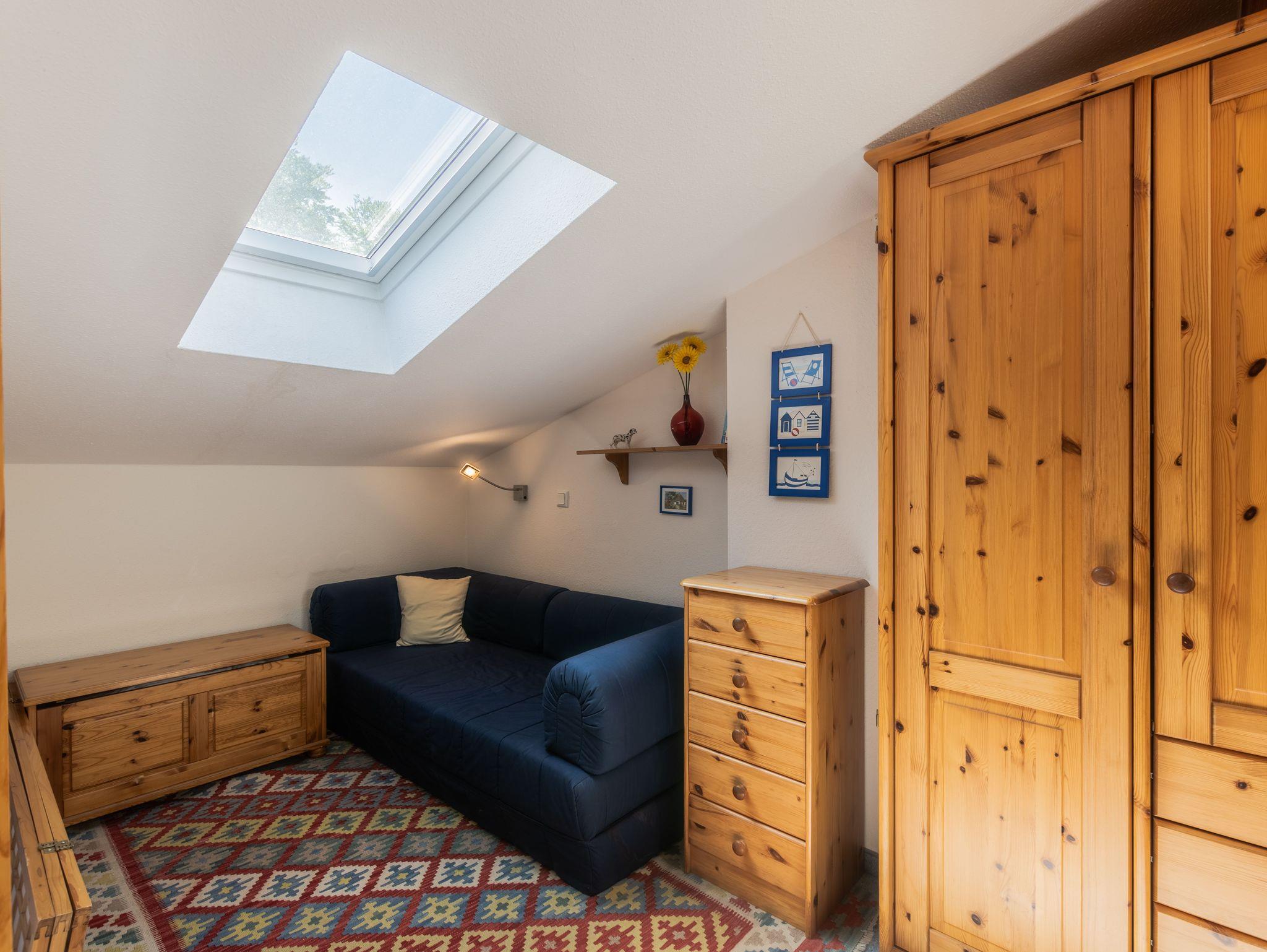 Das Schlafzimmer befindet sich in der offenen Galerie und ist mit einem Doppelbett, einer Schlafcouch und einem Kleiderschrank ausgestattet.