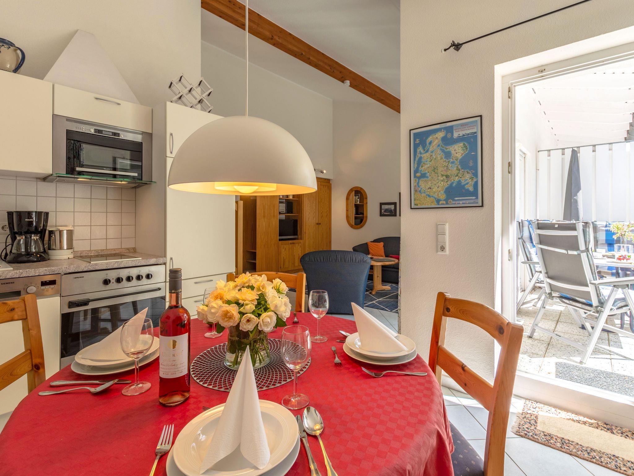 In der komplett ausgestatteten offenen Wohnküche sorgen Sie mit Ceran-Back-Herd, Geschirrspüler, Mikrowelle und weiteren nützlichen Geräten wie Kaffeemaschine, Toaster, Wasserkocher für Ihr leibliches Wohl.