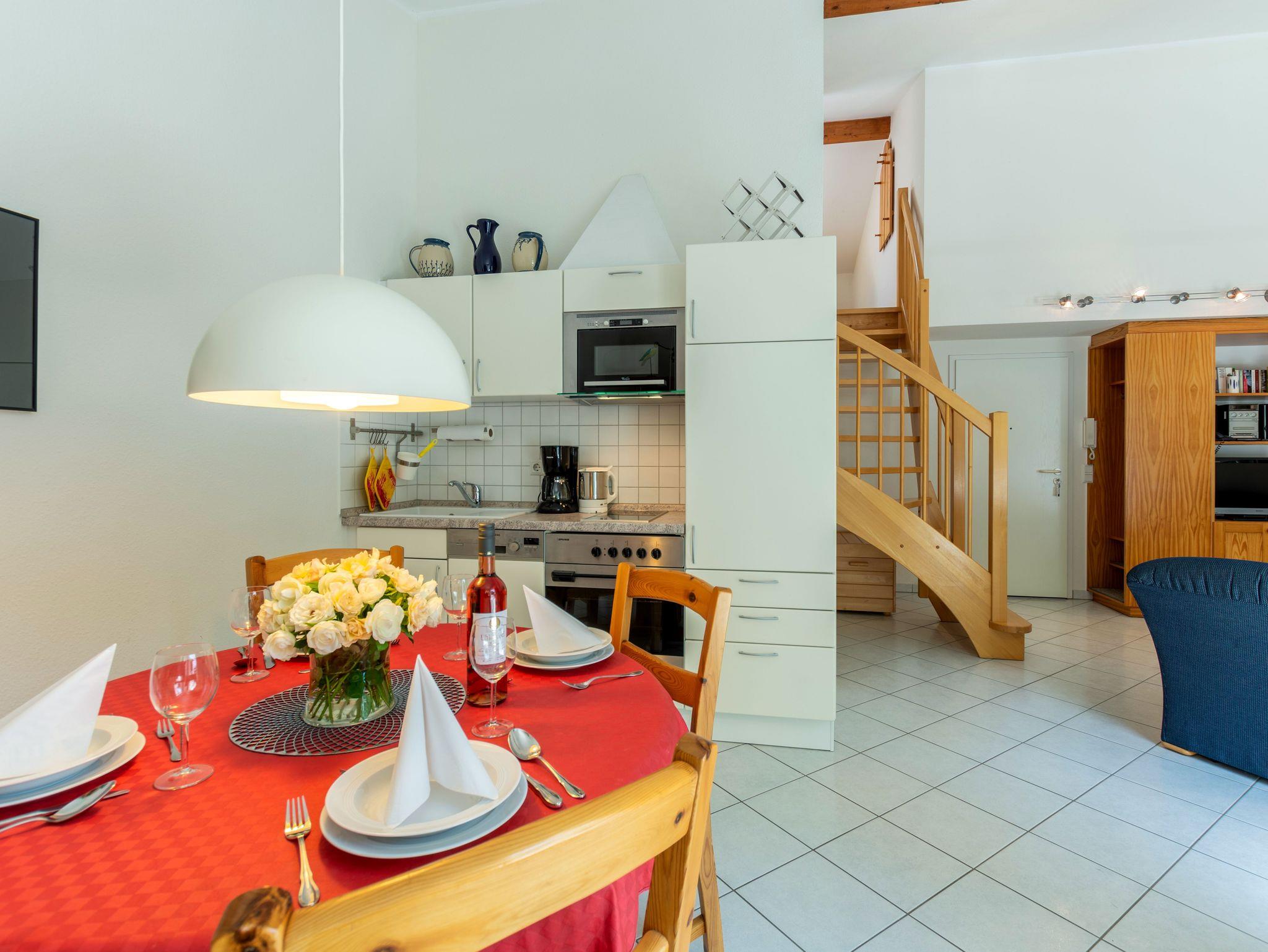 Die freundlich eingerichtete Galeriewohnung ist 50 m² groß und befindet sich im Dachgeschoss.