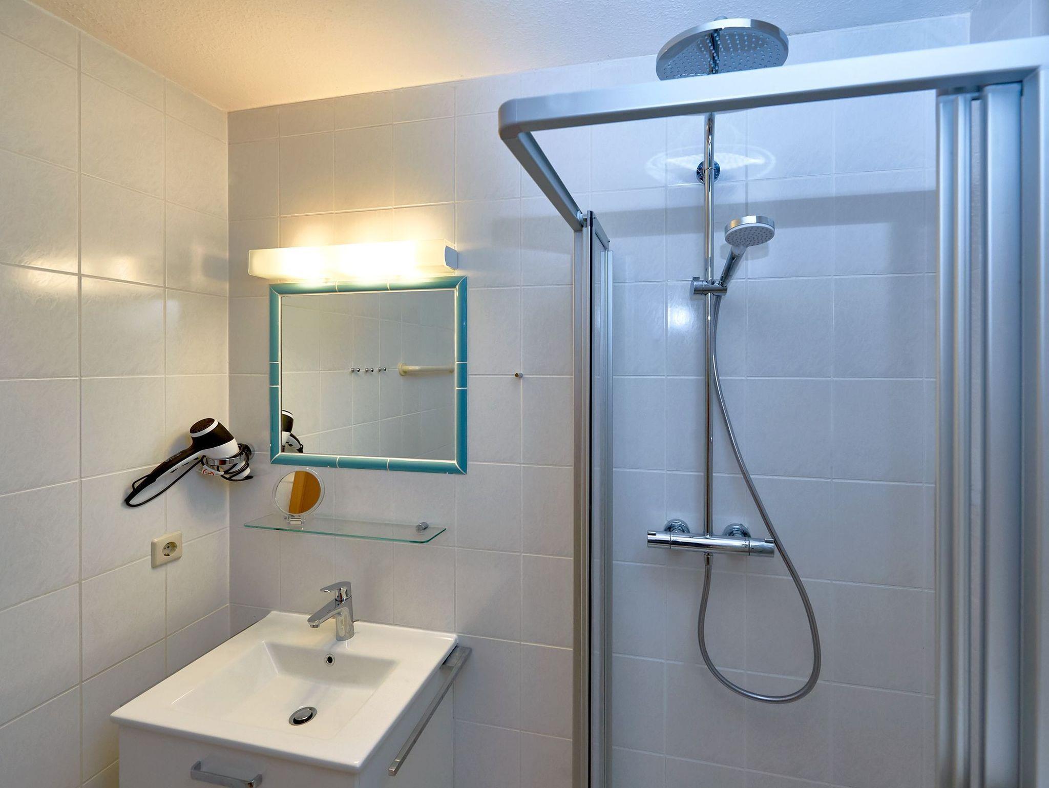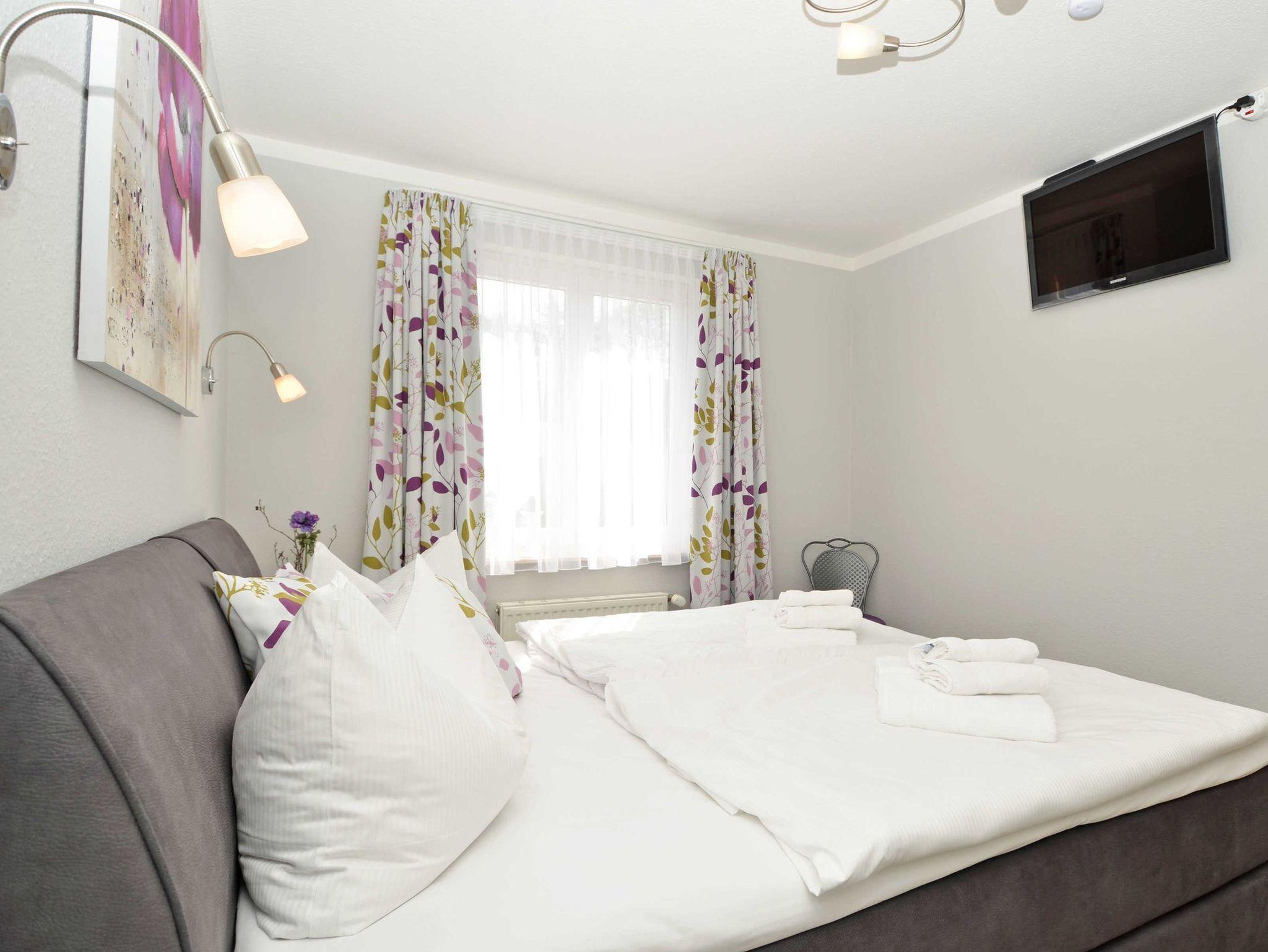 Weiterhin gibt es ein Schlafzimmer mit einem Doppelbett und seniorengerechter Betthöhe, einem zusätzlichen Fernseher und ausreichend Platz für Ihre Garderobe sowie ein Bad mit Dusche/WC und einem Haartrockner.