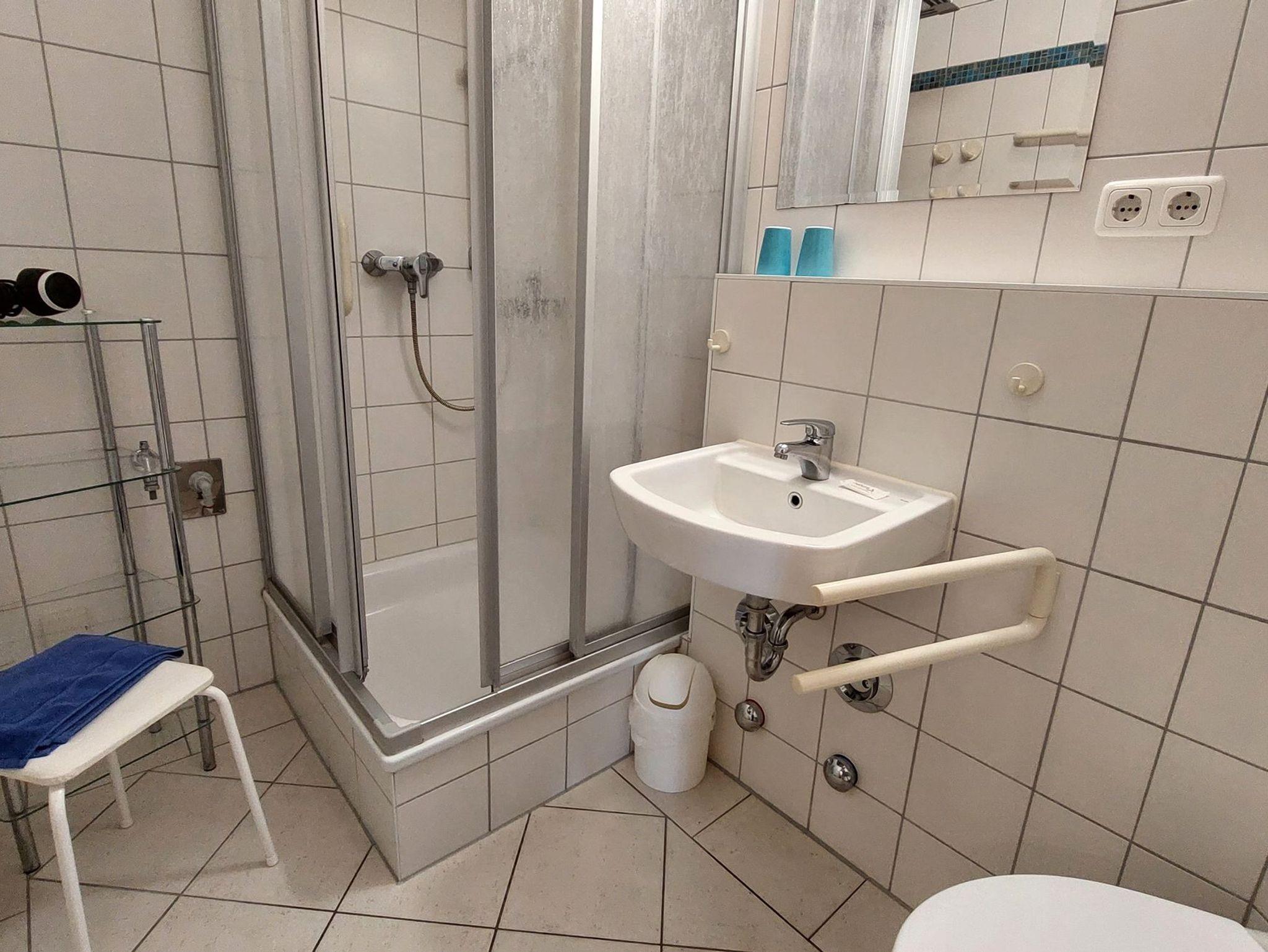 Das Badezimmer bietet ein WC, Waschtisch, Dusche sowie einen Fön.