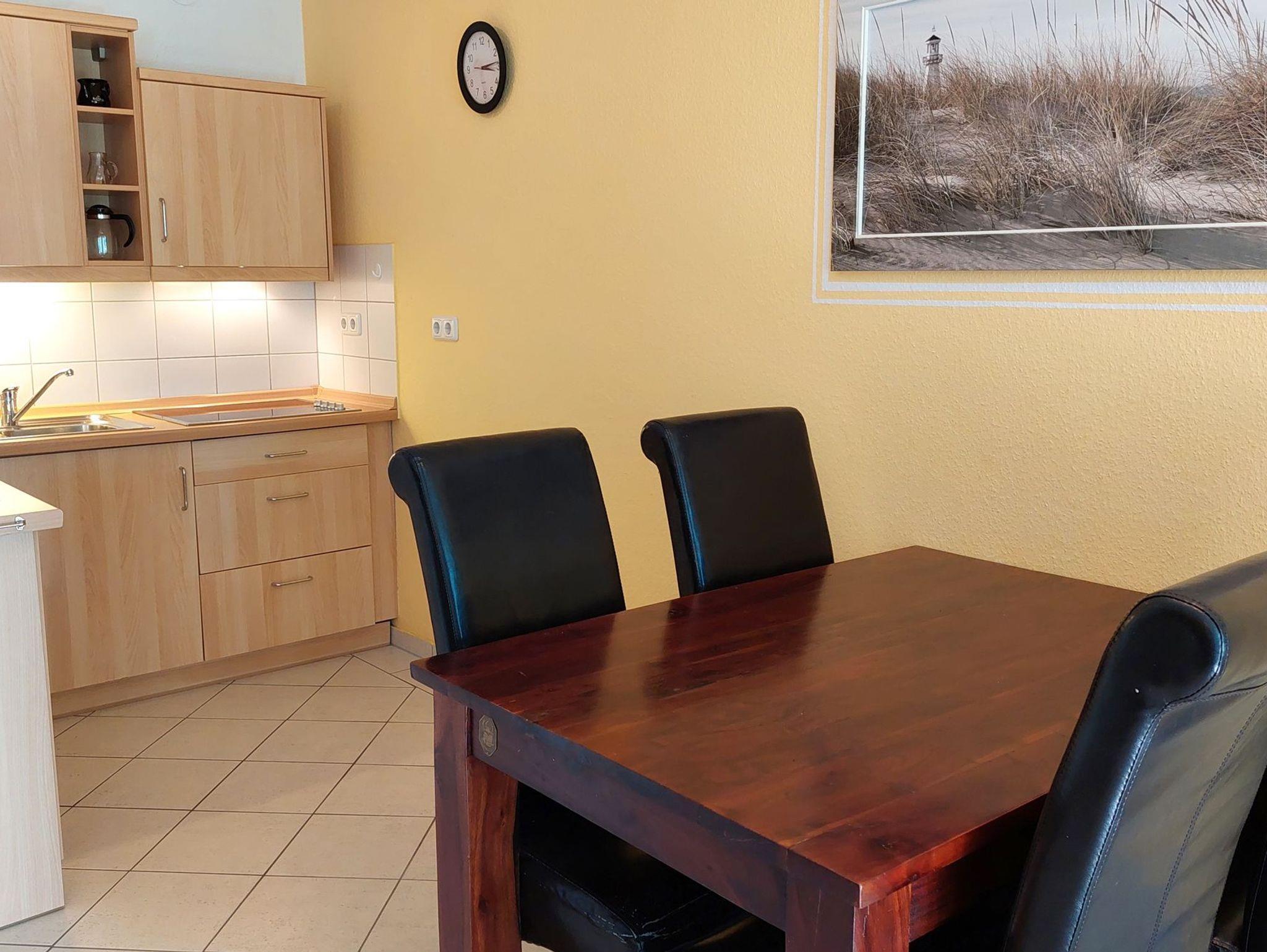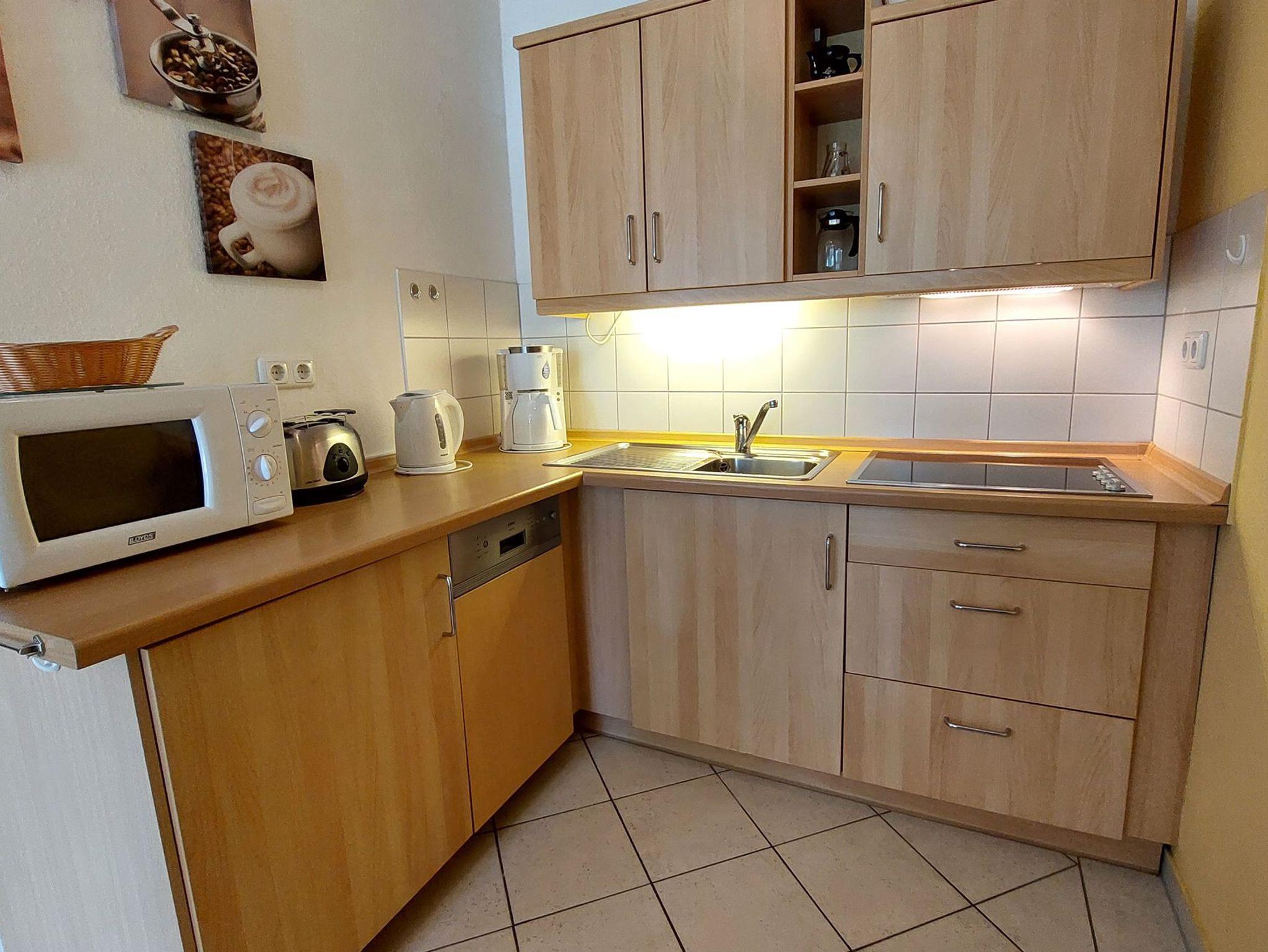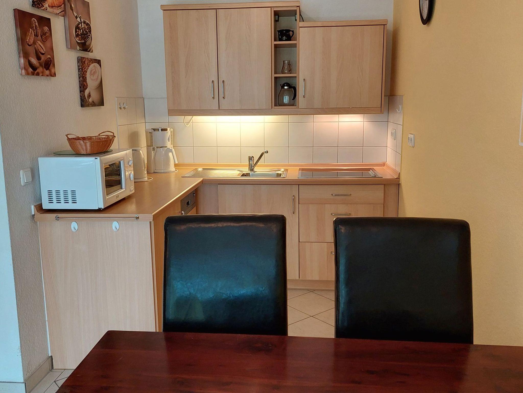 Der offene Ess- und Kochbereich umfasst einen Esstisch mit 4 Sitzgelegenheiten und eine Kochzeile samt Cerankochfeld, Geschirrspüler, Kühlschrank, Mikrowelle und vielen weiteren Küchenhelfern.