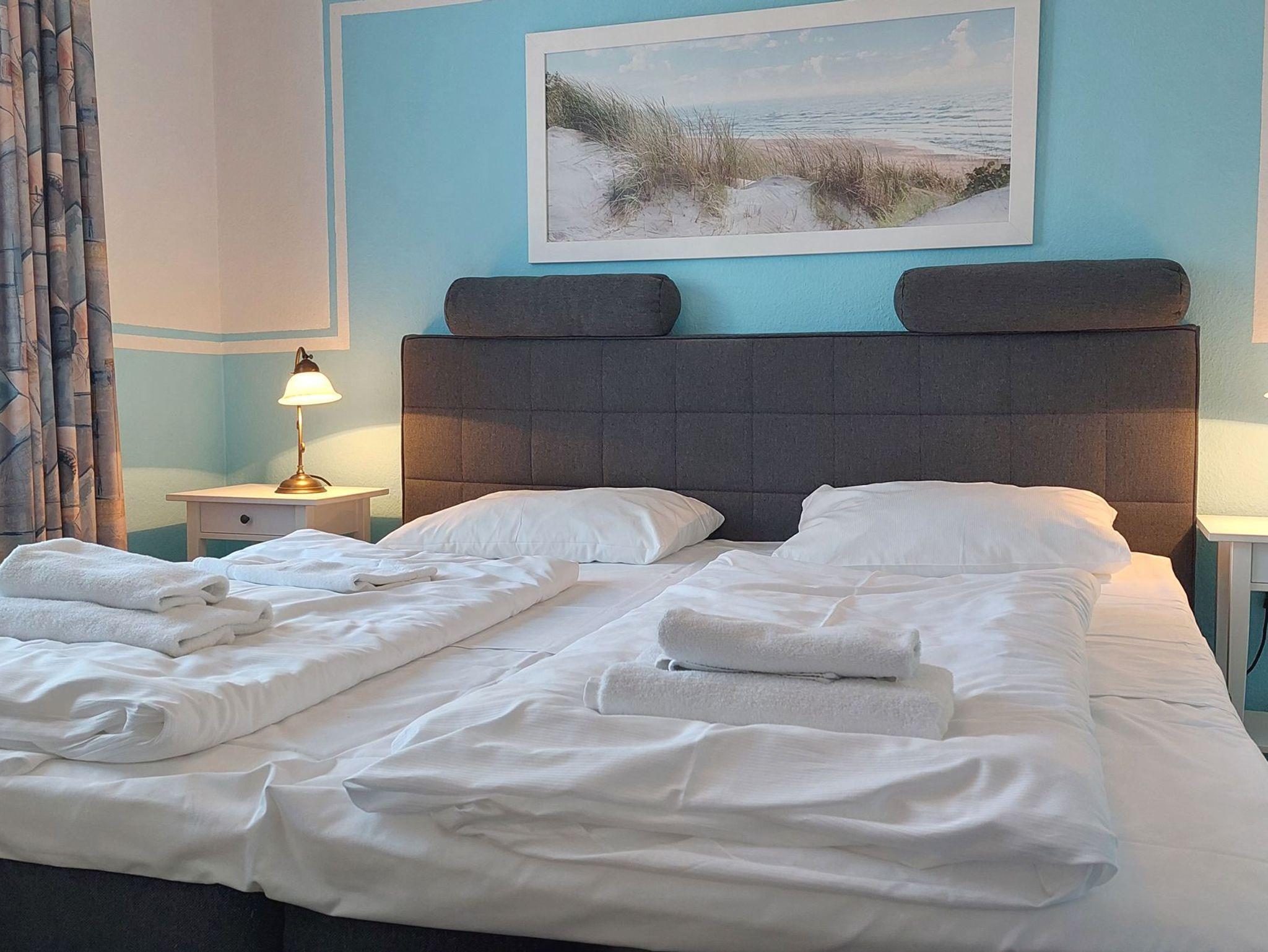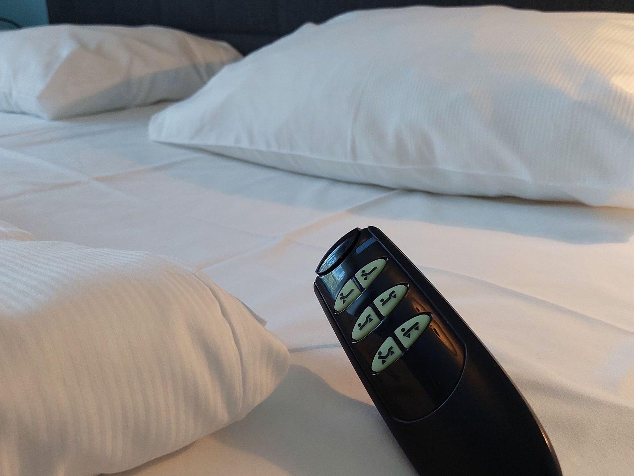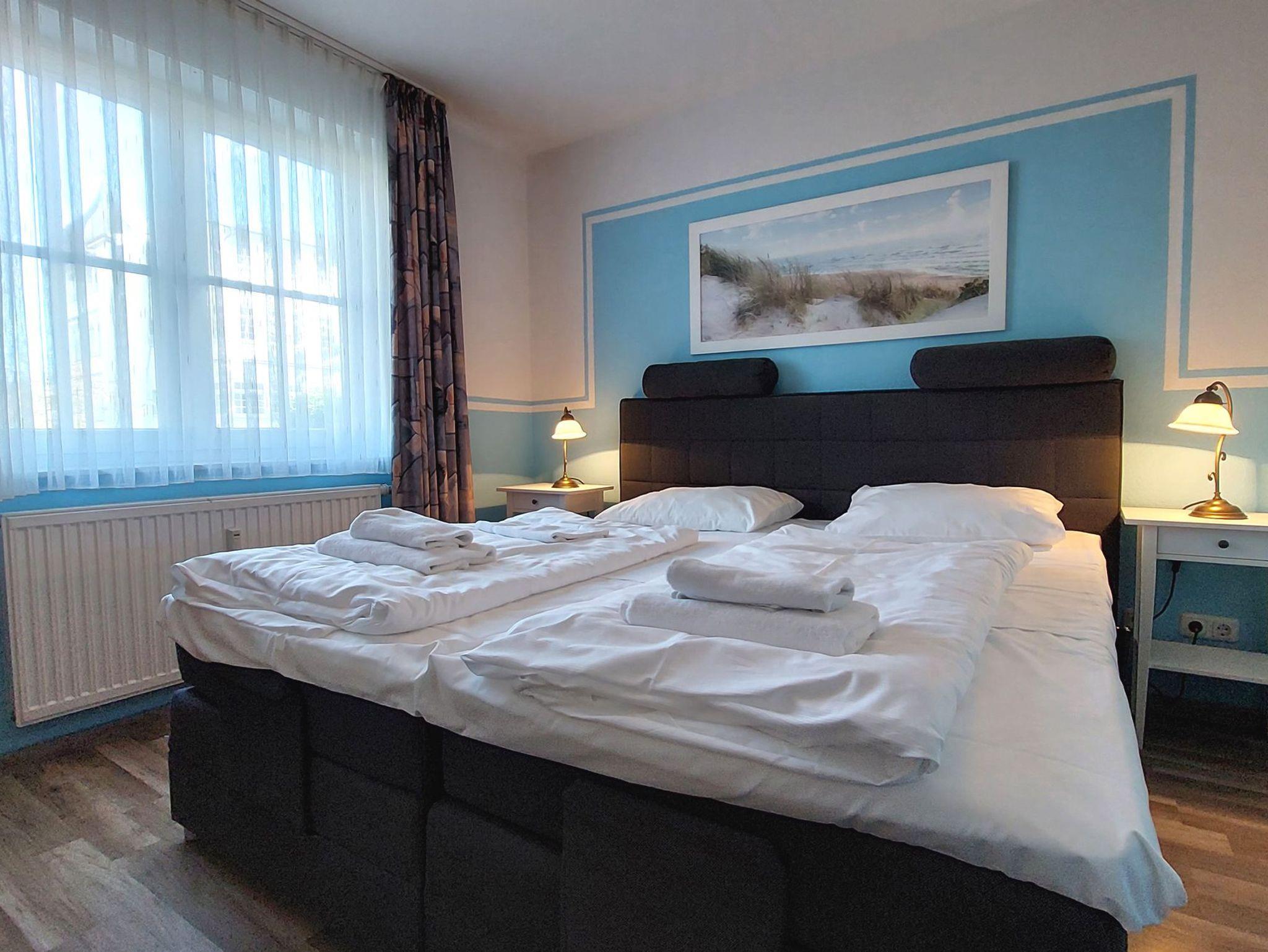 Im Schlafzimmer befindet sich ein großes Boxspringbett (mit elektrischer Sitz-und Liegefunktion), ein geräumiger Kleiderschrank sowie Nachtische mit einem Radiowecker.