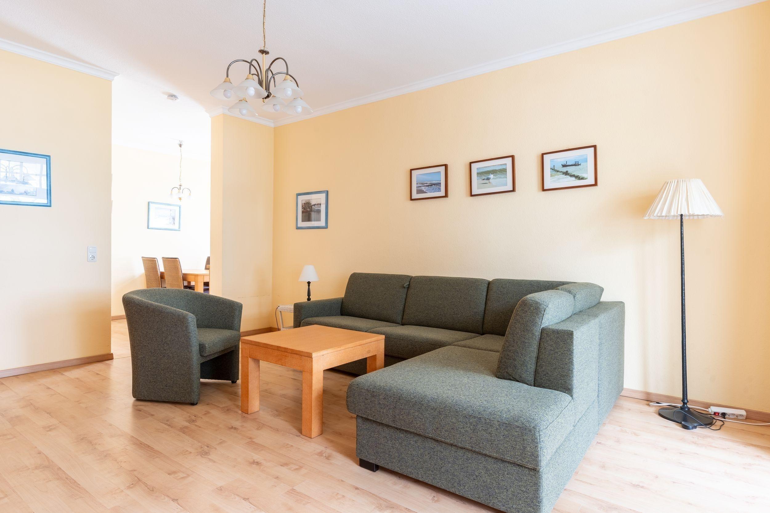 Vom Wohnzimmer aus erreichen Sie die beiden möblierten Balkone mit traumhaften Blick auf die Ostsee. Die Couch im Wohnbereich lässt sich mit wenigen Handgriffen zu einem Schlafplatz für 2 Personen ausklappen. Auf der Couch können Sie entspannt eine Urlaubstag vor dem Flat TV ausklingen lassen.