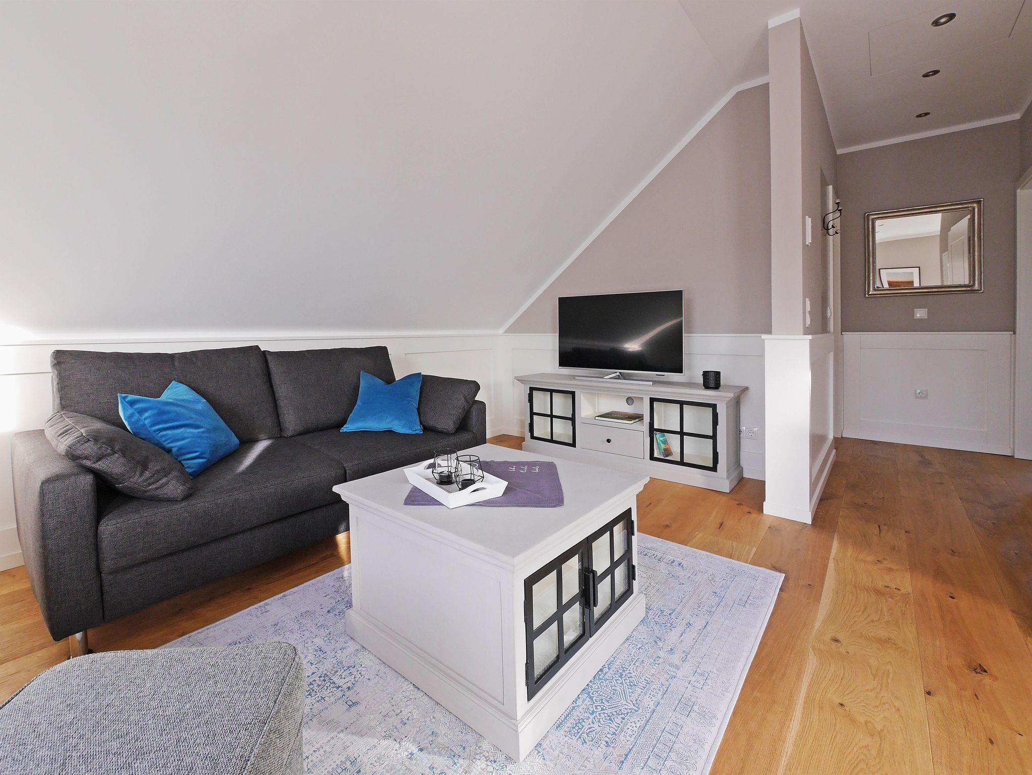 Diese Ferienwohnung liegt im Dachgeschoss des Hauses und ist über zwei Treppen zu erreichen. Über einen Flur kommt man direkt in den geräumigen Wohn- und Essbereich mit voll ausgestatteter Küche. Ebenso befindet sich hier eine gemütliche Couch sowie ein Lesesessel. Von hier aus gelangt man auf einen hübschen Balkon mit Sitzmöglichkeit, der eine schöne Aussicht auf Wald und Weinberge bietet. Im Schlafzimmer steht ein Doppel-Boxspringbett und ein geräumiger Schrank. Gegenüber befindet sich das Bad, welches über Tageslicht, eine Dusche, WC und Waschbecken mit Spiegel verfügt. Es handelt sich hier um eine Nichtraucherwohnung, in der keine Haustiere erlaubt sind. Einen Parkplatz finden Sie direkt vor dem Haus.