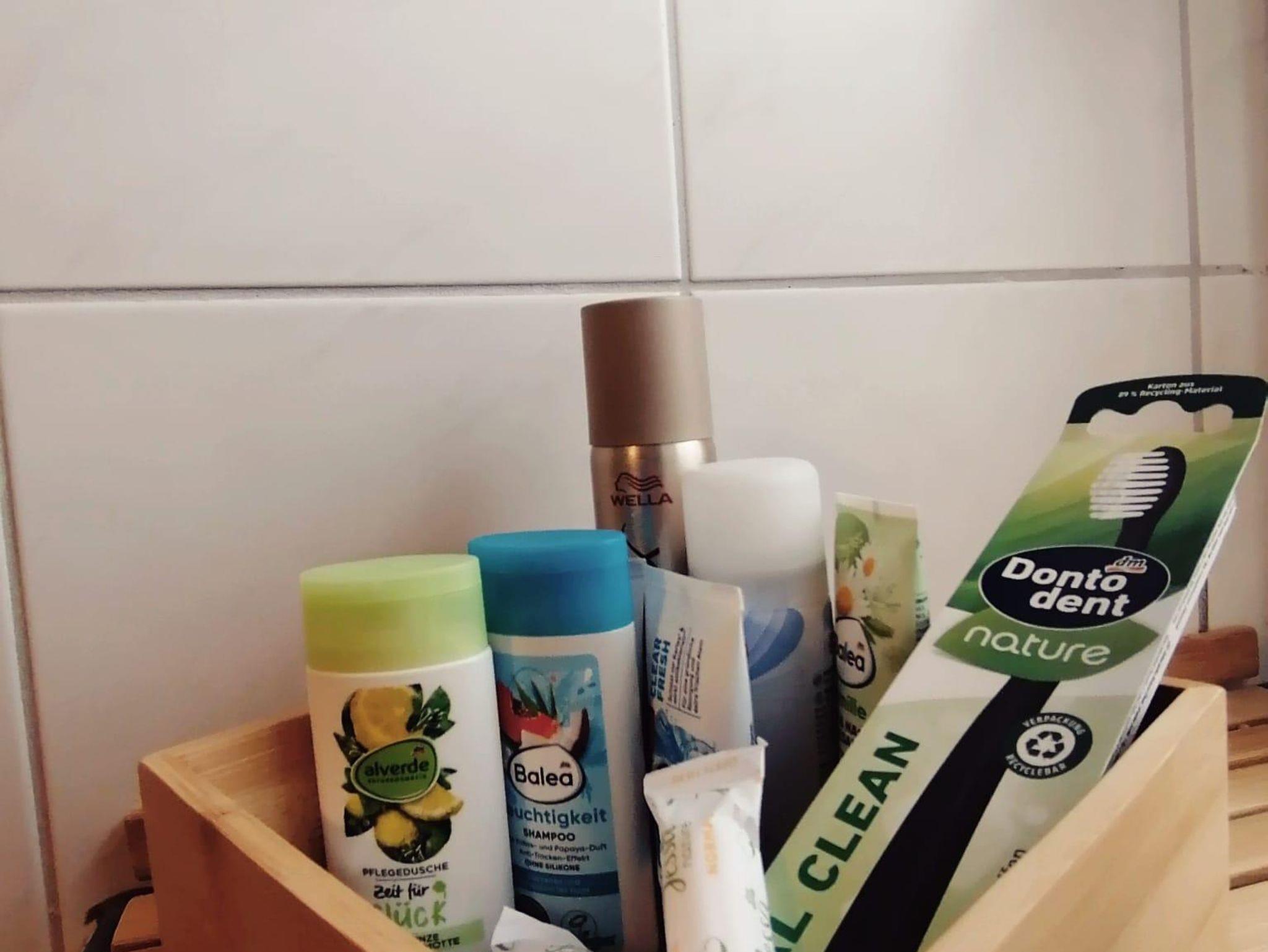 Im Badezimmer findet ihr neben Hand- und Badetüchern und Seife auch eine kleine Auswahl an Bad-Basics, falls man die Zahnbürste doch mal vergessen hat.