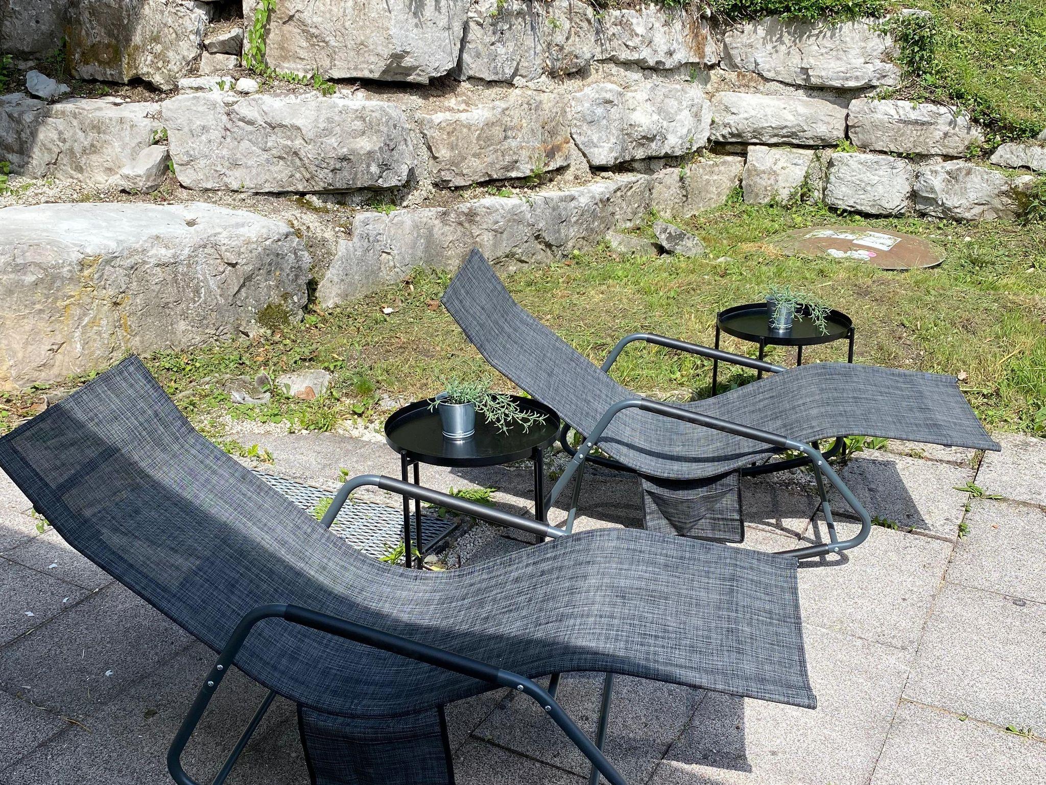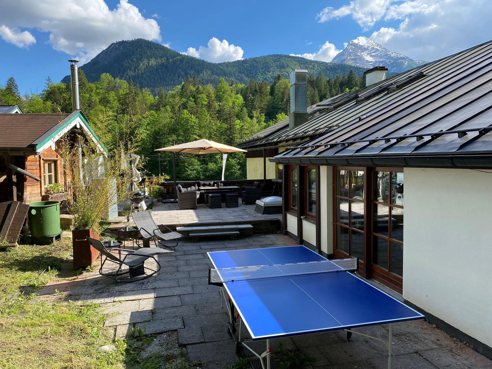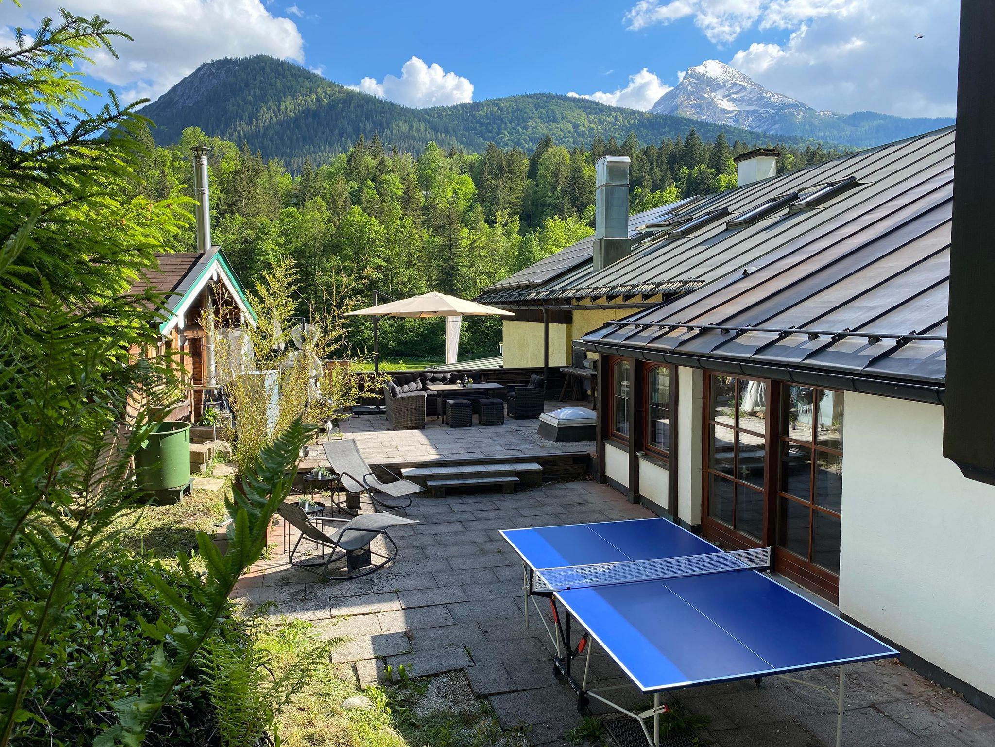 Auf der geräumigen Terrasse steht ebenfalls ein Esstisch mit gemütlicher Sitzgarnitur für Dich bereit, sowie ein großer Sonnenschirm und Liegen. Hier kannst Du im Freien essen, die frische Bergluft genießen und den direkten Blick auf den Watzmann und Kehlstein genießen und so richtig enstpannen.