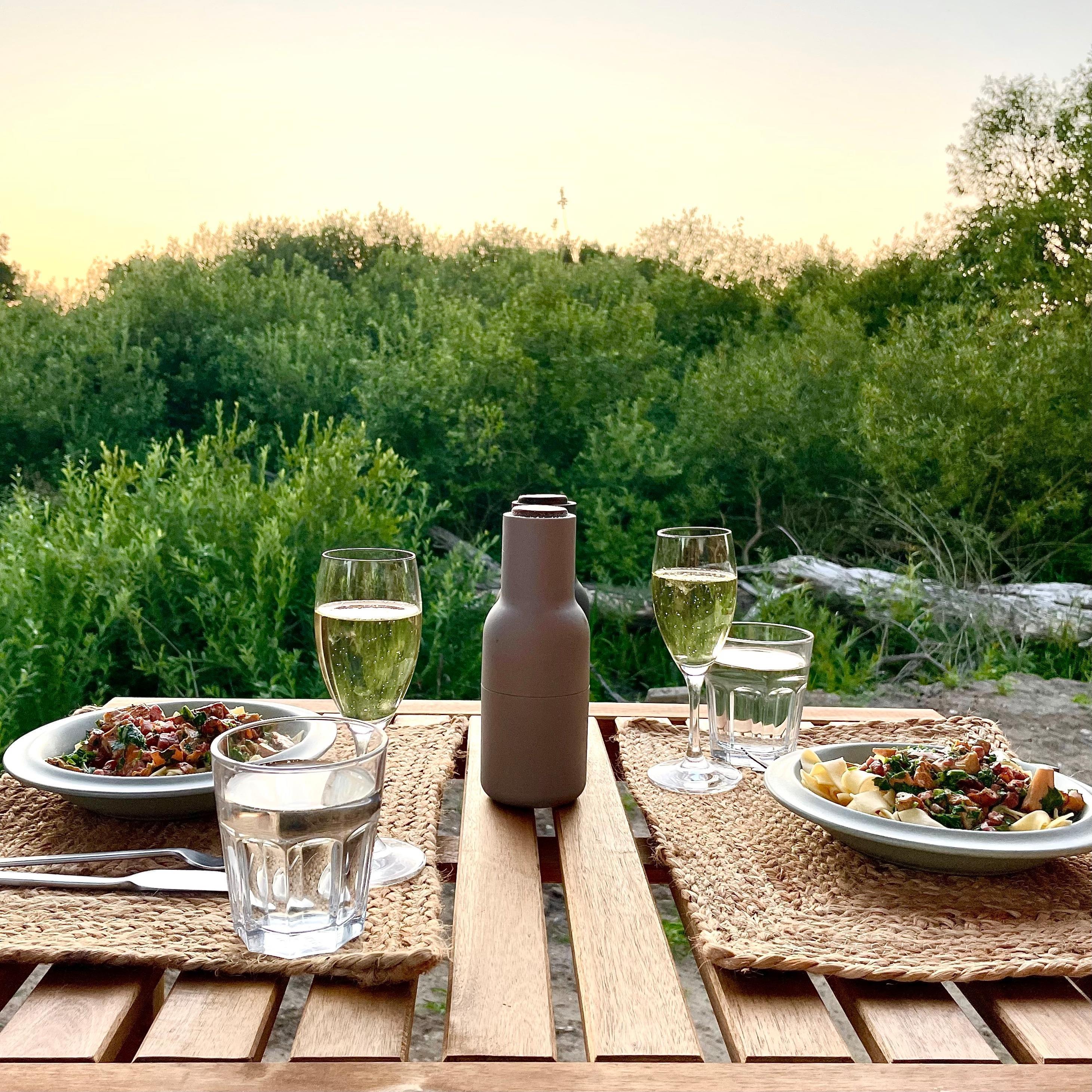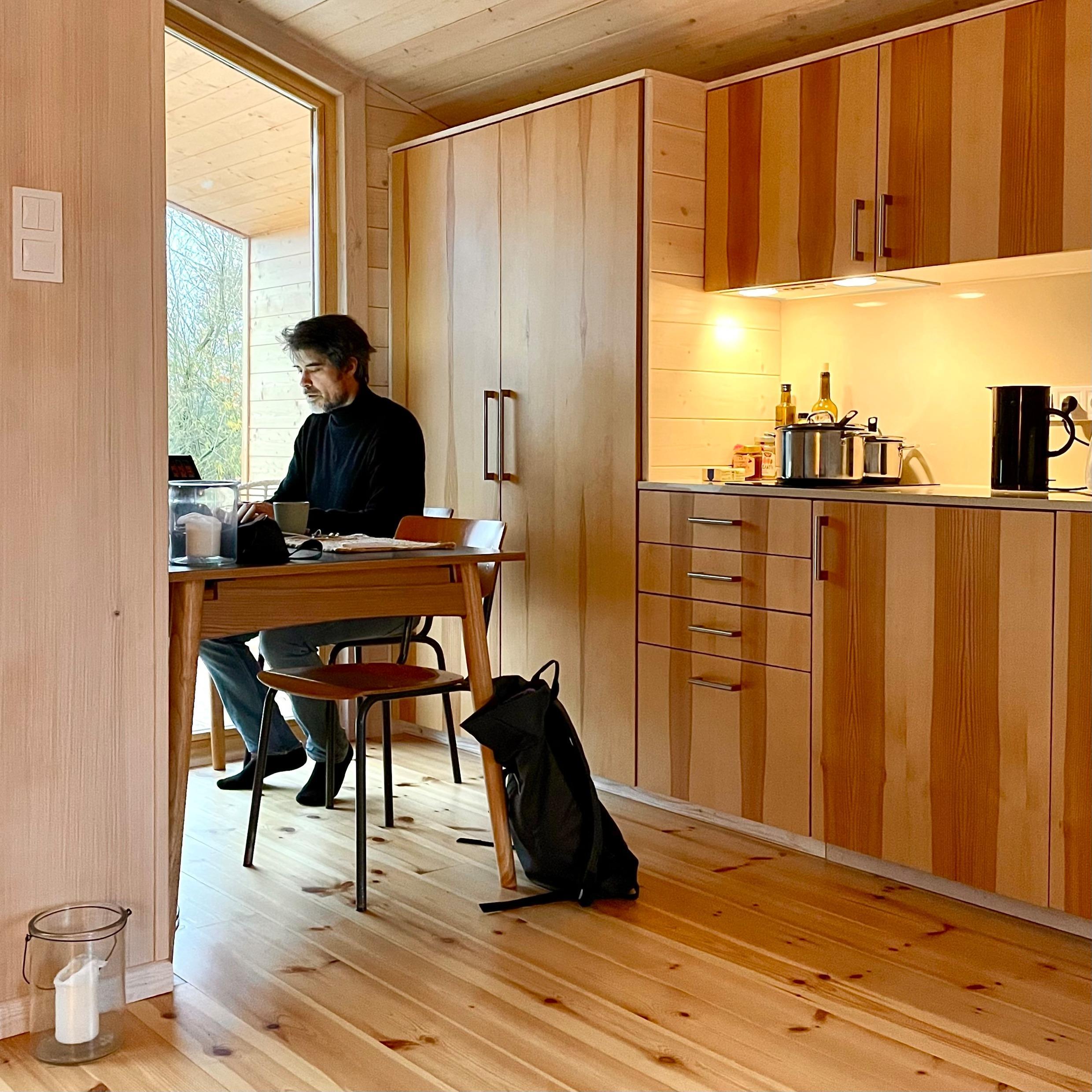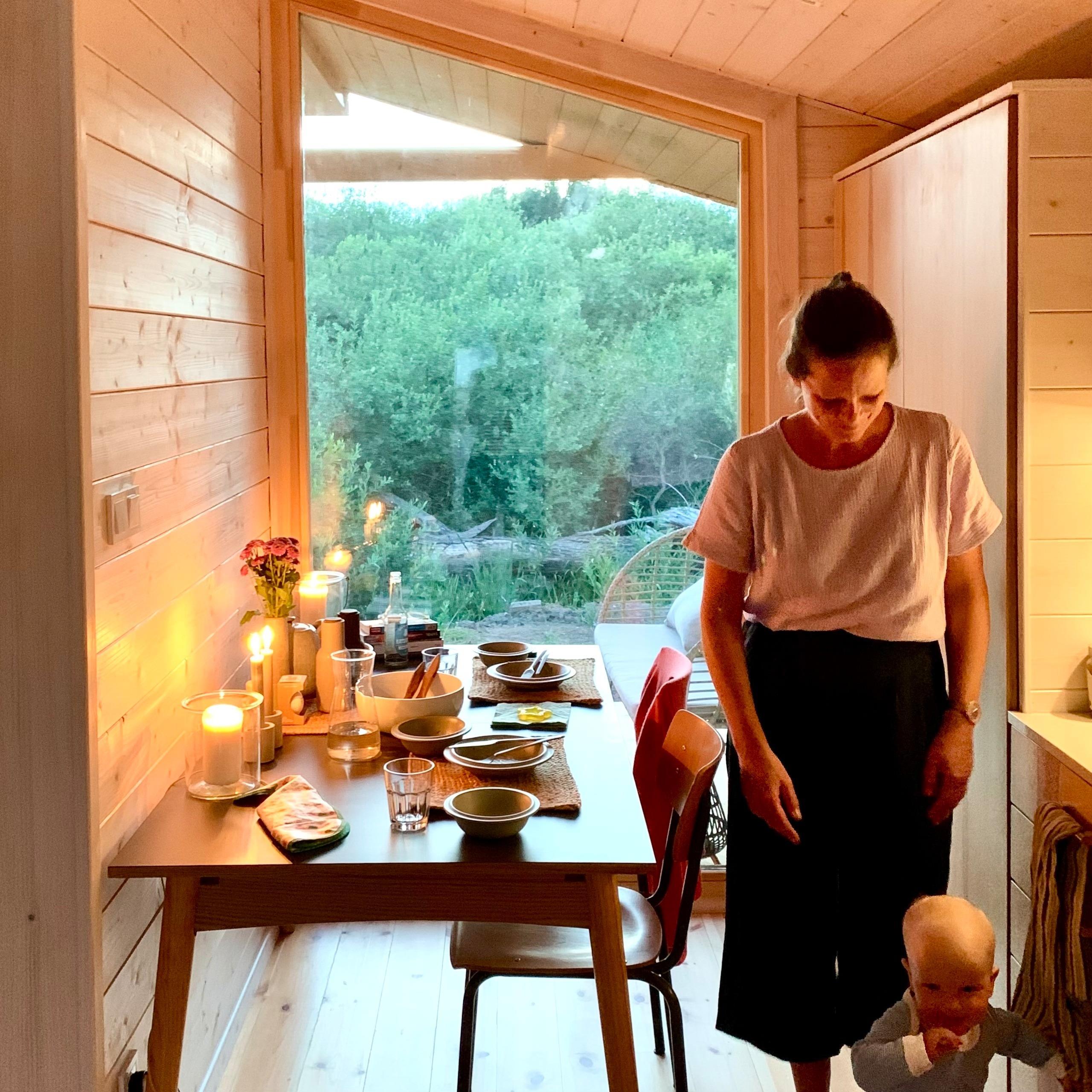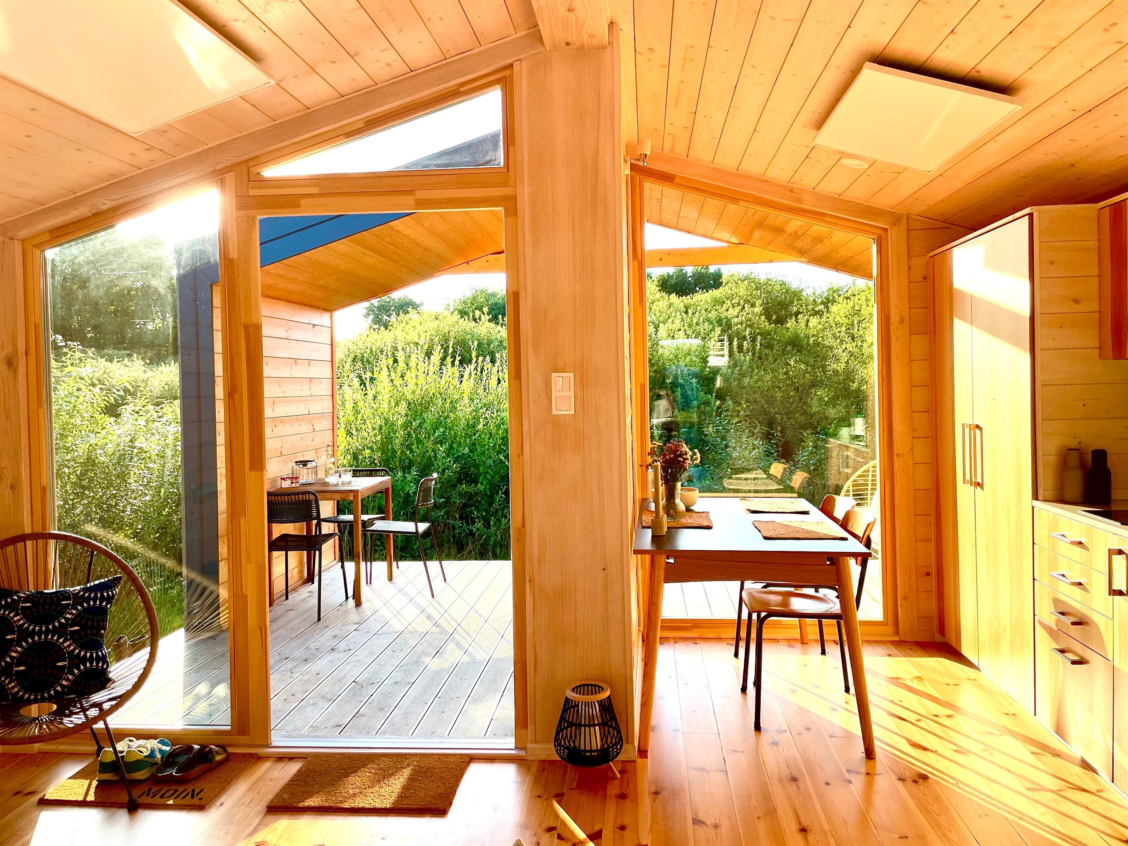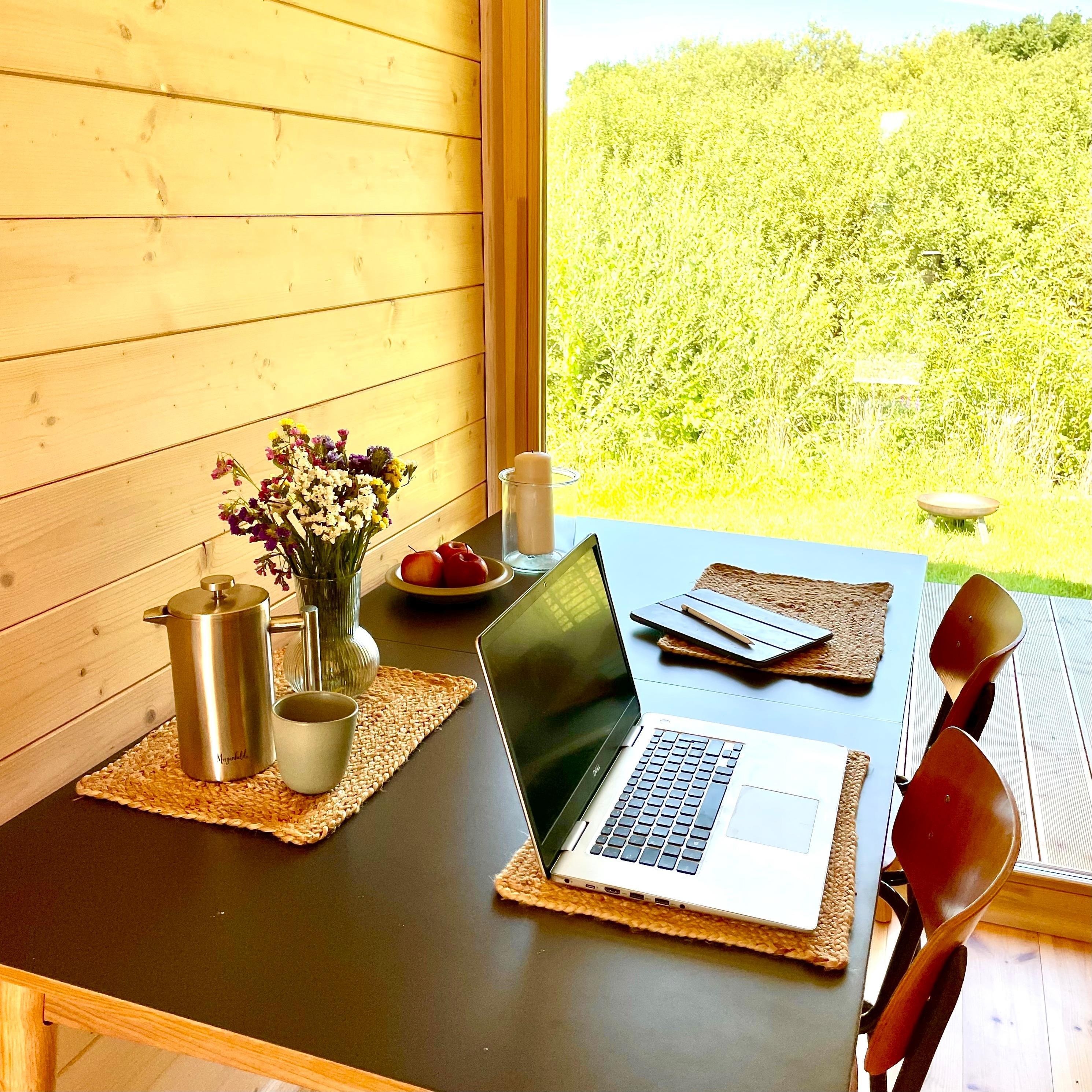 Da das Tiny House über Glasfaser-WLAN und über einen großen Tisch verfügt, bietet es sich auch als Homeoffice-Platz im Grünen an.