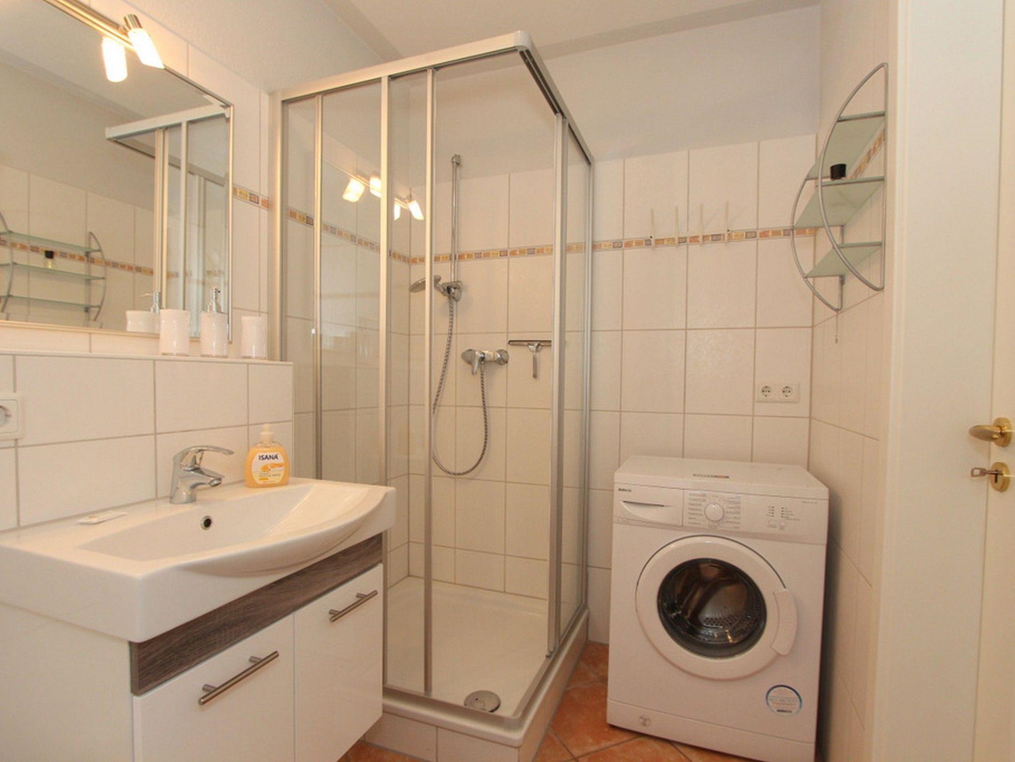 Im Badezimmer finden Sie neben Dusche und WC auch einen Handtuchtrockner und eine Waschmaschine.