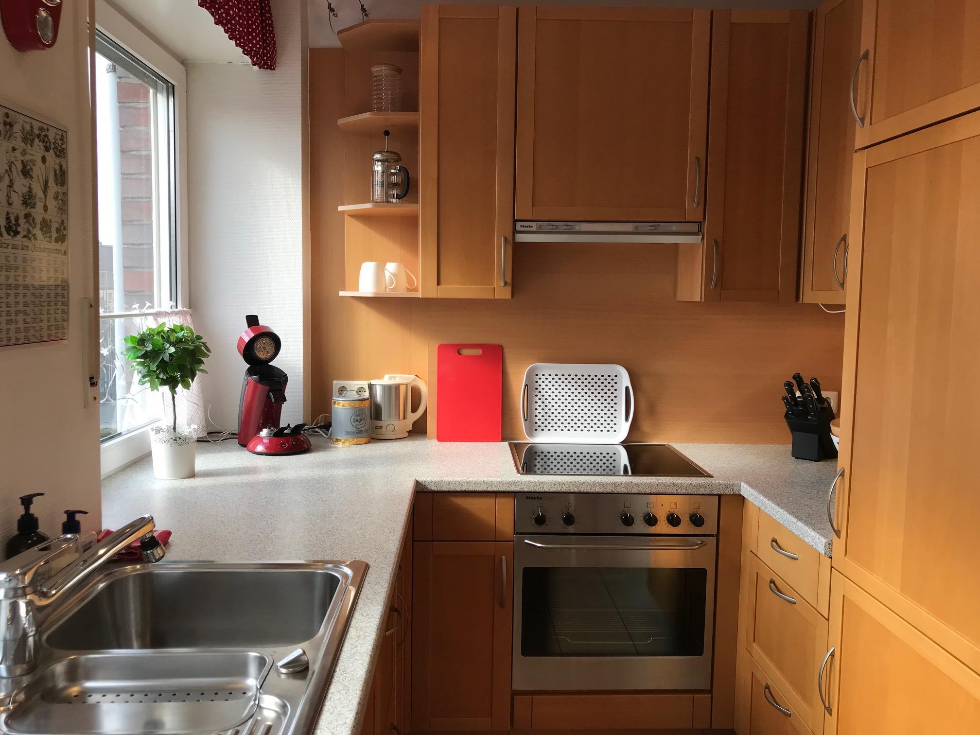 Backofen, Besteck, Essbereich, Esstisch, Geschirrspüler, Herd, Kaffee- und Teezubehör, Kaffeemaschine, Küche extra, Küchenutensilien, Küchenzeile, Kühlschrank, Mikrowelle, Spülbecken, Tiefkühlfach, Toaster, Wasserkocher, Weingläser