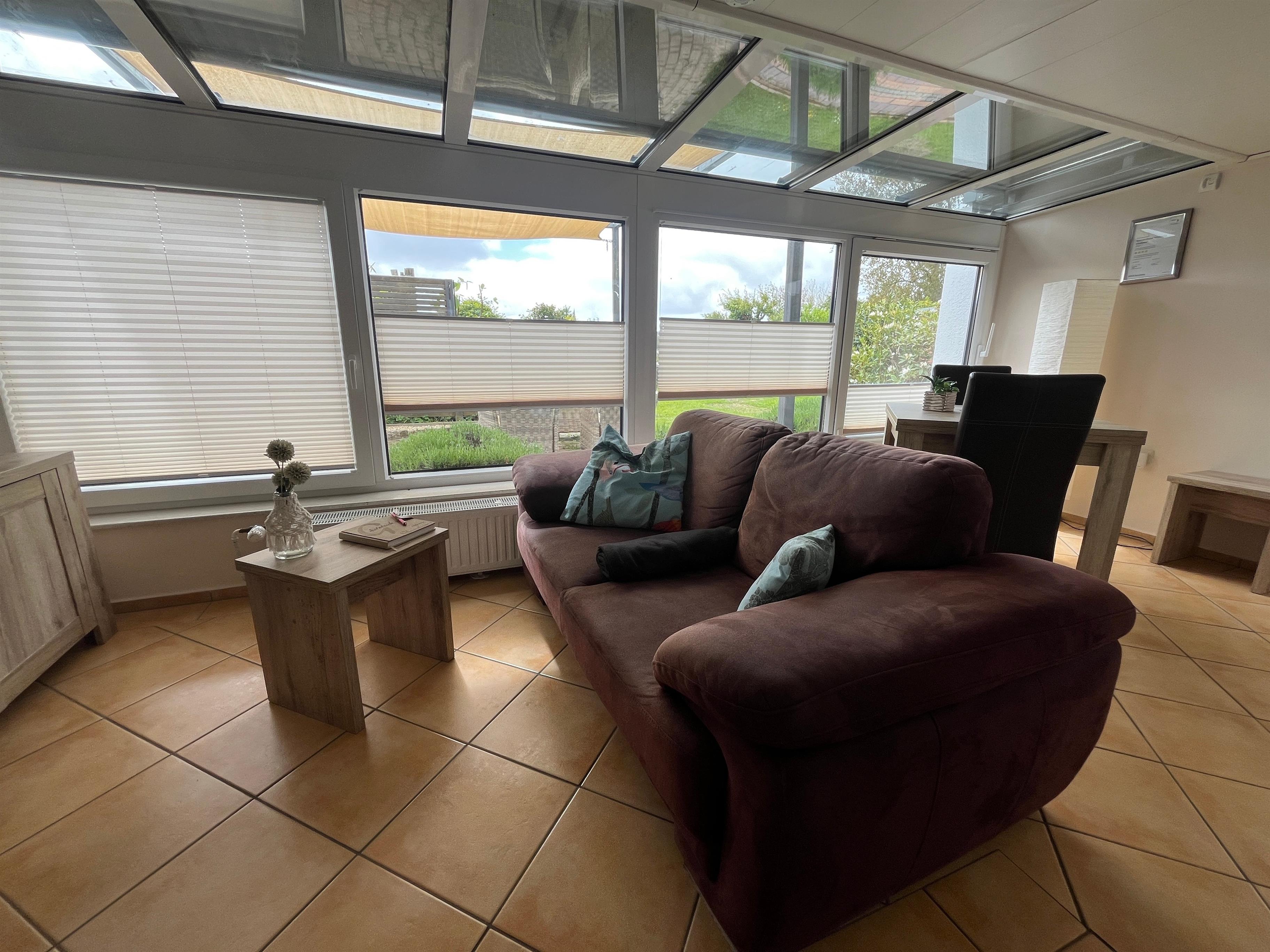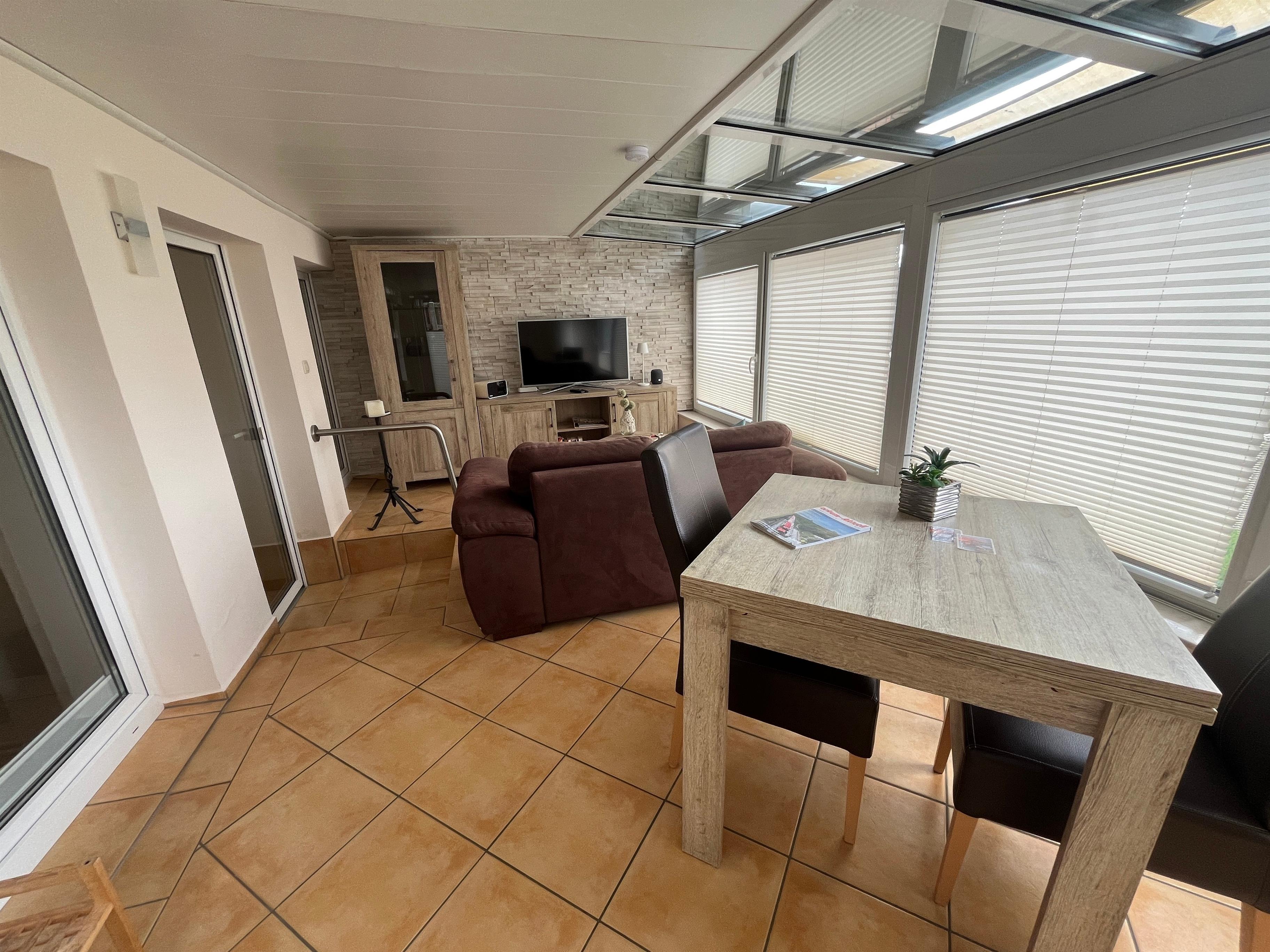 Küche mit Esstisch (E-Herd, Mikrowelle, Backofen, Geschirrspülmaschine, Kühlschrank, Toaster, Kaffeemaschine, Wasserkoche etc.), Wintergarten mit Esstisch und Sofa sowie TV-Flachbildschirm, 1 Bad mit Dusche.