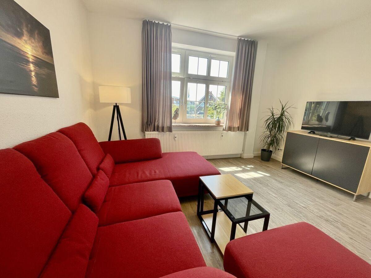 Gemütliche Ferienwohnung im renovierten Admiralshaus mit großem Gartenblick auf Borkum, ideal für erholsame Tage zu zweit.