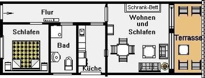 Im Wohnbereich stehen Ihnen ein TV Gerät für gemütliche Filmabende parat, sowie ein Radio und ein Kassettenrekorder. W-Lan ist natürlich auch vorhanden. Hier finden Sie für zwei weitere Personen zwei ausklappbare Schrankbetten, die sich leicht am Abend umfunktionieren lassen.