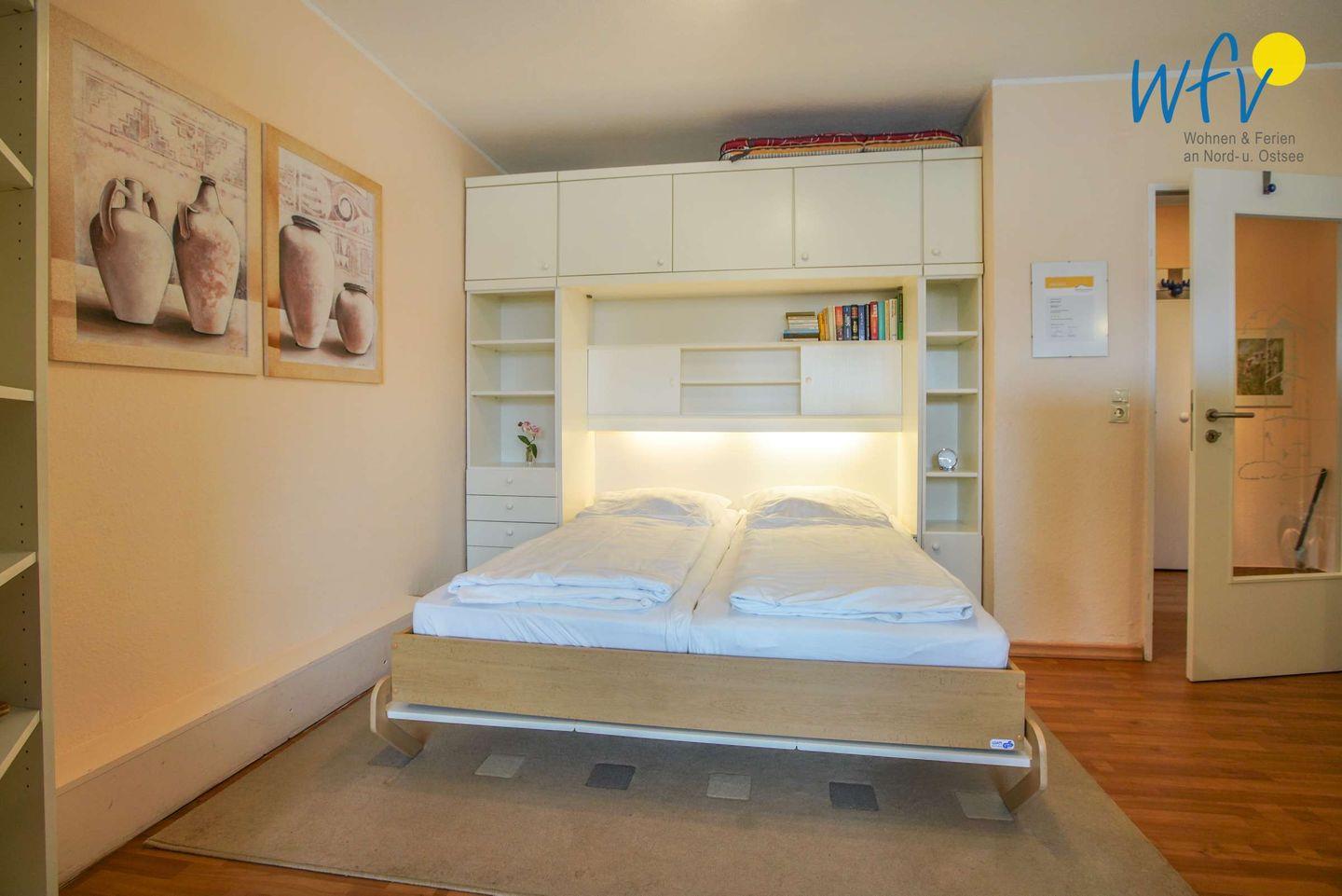 Schlafmöglichkeiten bestehen durch ein ausklappbares Schrankbett im Wohnbereich. Hier haben zwei Personen Platz. Für ein Kind ist ein Kinderbett vorhanden.