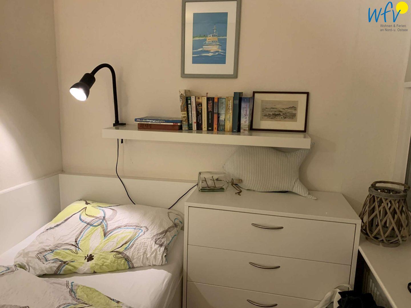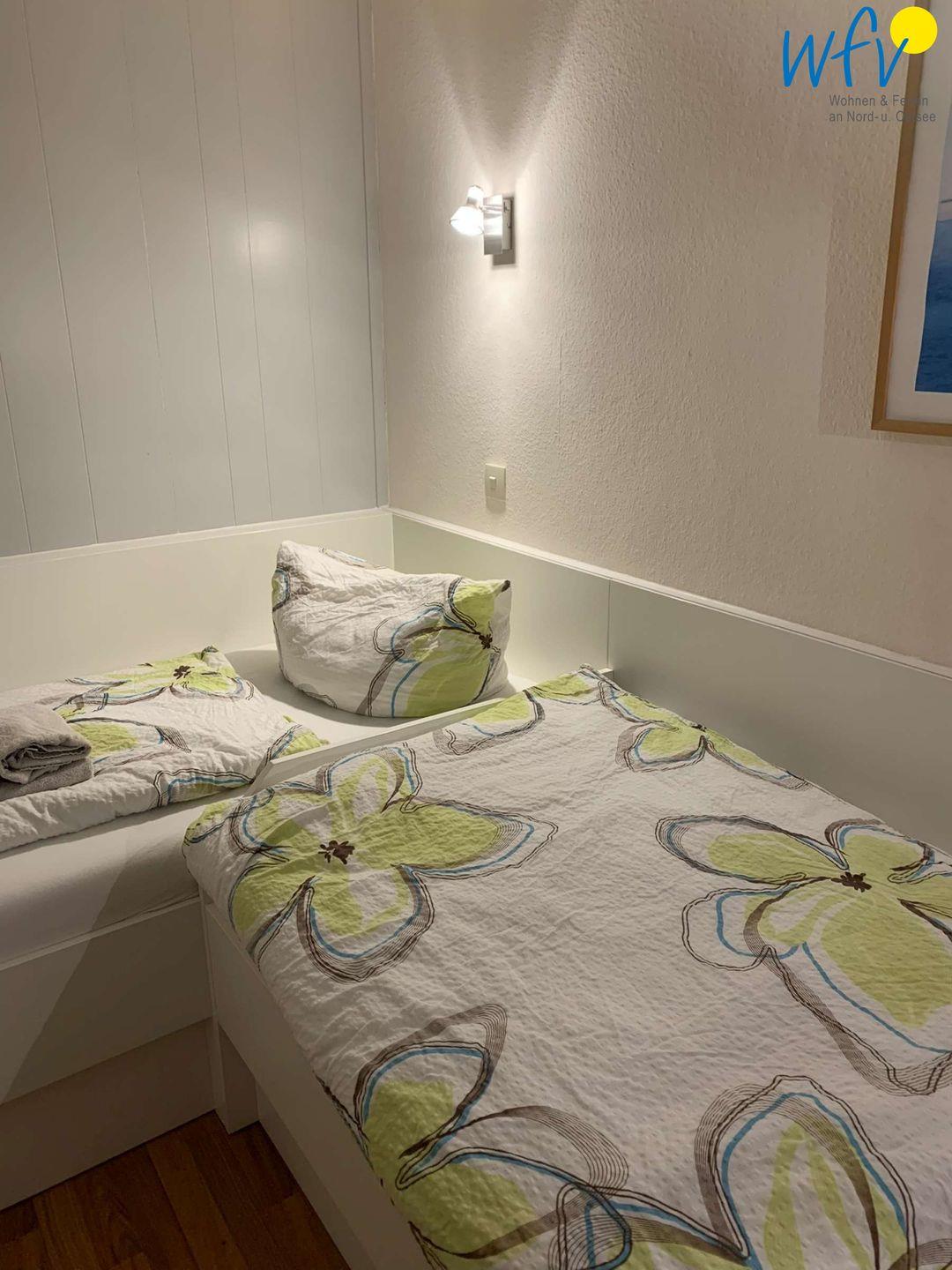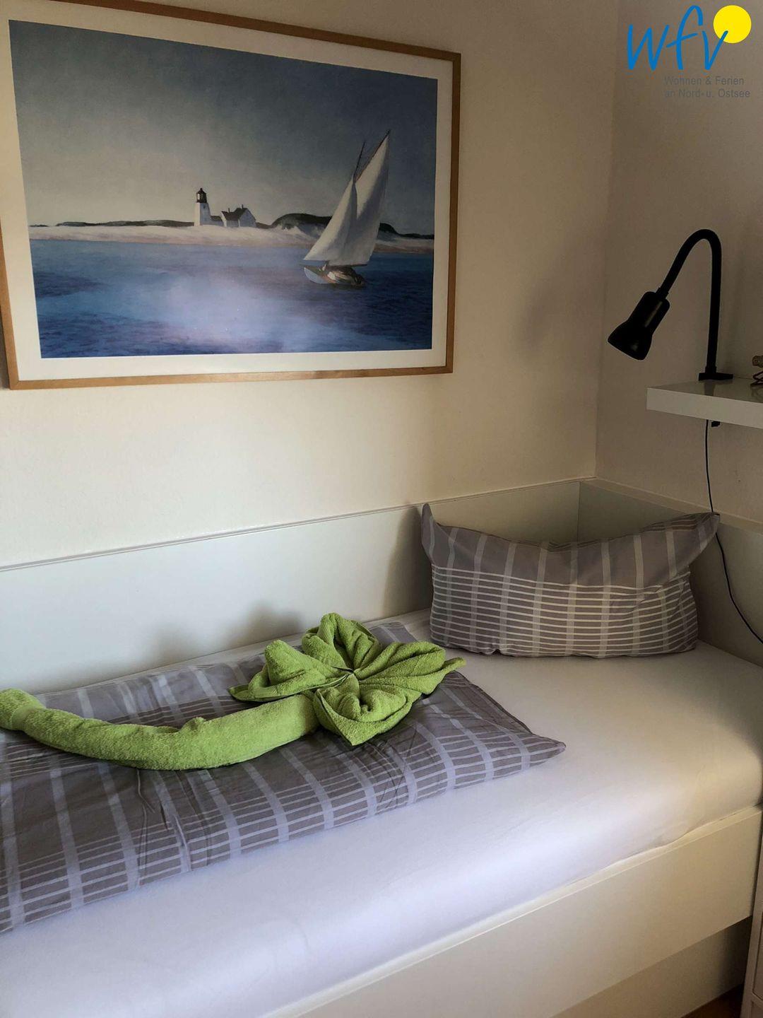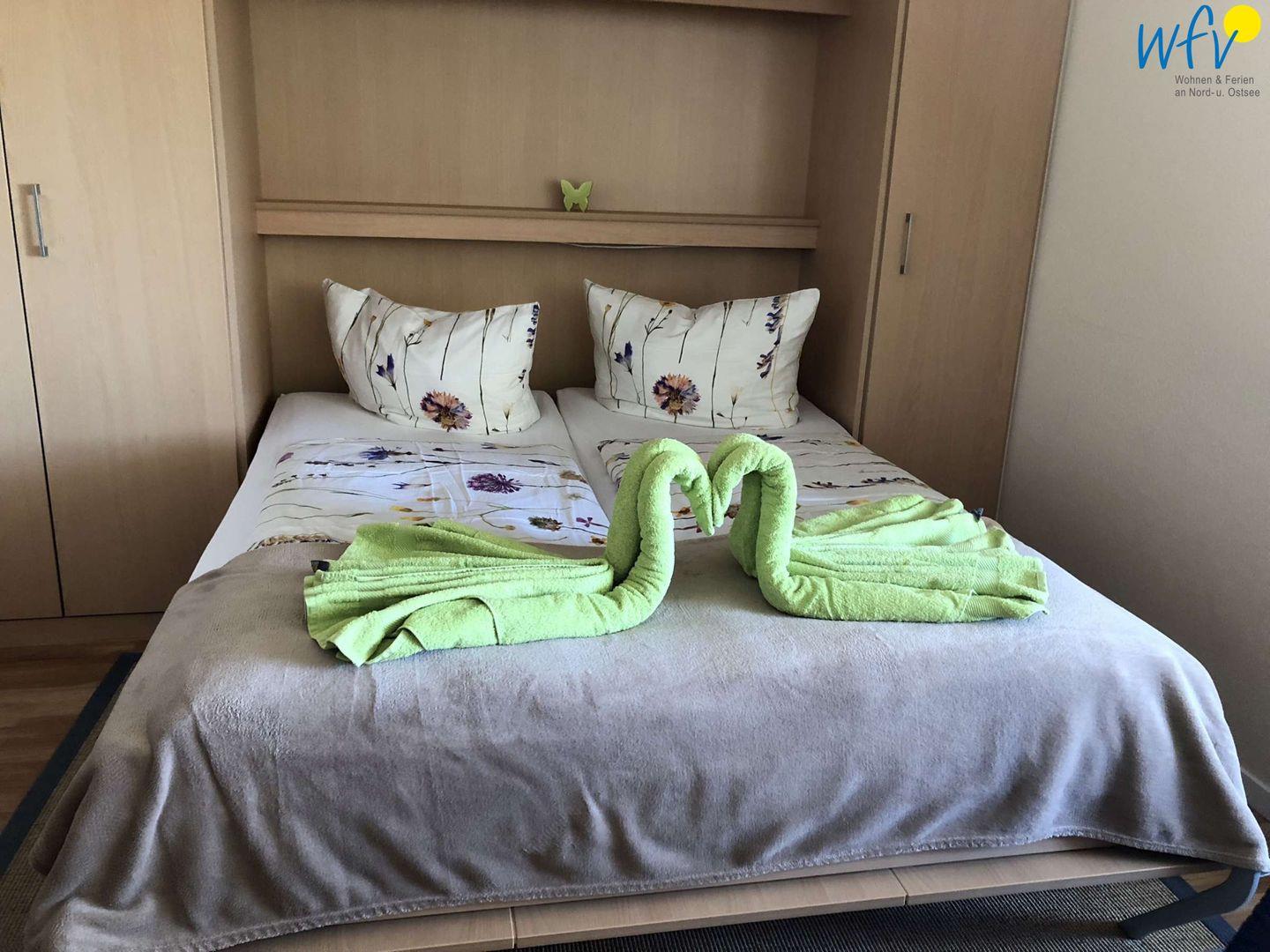 Das separate Schlafzimmer der Ferienwohnung auf Borkum ist mit einem Doppelbett (Matratzen je 90 x 200 cm) ausgestattet. Schlafmöglichkeiten für zwei weitere Personen bestehen durch ein leicht ausklappbares Doppelschrankbett im Wohnzimmer.