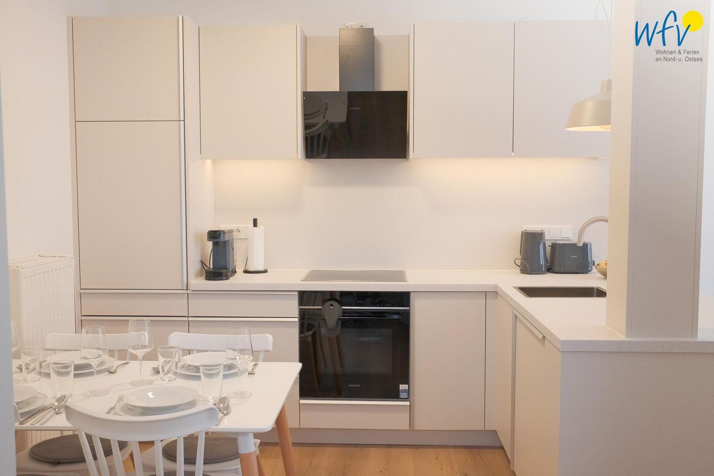 Im Wohnraum lädt ein Esstisch zum ausgiebigen Ferienfrühstück ein, das Sie bequem in der modernen Küche zubereiten können - u.a. mit hochwertigen Geräten wie Induktionsherd, Backofen und Spülmaschine. Kaffeeliebhaber haben die Wahl zwischen einer Filtermaschine und einem Vollautomaten - perfekt für den ersten entspannten Morgenkaffee am gemütlichen Küchentresen.