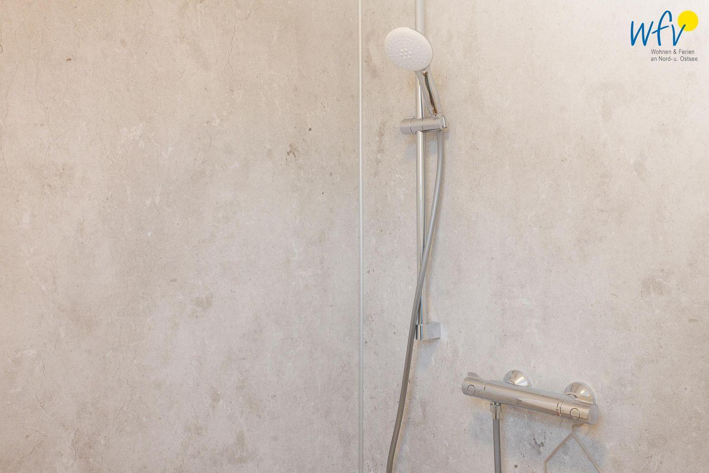 Das elegante Tageslichtbad mit Dusche ergänzt den den Wohnkomfort.