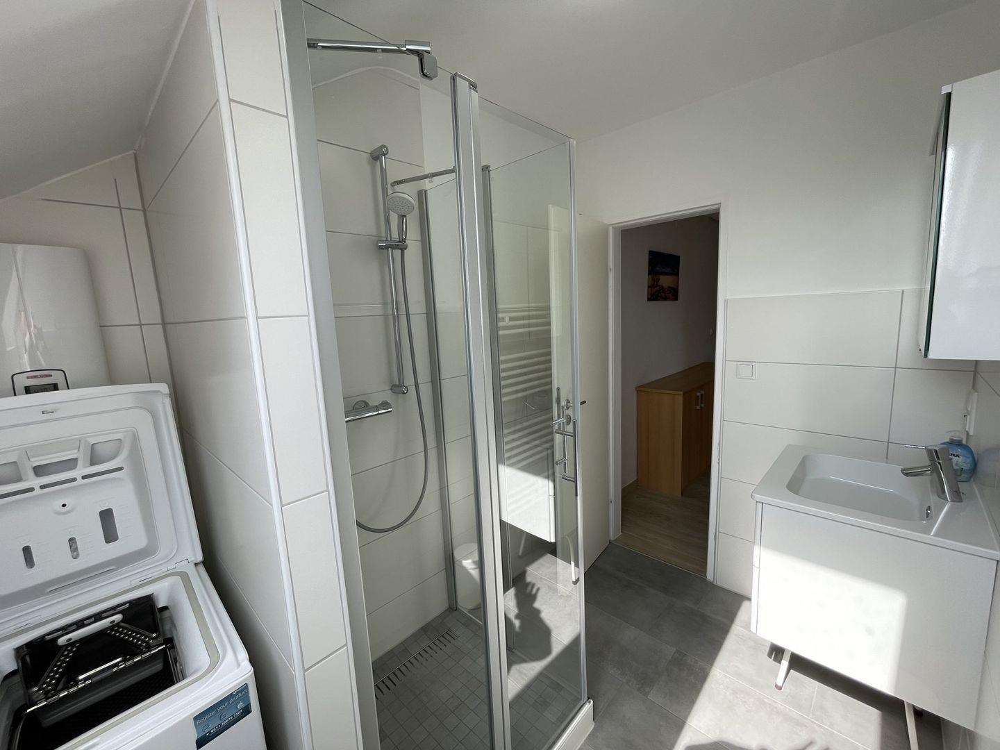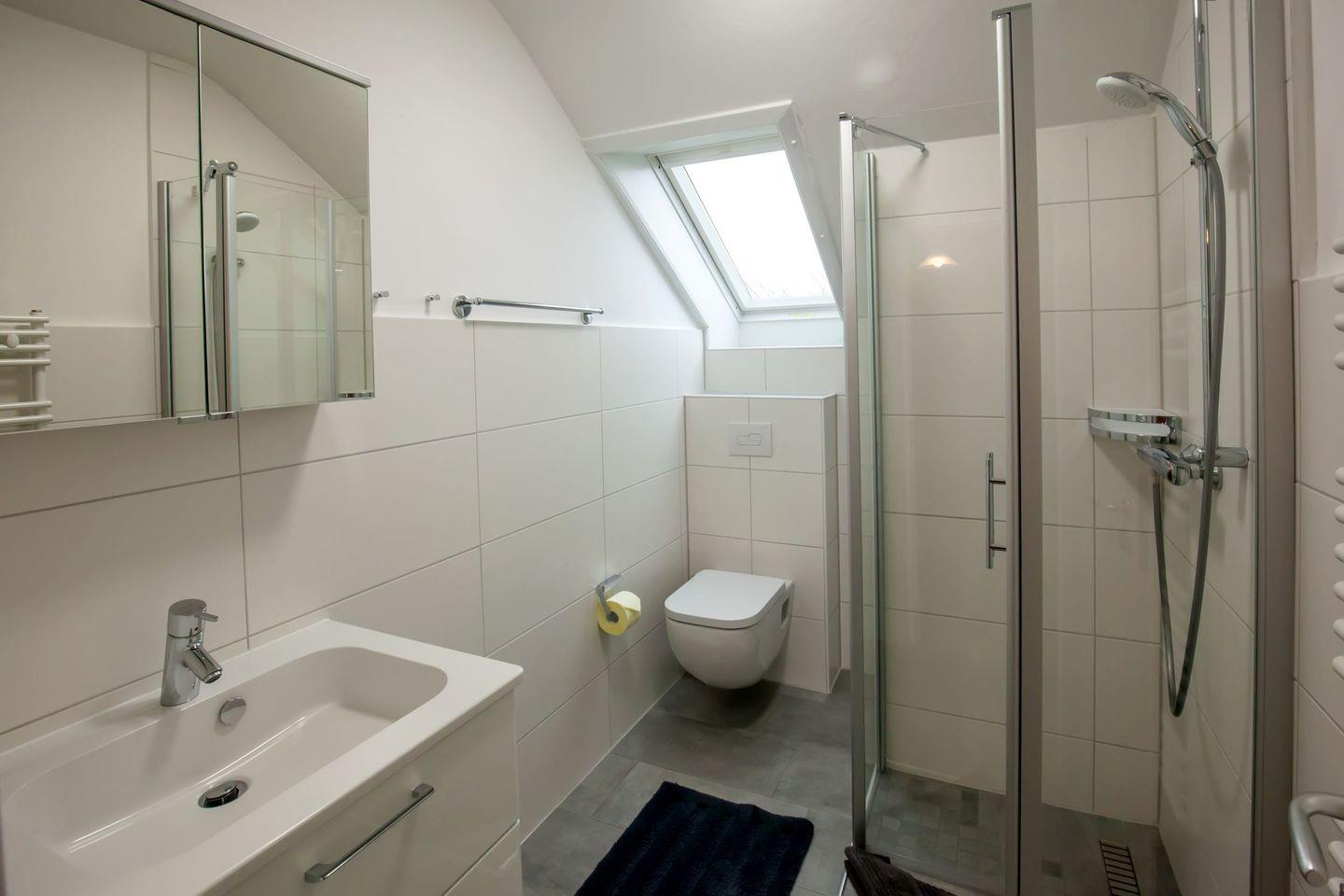 Das Badezimmer in der Dünenkoje Ost ist funktional und komfortabel und ist mit einer Dusche ausgestattet. Ein Haartrockner, Kosmetikspiegel und weitere Annehmlichkeiten stehen Ihnen ebenfalls zur Verfügung. Frische Handtücher und Bettwäsche sind inklusive, sodass Sie Ihren Aufenthalt sofort genießen können.