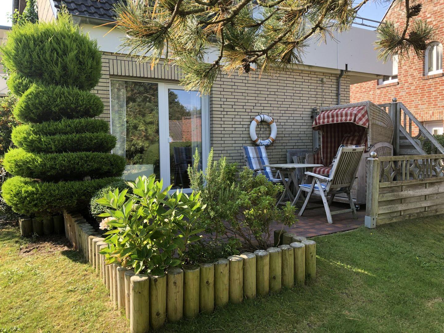 Eine besondere Bereicherung ist die private Terrasse, die mit Gartenmöbeln und einem Strandkorb ausgestattet ist. Hier können Sie die frische Nordseeluft und den Blick in den Garten genießen. Der Außenbereich bietet genug Platz für Kinder zum Spielen und für Erwachsene zum Entspannen. Ein Gartenblick sorgt für eine ruhige und gemütliche Atmosphäre.
