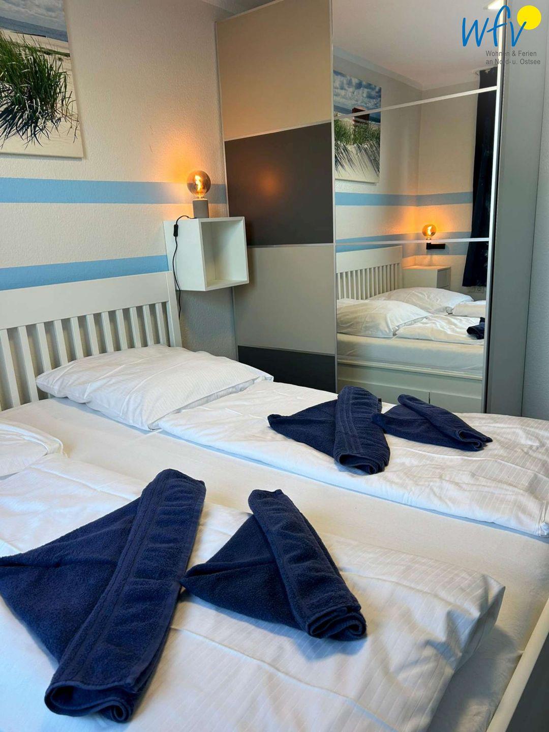 Schlafmöglichkeiten bestehen durch eine Schlafcouch im Wohnraum (140 cm x 200 cm) sowie durch ein Doppelbett im separaten Schlafzimmer (2 x 90 cm x 200 cm).