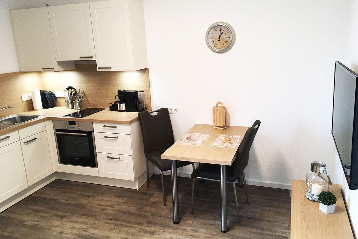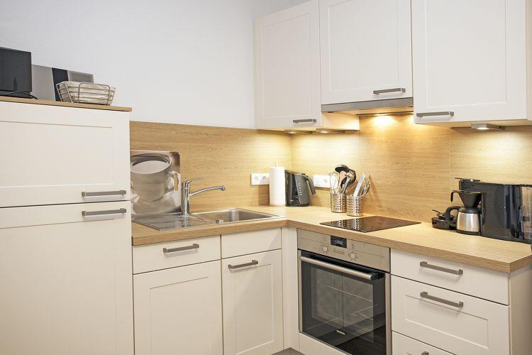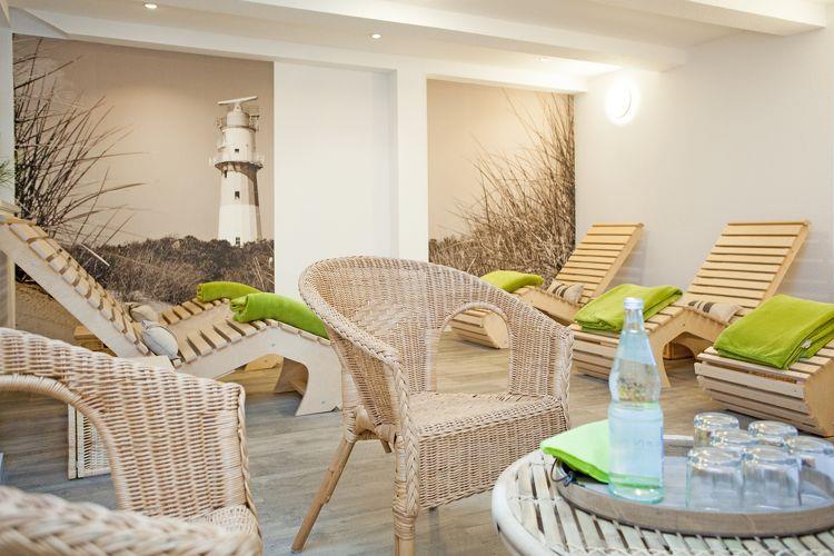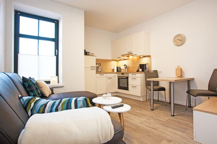 Sie erreichen die Wohnung im Obergeschoss?ganz bequem über eine große Treppe oder einen Fahrstuhl. Der offene Wohnraum mit integrierter Küche?bietet alles für einen schönen Brunch oder ein bequemes Abendessen zu zweit. Das Schlafzimmer ist mit Doppelbett, großem Kleiderschrank und TV-Gerät ausgestattet. Außerdem befindet sich in der gesamten Wohnung eine Fußbodenheizung. Für die kühleren Tage stehen Ihnen im Gebäude ein großzügiger Gemeinschaftssauna Bereich (gegen eine kleine Gebühr) sowie ein erholsamer Ruheraum zur Verfügung. Im Außenbereich gibt es Sitzmöglichkeiten mit Strandkörben, die von allen Gästen genutzt werden können.