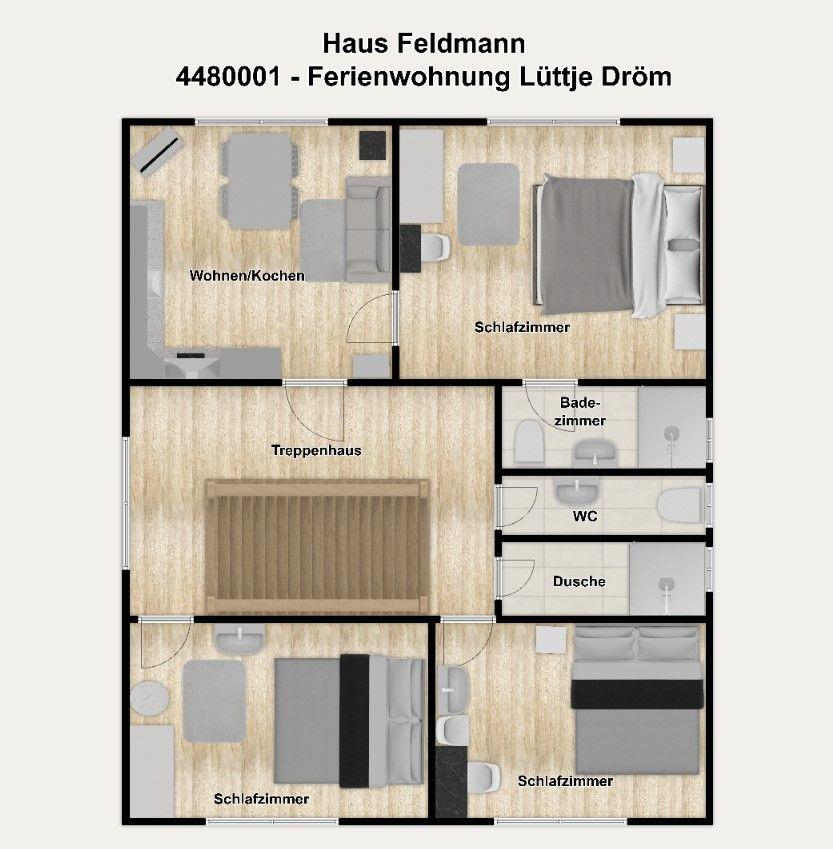 Drei separate Schlafzimmer bieten Ihnen angenehme Rückzugsmöglichkeiten. Ausgestattet sind sie jeweils mit einem Doppelbett (2 x 180 x 200 cm; 1 x 140 x 200 cm). Zwei der Schlafzimmer, ein Gäste-WC und eine separate Dusche befinden sich auf der gleichen Etage außerhalb der Wohnung und sind über einen Übergangsflur erreichbar, der gemeinsam mit der oberen Wohnung genutzt wird.