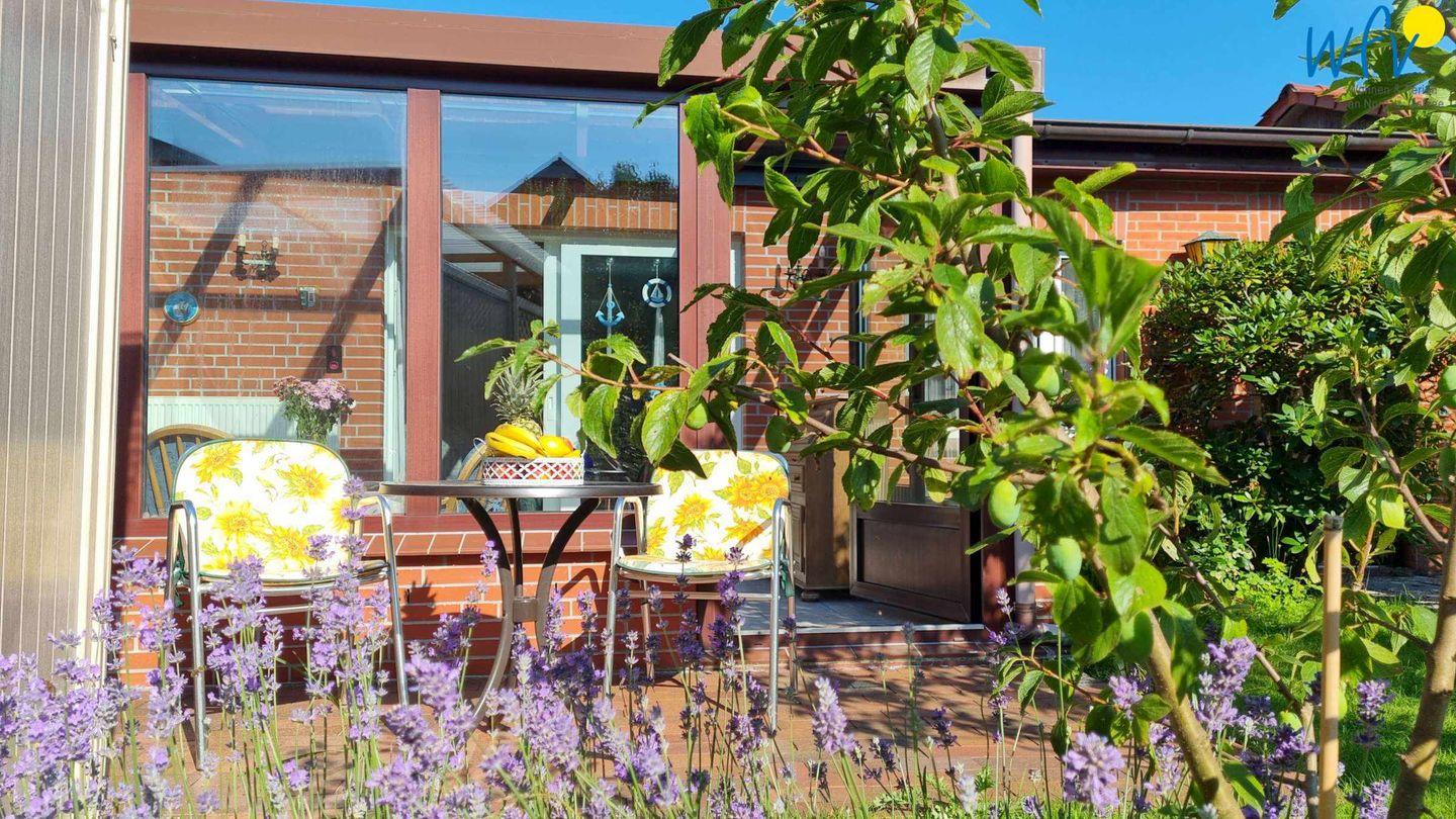 Gemütlicher Bungalow mit Wintergarten, Terrasse und Liegewiese auf Borkum für erholsame Urlaubstage zu zweit.