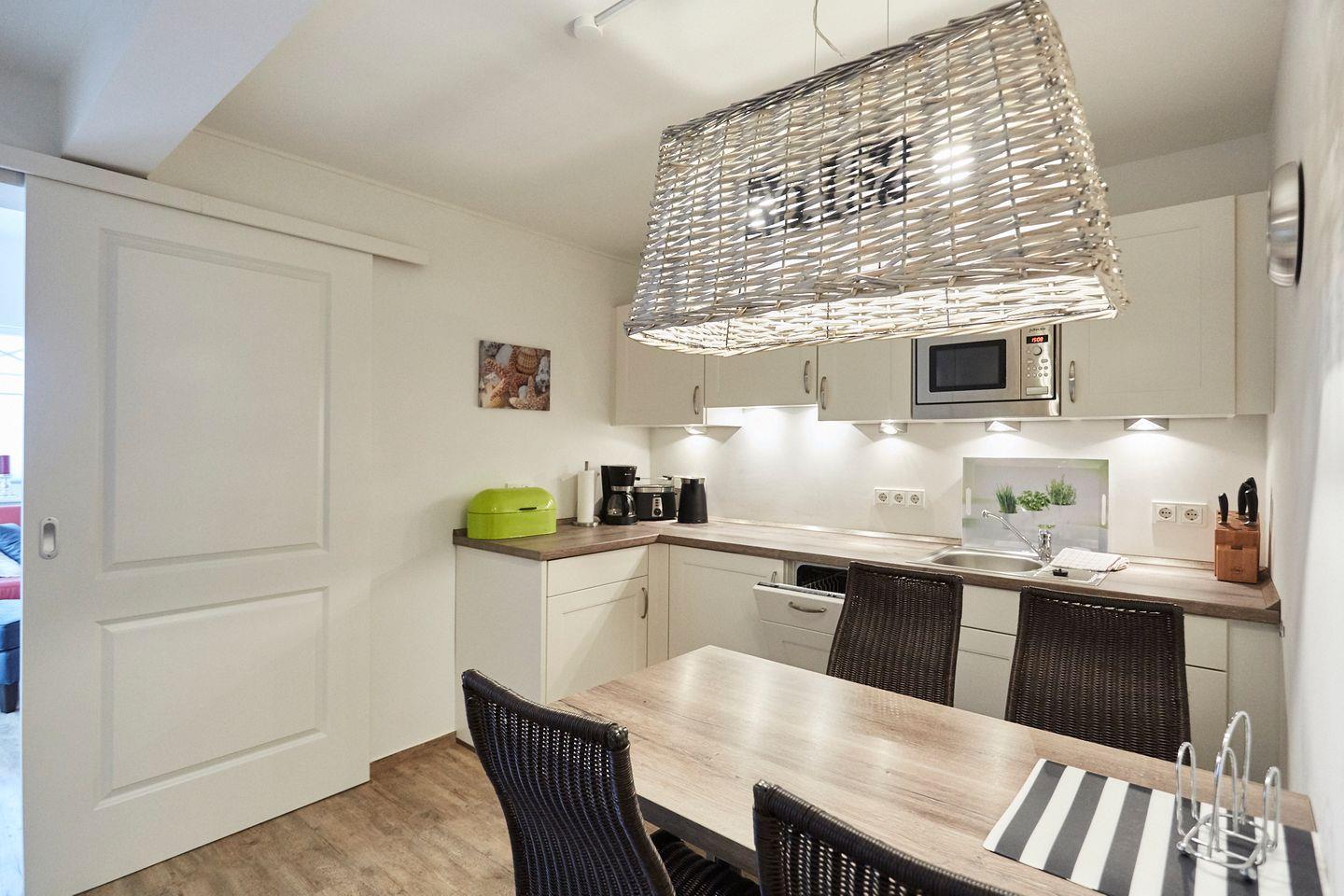 Die modern ausgestattete Ferienwohnung bietet einen großzügigen Wohnbereich mit Zugang zur Terrasse. Das große Schlafzimmer verfügt über ein komfortables Boxspringbett, das elektrisch verstellbar ist. Das zweite, etwas kleinere Schlafzimmer bietet zwei Einzel-Boxspringbetten. Zwei Duschbadezimmer bieten ausreichend Komfort. Die funktionale Teeküche ist mit Wasserkocher, Toaster, Kaffeemaschine, Spülmaschine und weiteren Annehmlichkeiten ausgestattet. Eine große Gemeinschaftsküche im Erdgeschoss des Hauses bietet zudem umfangreichere Kochmöglichkeiten mit Herd und Backofen. Fahrradabstellmöglichkeiten befinden sich im kleinen Innenhof rechts vom Haus, von dort aus gelangt man außerdem in das Waschhaus mit Waschmaschine und Trockner gegen Gebühr.