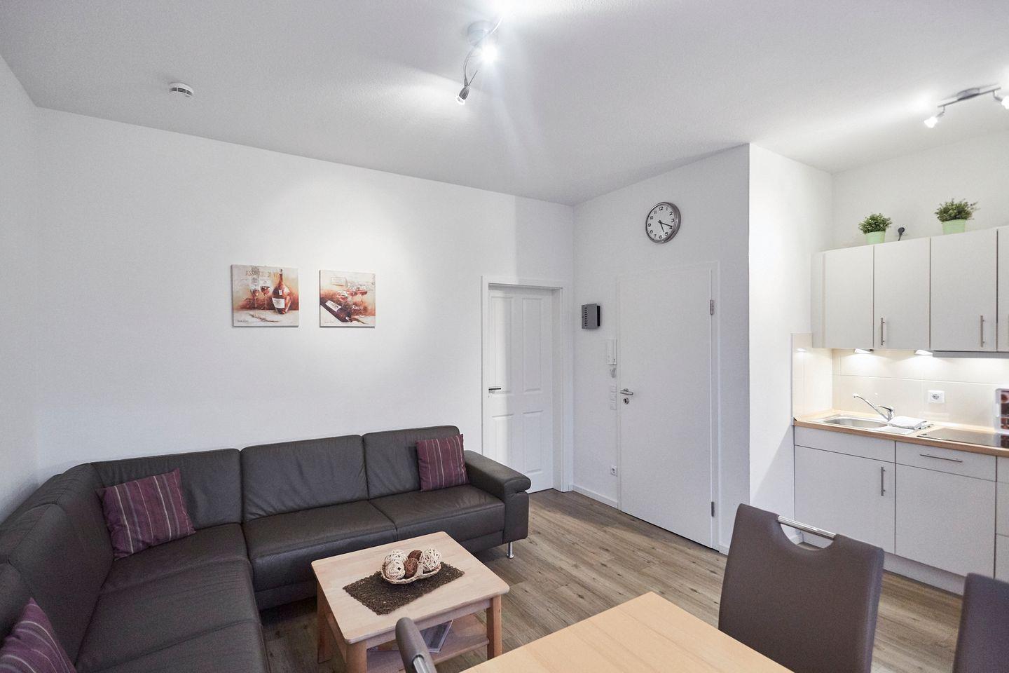 Die Wohnung erstreckt sich über den ersten Stock und ist geschmackvoll eingerichtet. Bei Betreten der Ferienwohnung werden Sie von einem einladenden Wohnzimmer empfangen, das mit einem bequemen Sofa und einem digitalen Fernseher ausgestattet ist – perfekt für entspannte Abendstunden. Die offene Küche, die zum Wohnbereich hin gestaltet ist, lässt keine Wünsche offen: sie verfügt über moderne Elektrogeräte wie einen Herd mit 4-Platten, Backofen, Kühlschrank mit Gefrierfach, Geschirrspüler und eine Mikrowelle. Hier können Sie Ihre Lieblingsgerichte zubereiten und im Essbereich gemütlich genießen.