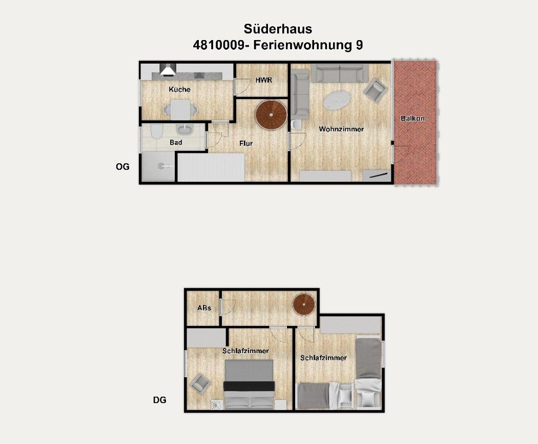 Gemütliche Ferienwohnung 9 im Süderhaus auf Borkum mit Balkon, moderner Ausstattung und privatem Parkplatz für erholsamen Familienurlaub.