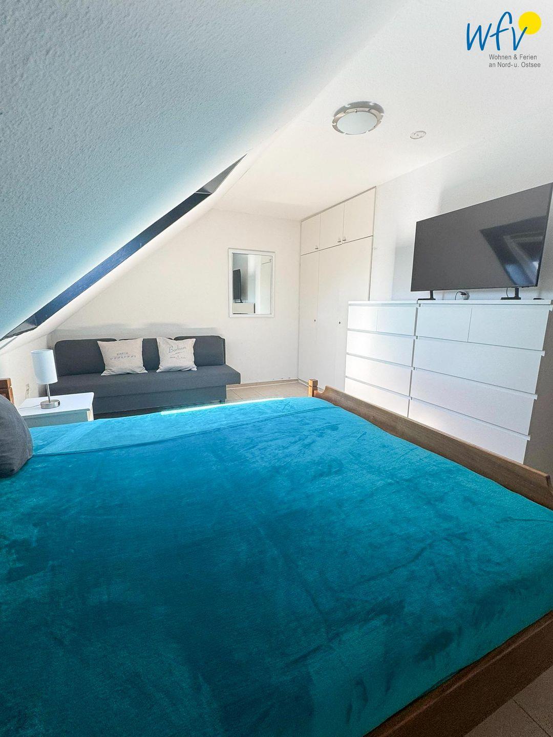 Die zwei separaten Schlafzimmer im DG bieten Ihnen angenehme Rückzugsmöglichkeiten. Das Elternschlafzimmer ist mit einem Doppelbett und einem Sofa als weitere Schlafmöglichkeit ausgestattet, das Kinderzimmer mit zwei Einzelbetten. Die Matratzen besitzen die Maße 90 x 200 cm.