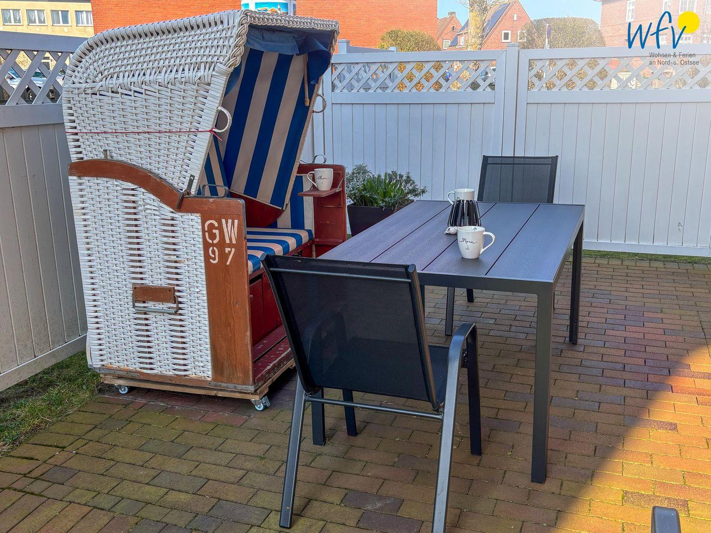 Besonders auf der schönen wohnungseigenen Terrasse können Sie sich rundum erholen und herrliche Sonnenstunden genießen! Im Gemeinschaftsgarten des Hauses „Inseltraum“ sind außerdem gemütliche Grillabende möglich.